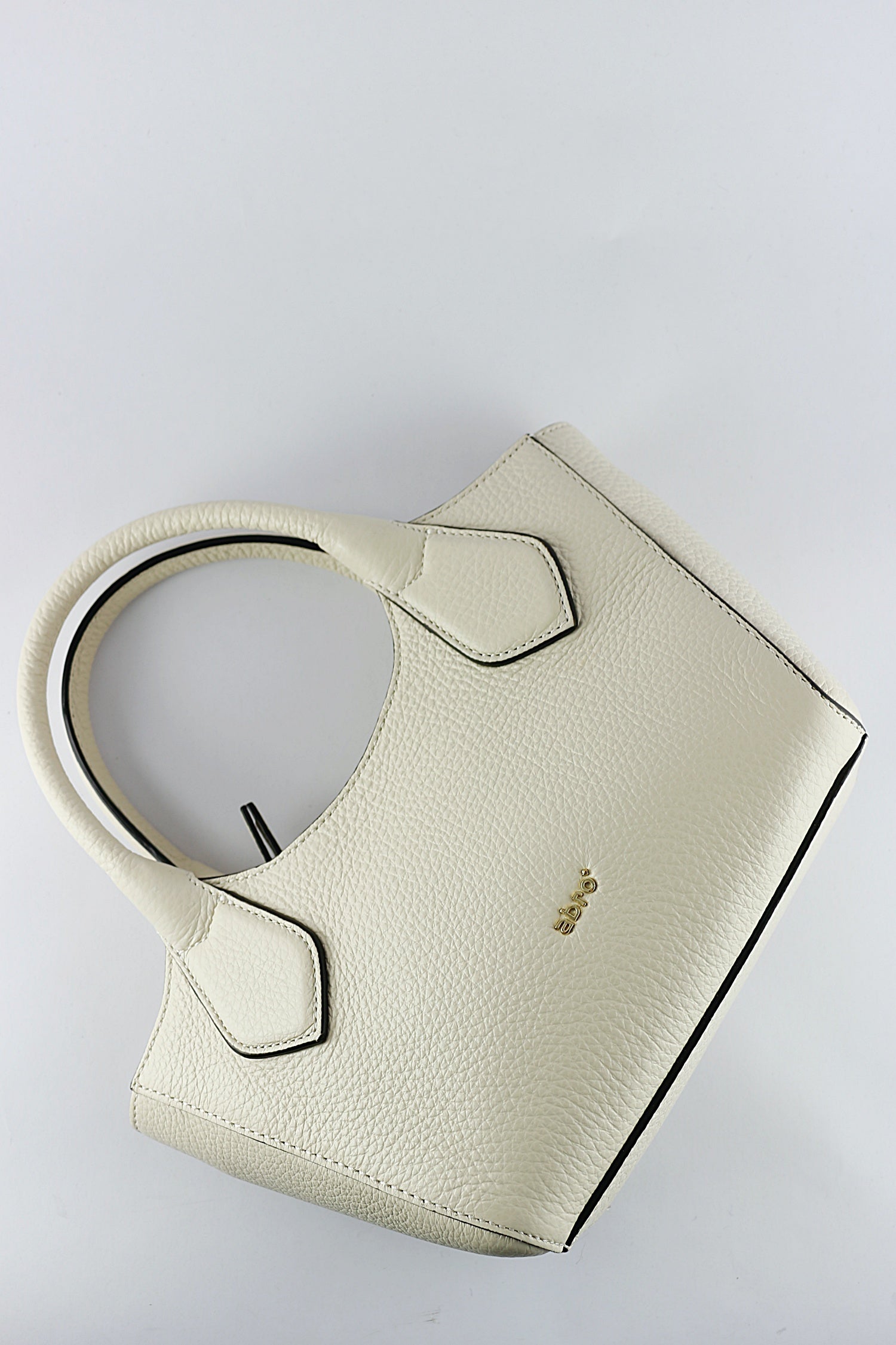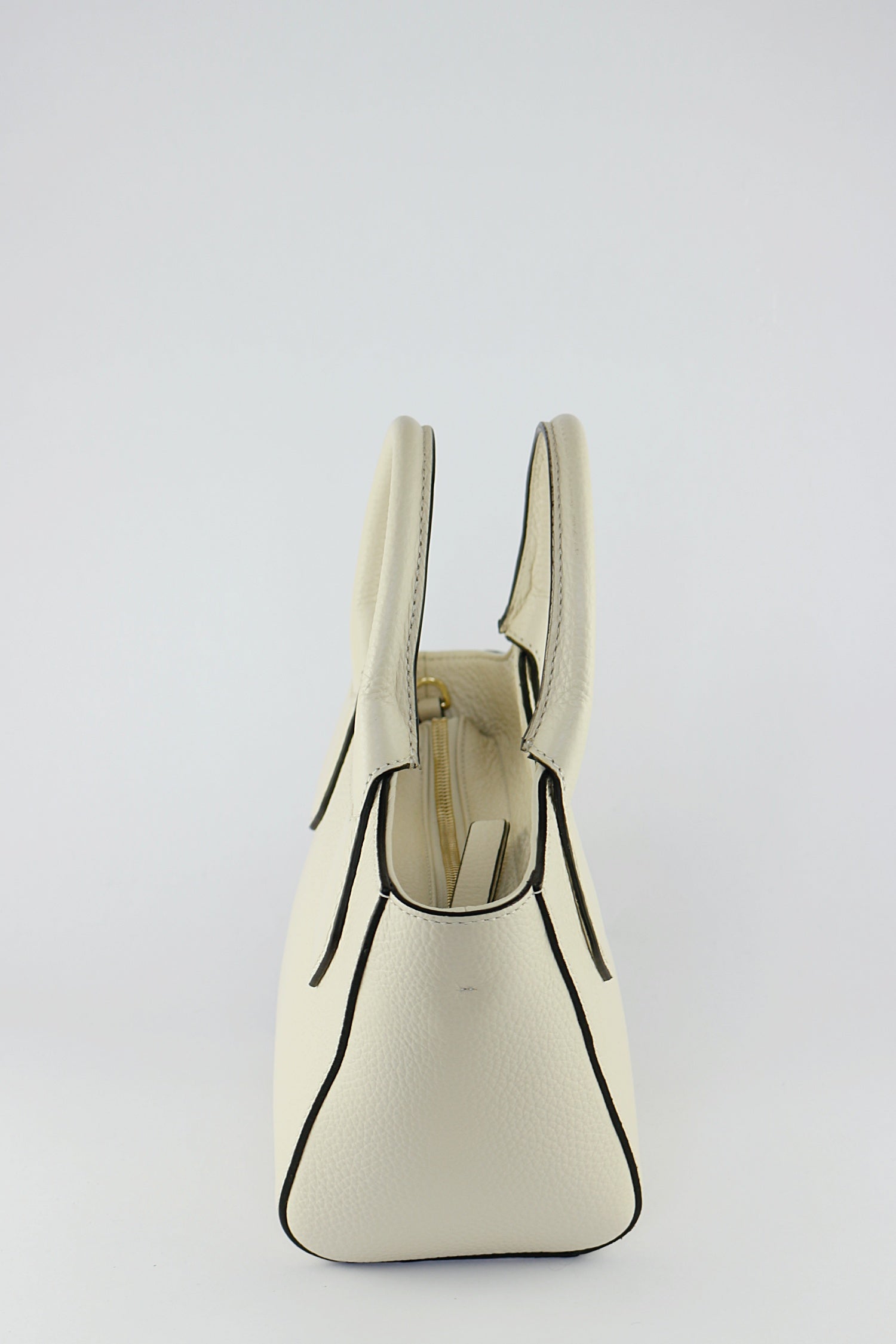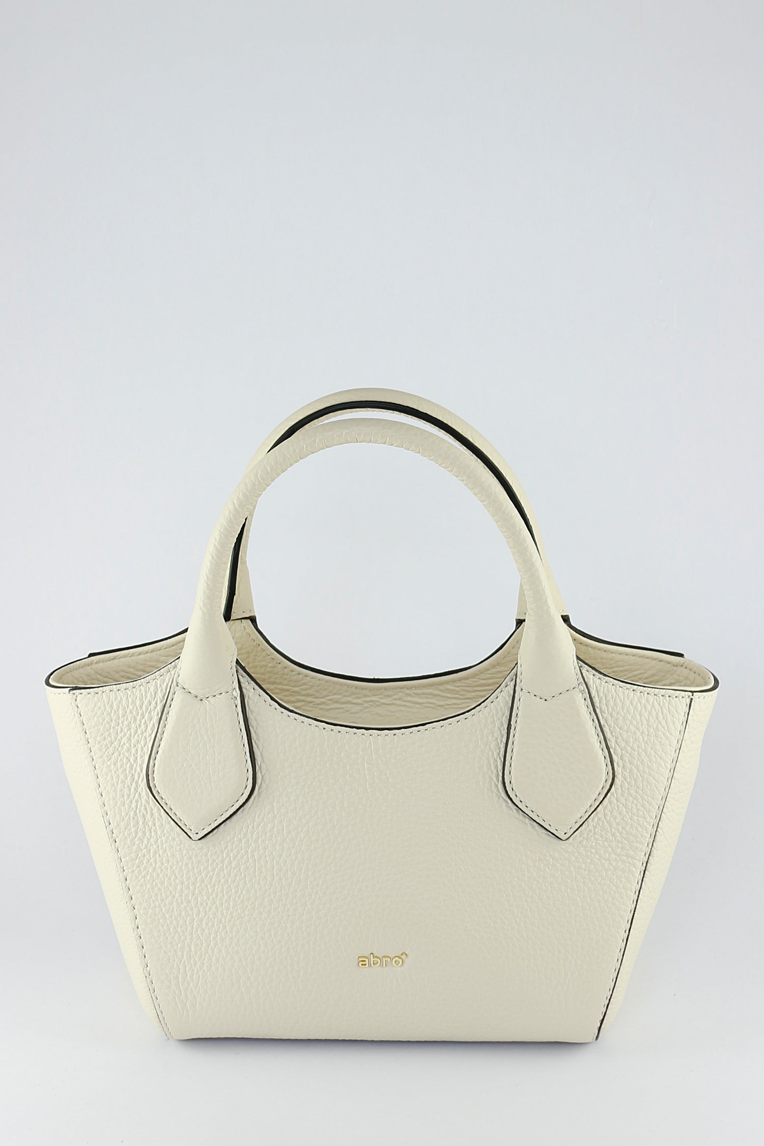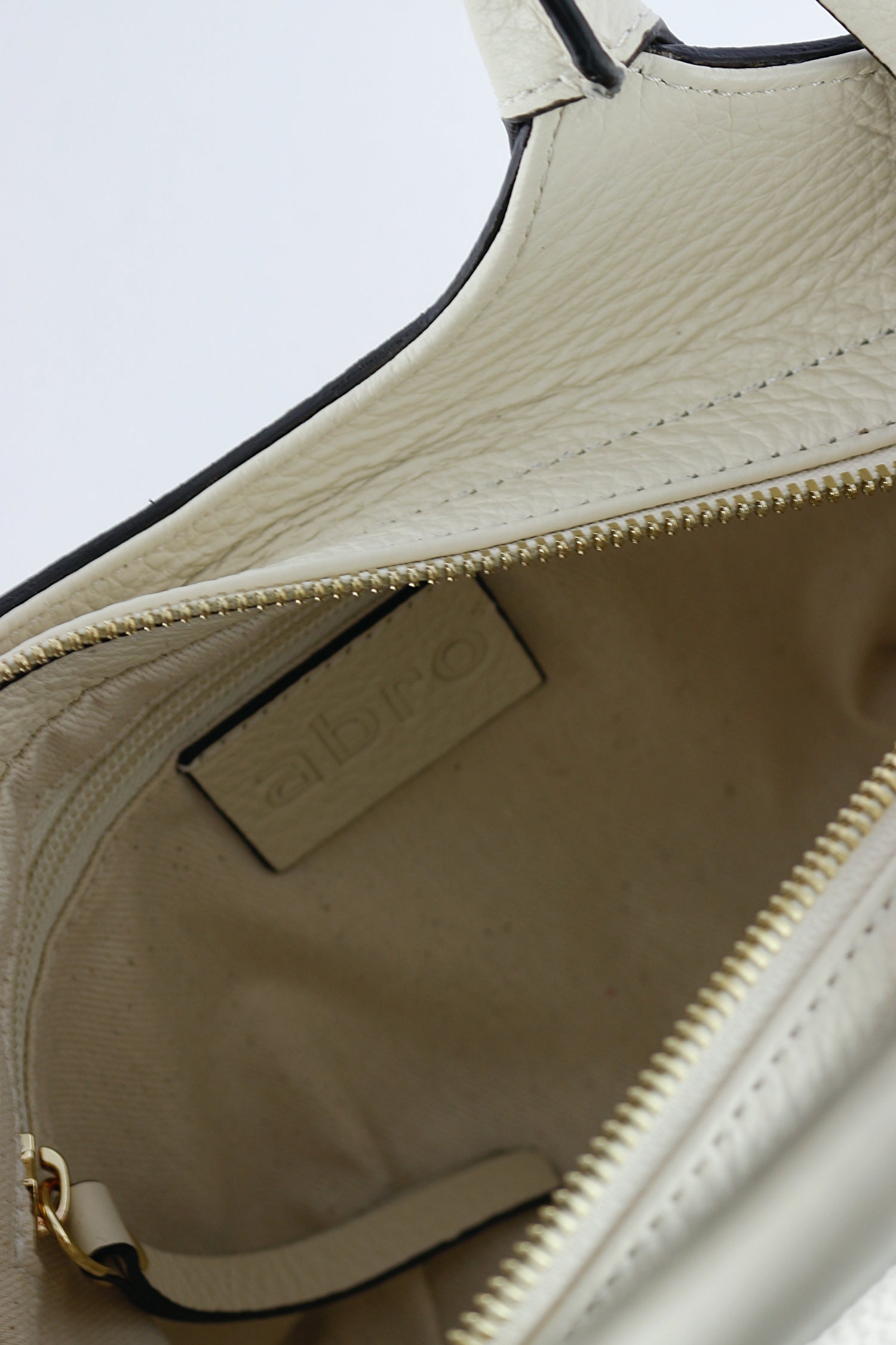 The leather 'Senta' from Abro is a small two-handled bag that can be carried, or worn as a crossbody, using the adjustable and detachable, long leather strap. It has one compartment with a zipped closure and an inside zipped pocket. The hardware is gold. The bag is designated 'beige' but has a fresh, creamy colour.