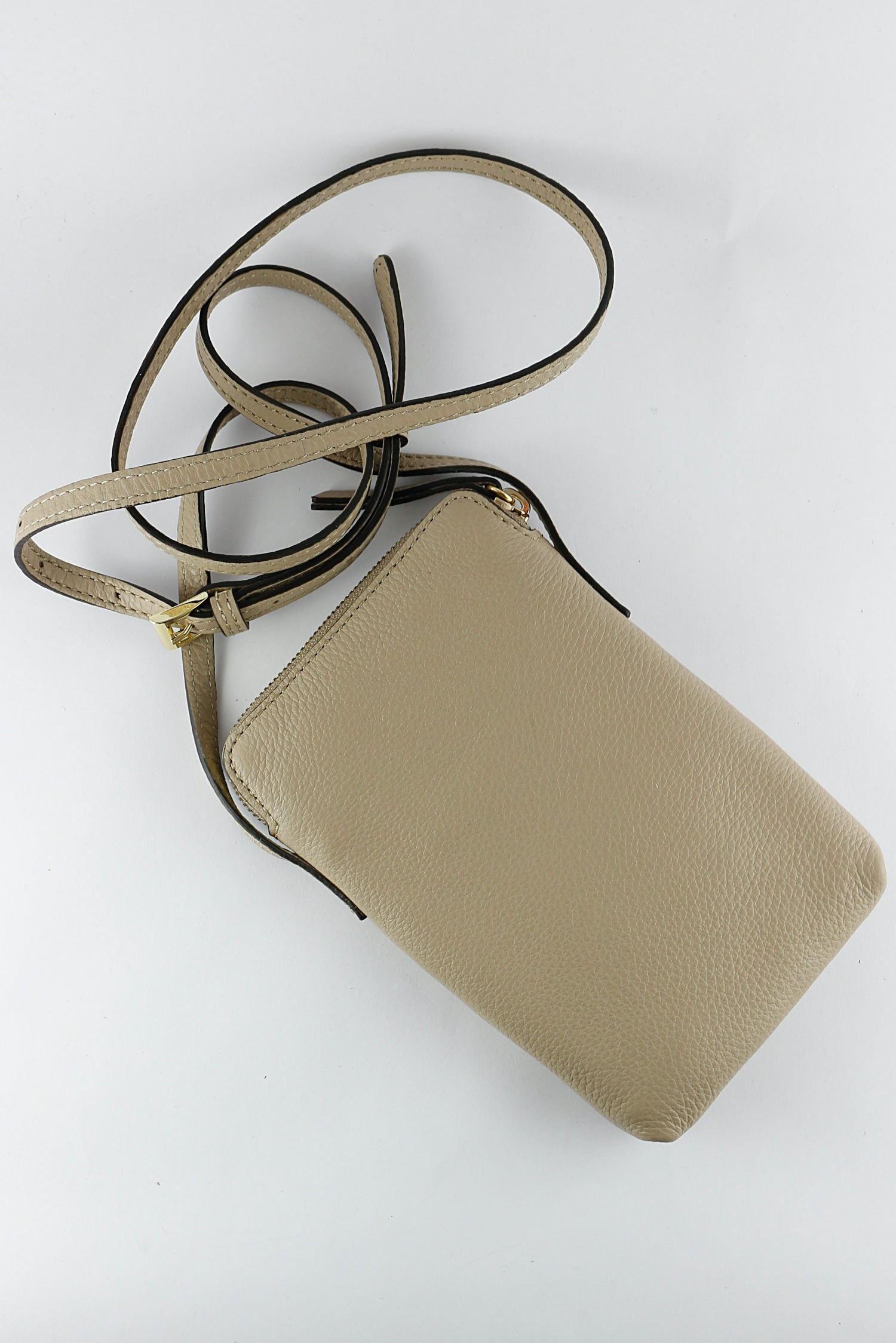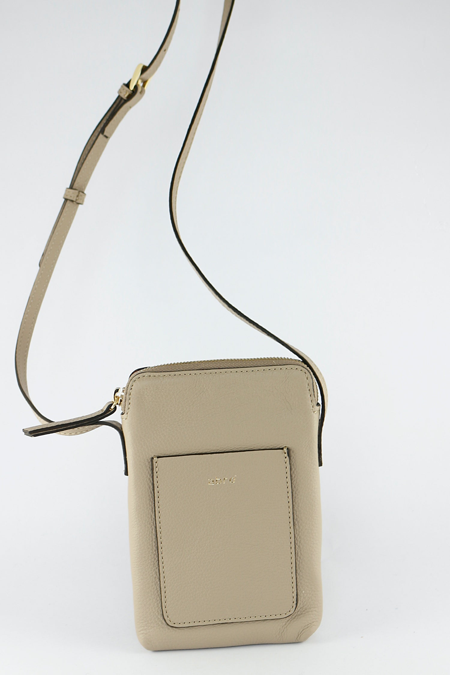Abro 'Raquel' leather phone bag in Siena has gold hardware, a zipped top and an additional front pocket. The long strap is adjustable and can be worn across the body. Inside there are credit card slots. This is the perfect bag to carry your phone and essentials.