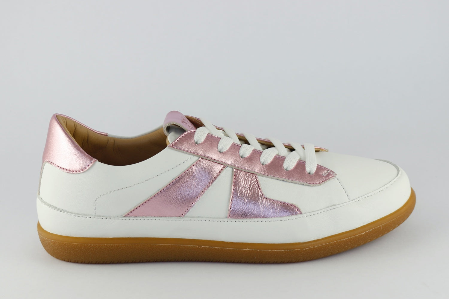 A beautiful low silhouette trainer from Alexandra: a white leather body with metallic pink leather detailing and white laces. Super-soft leather for fantastic comfort, plus leather inners for breathability and a non-slip rubber sole.
