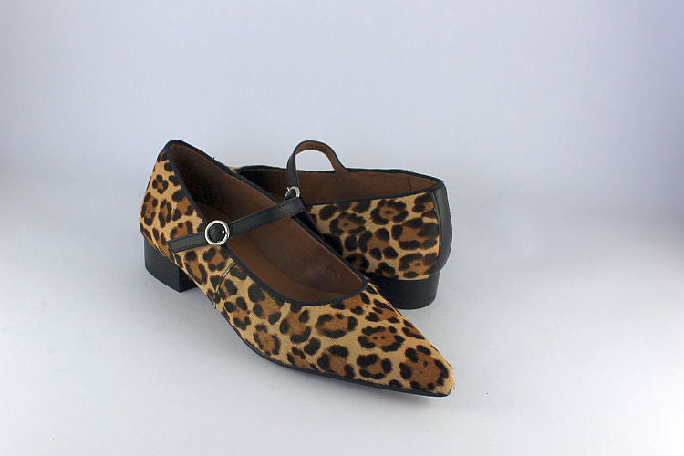 In the classic Mary Jane style, this is a sweet leopard print pointed shoe, leather lined.