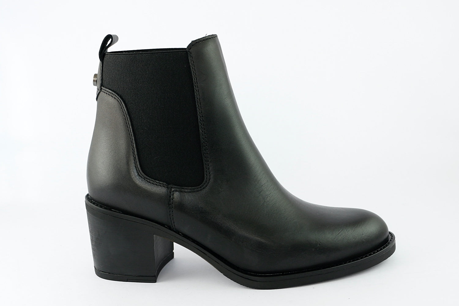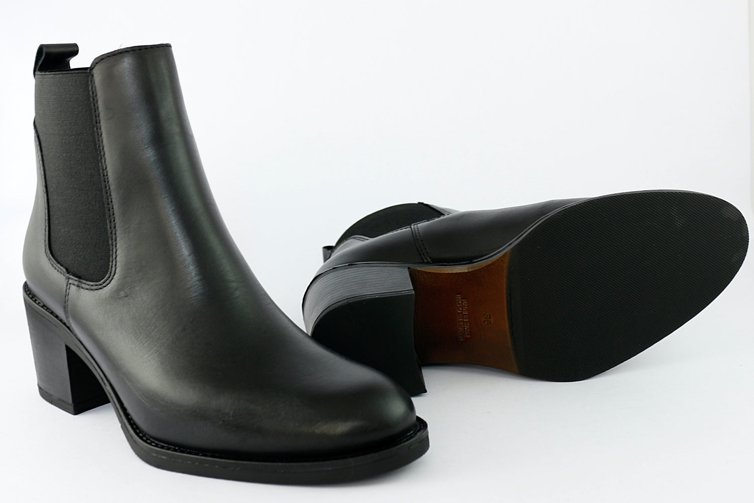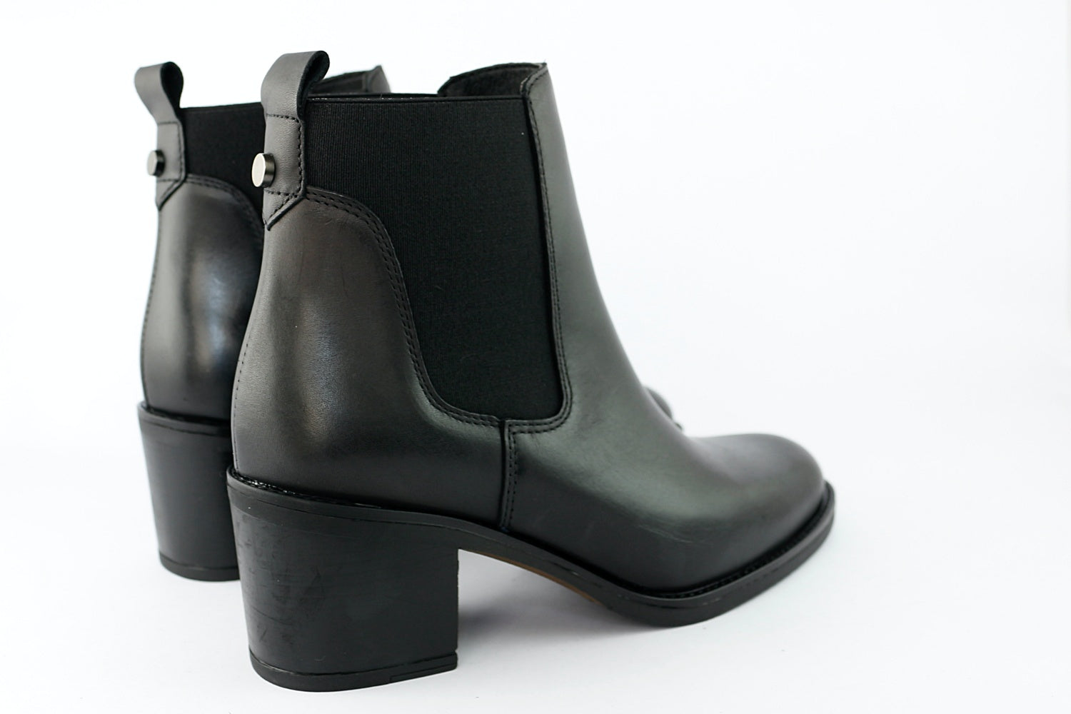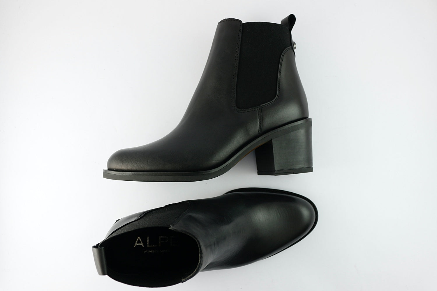 The Alpe 'Anne' is an elegant Black leather ankle boot with a 7.5 cm chunky heel. It is a pull-on boot with side stretch panels and a little silver stud at the back of the boot 's pull-on tab. Leather-lined, with a rubber non-slip sole and heel.