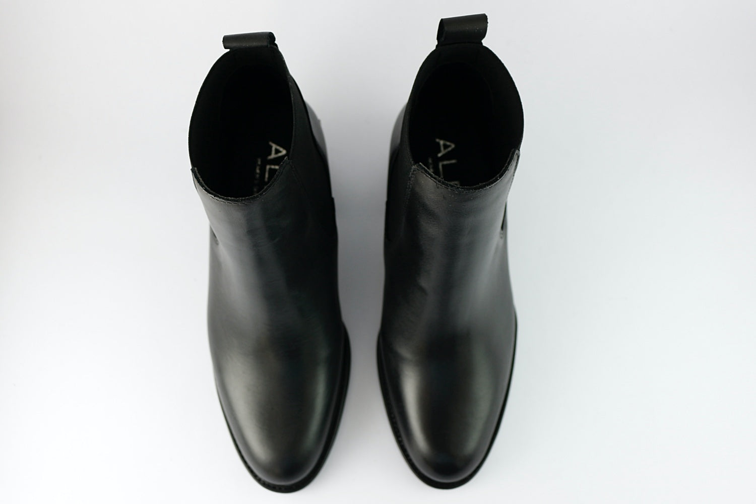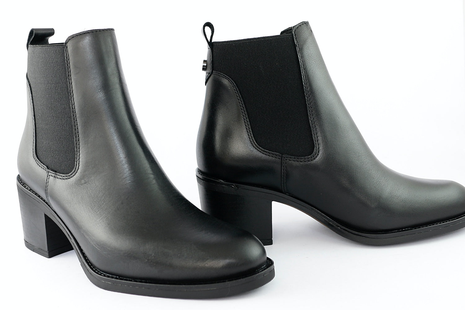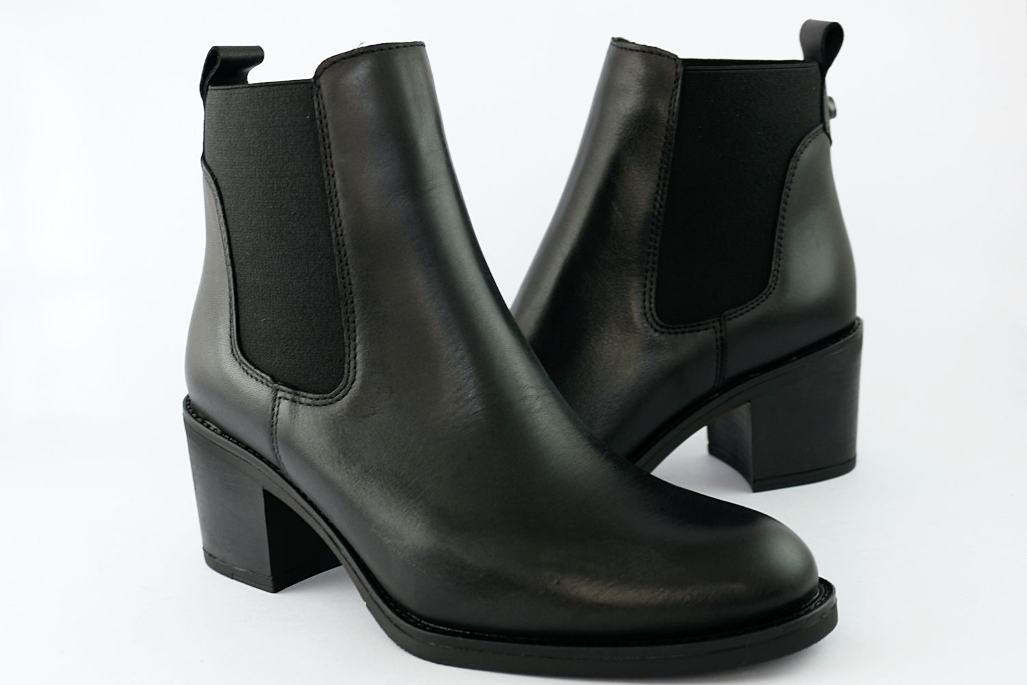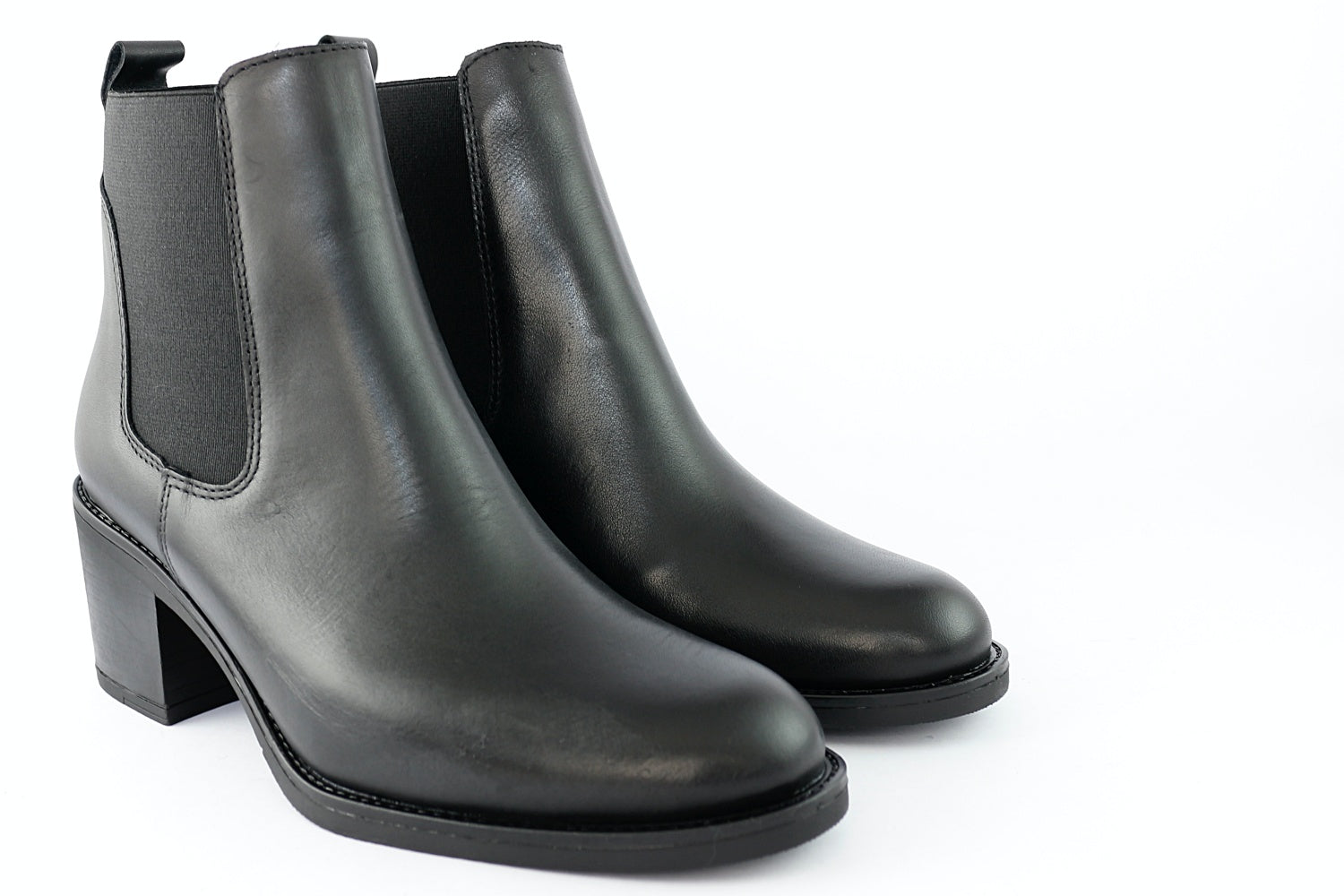 The Alpe 'Anne' is an elegant Black leather ankle boot with a 7.5 cm chunky heel. It is a pull-on boot with side stretch panels and a little silver stud at the back of the boot 's pull-on tab. Leather-lined, with a rubber non-slip sole and heel.