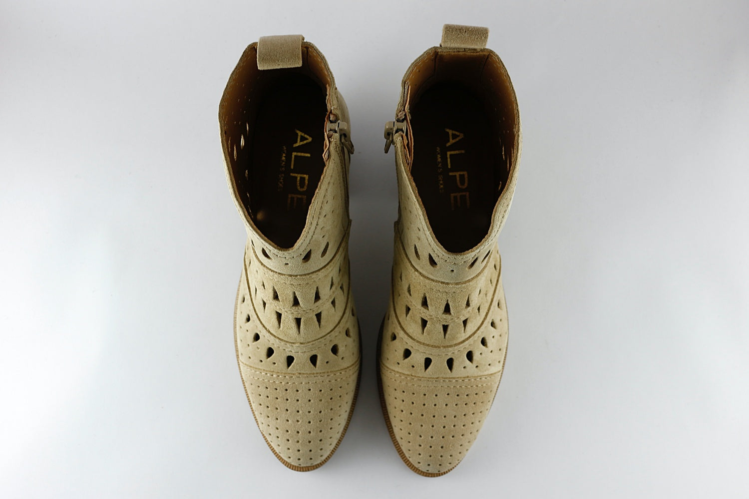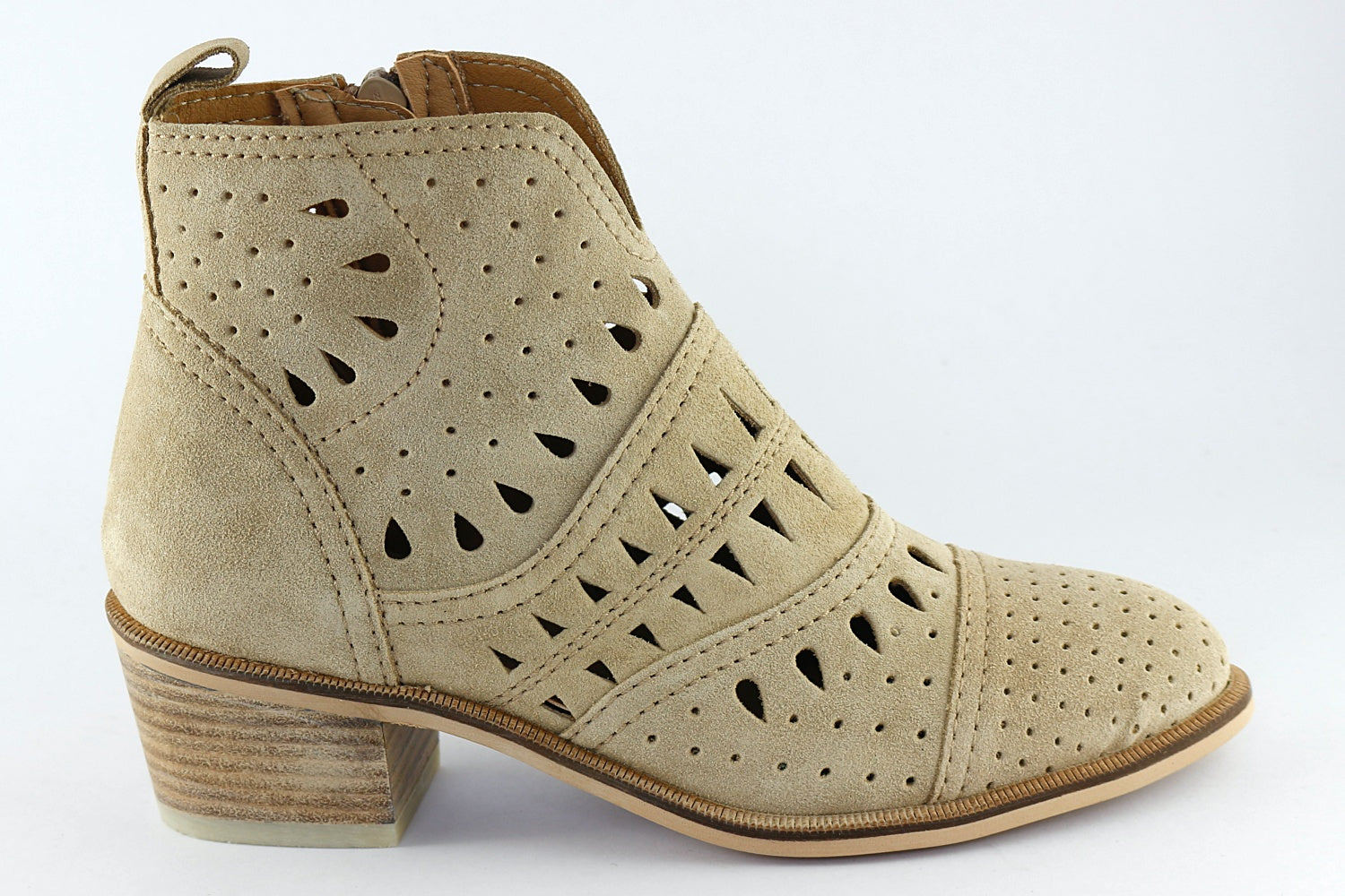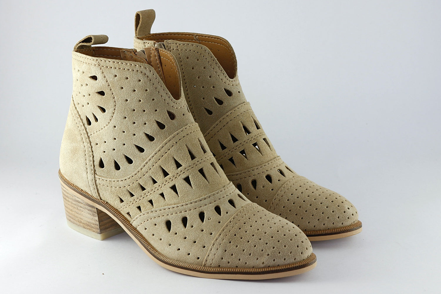 Alpe's 'Nelly' suede summer ankle boot is beautiful with jeans or a dress. The cut-out boot is a soft sand suede with an almond toe and inside zip. Leather-lined and rubber-bottomed heel (5cm high).