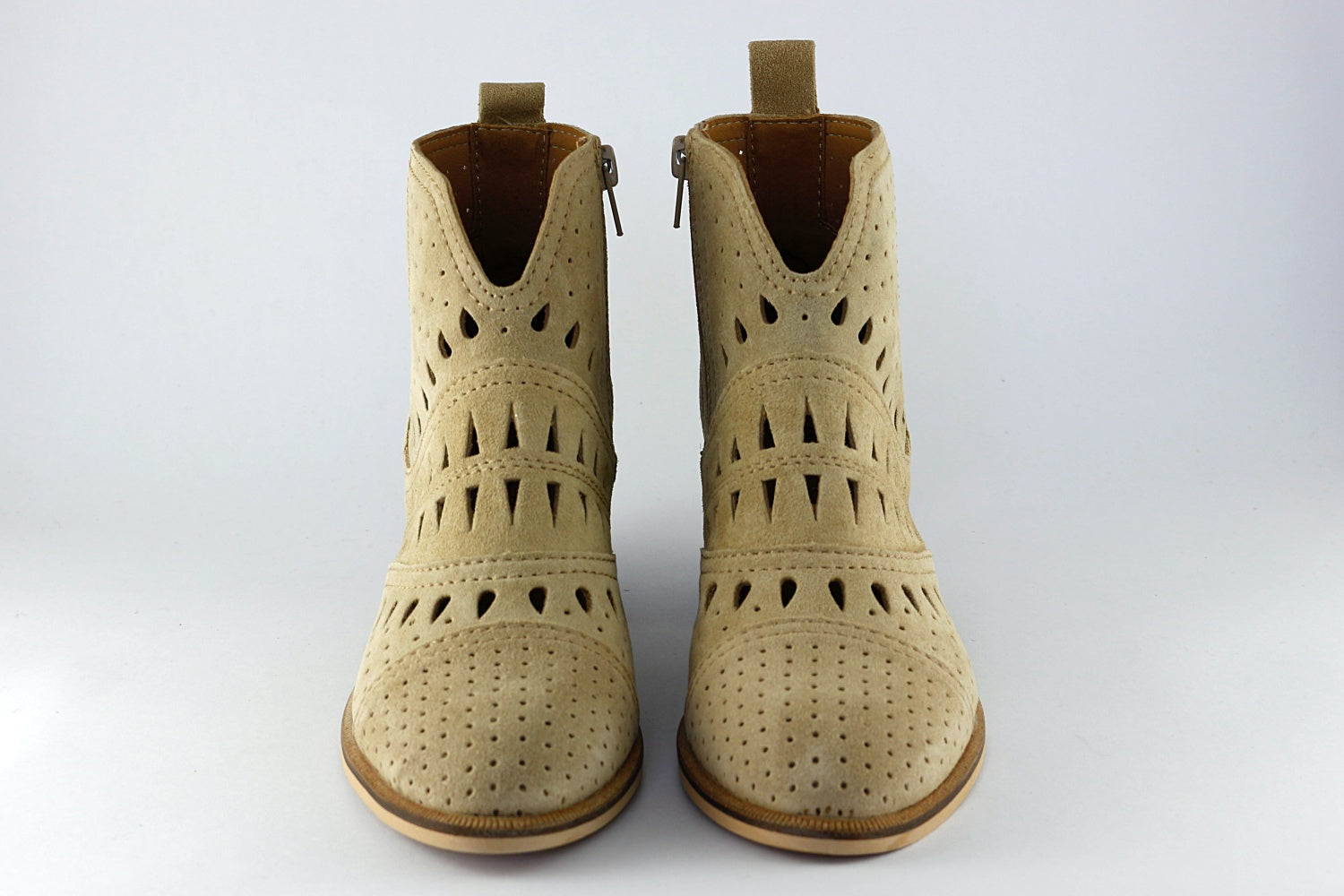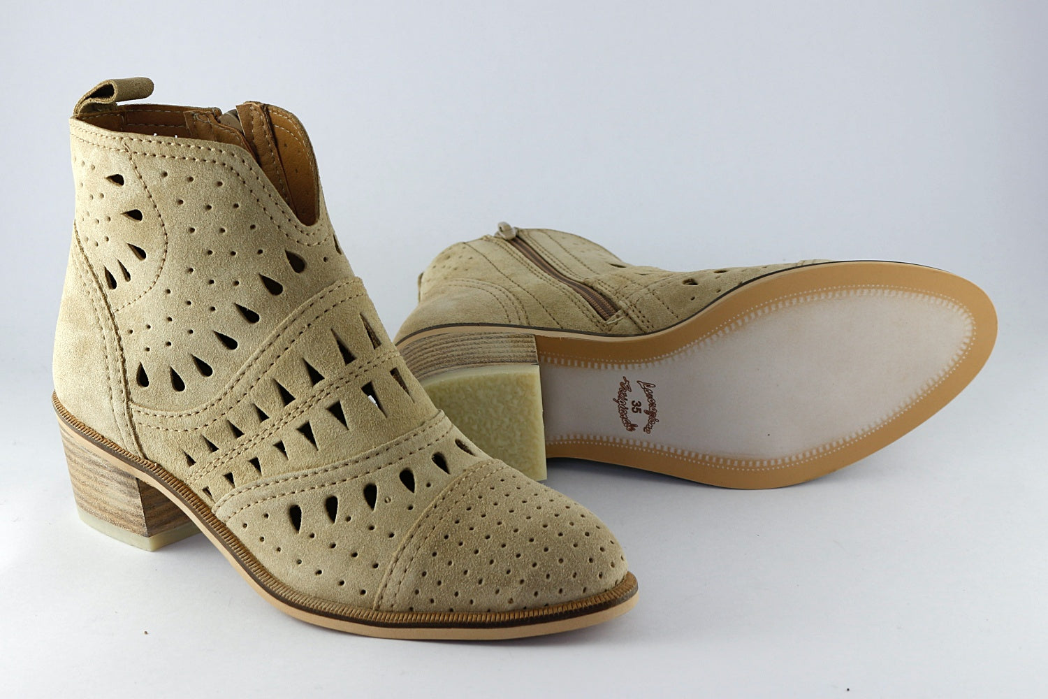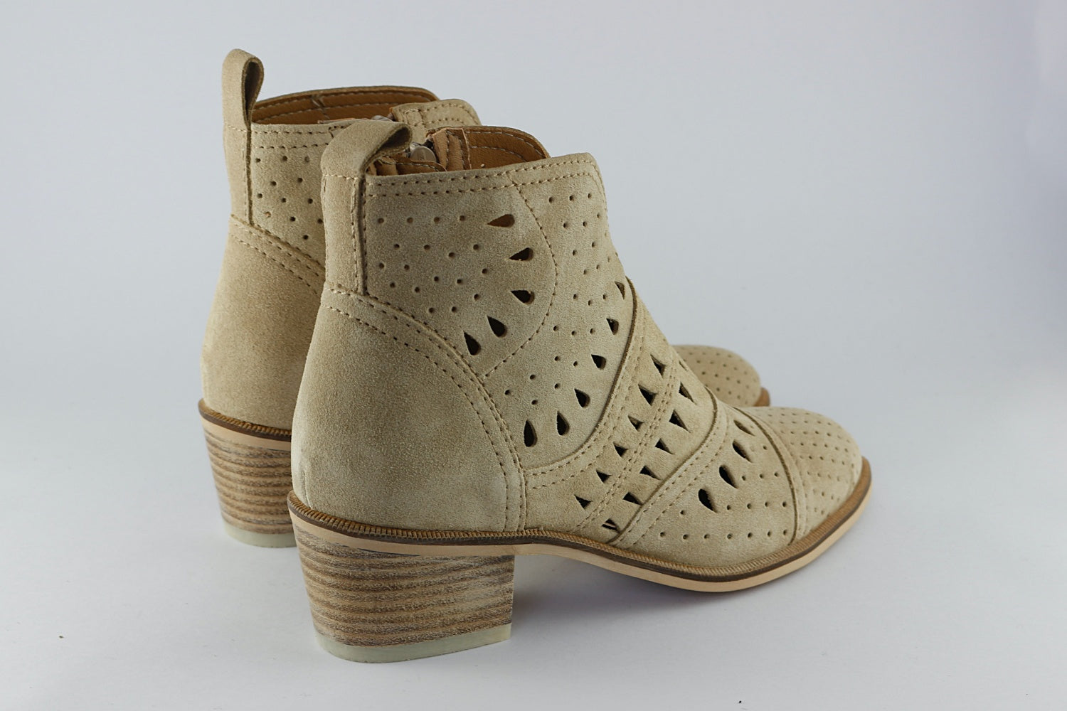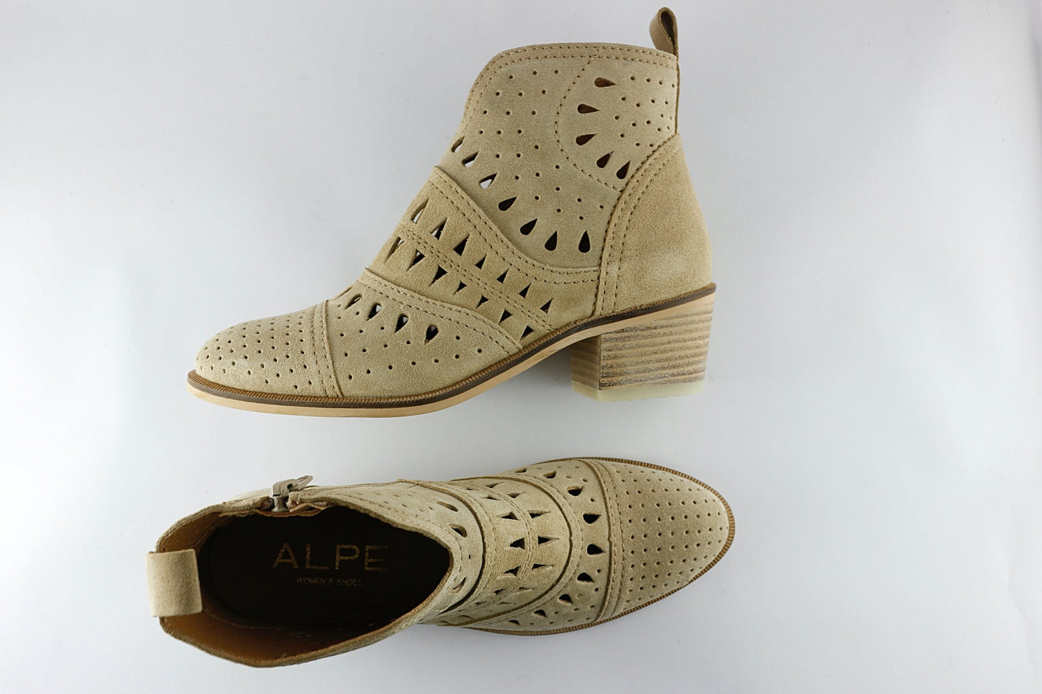 Alpe's 'Nelly' suede summer ankle boot is beautiful with jeans or a dress. The cut-out boot is a soft sand suede with an almond toe and inside zip. Leather-lined and rubber-bottomed heel (5cm high).