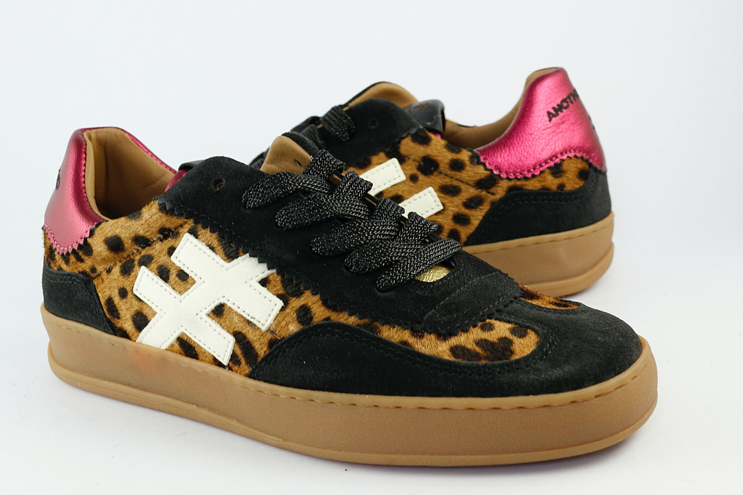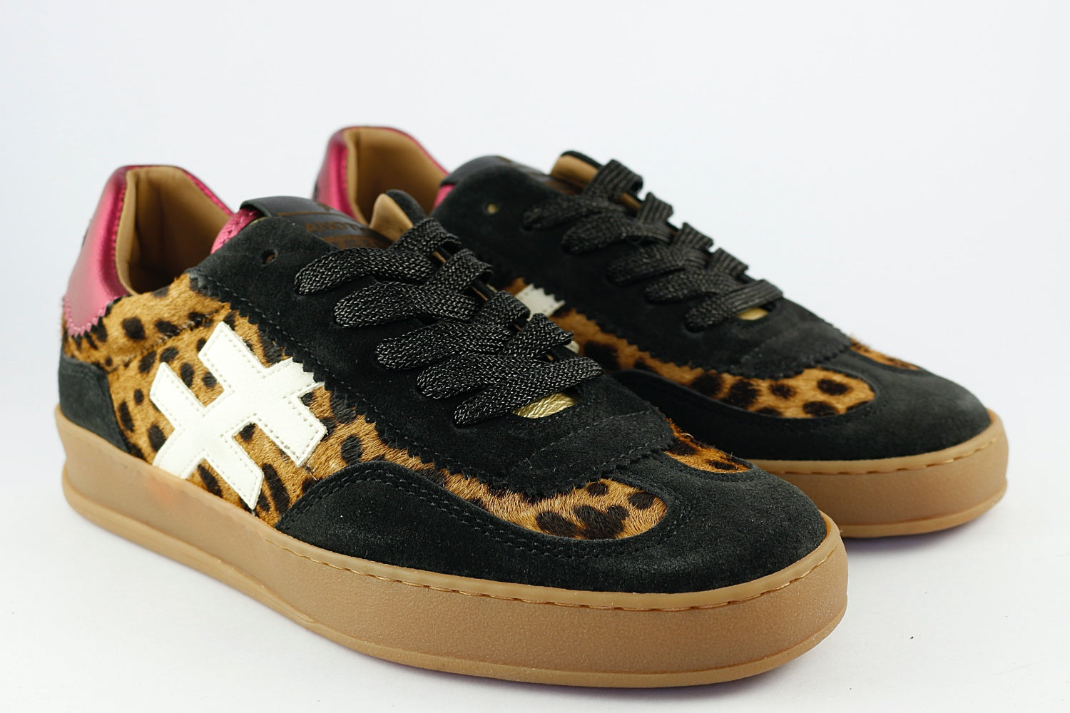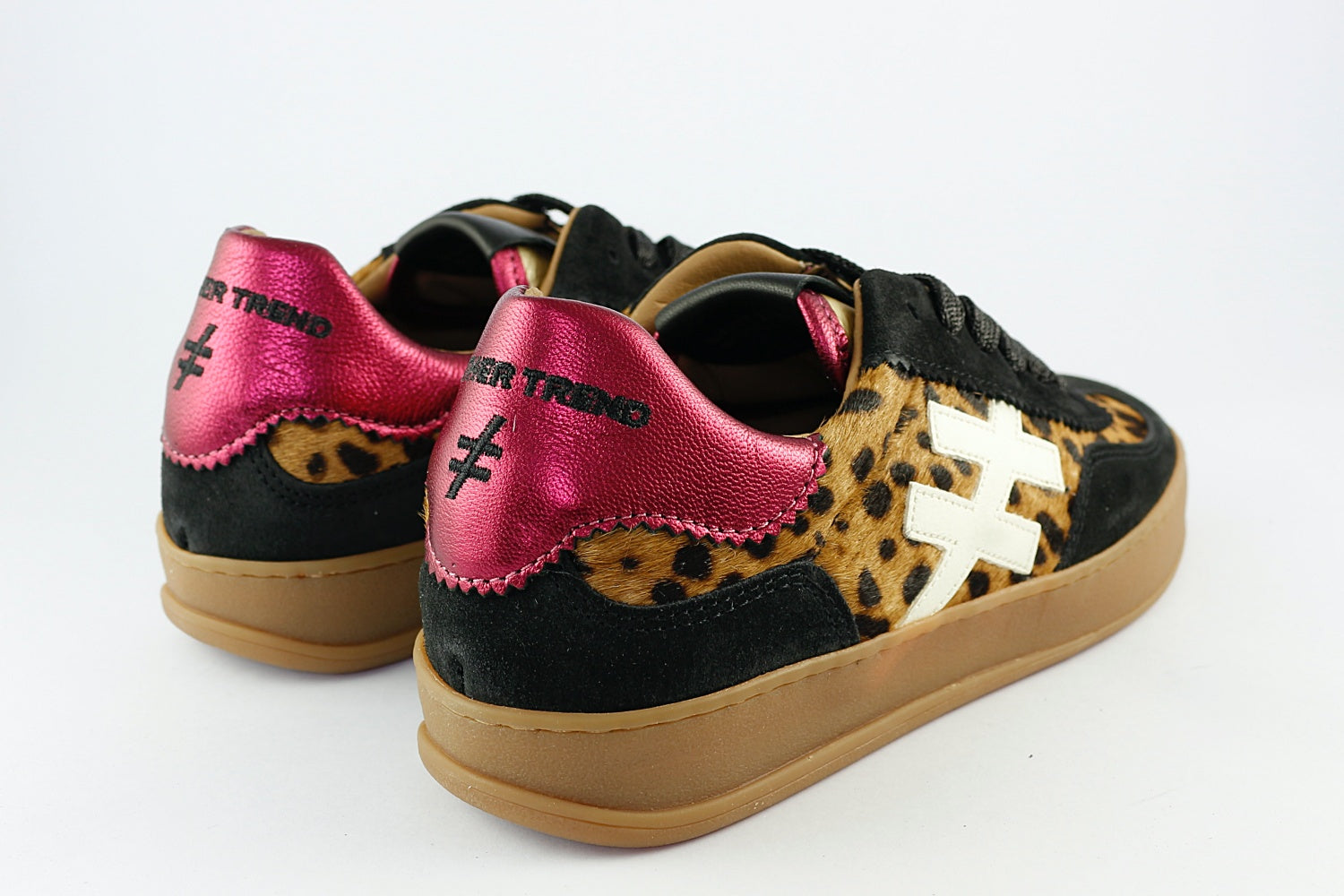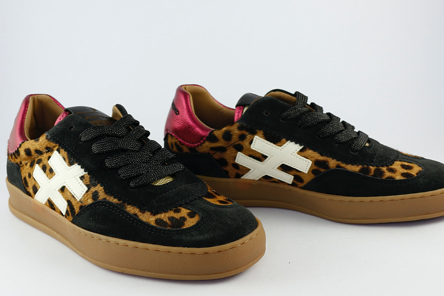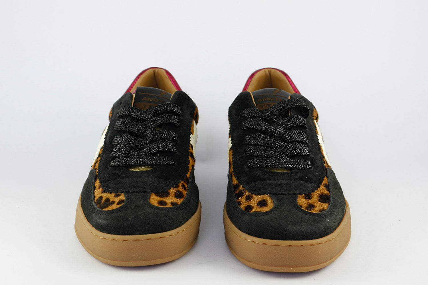 Colours: Black suede; raspberry leather ankle, leopard faux pony, with cream logo. The 'tongue' is black and silver leather with a trim in raspberry. Laces: Black.