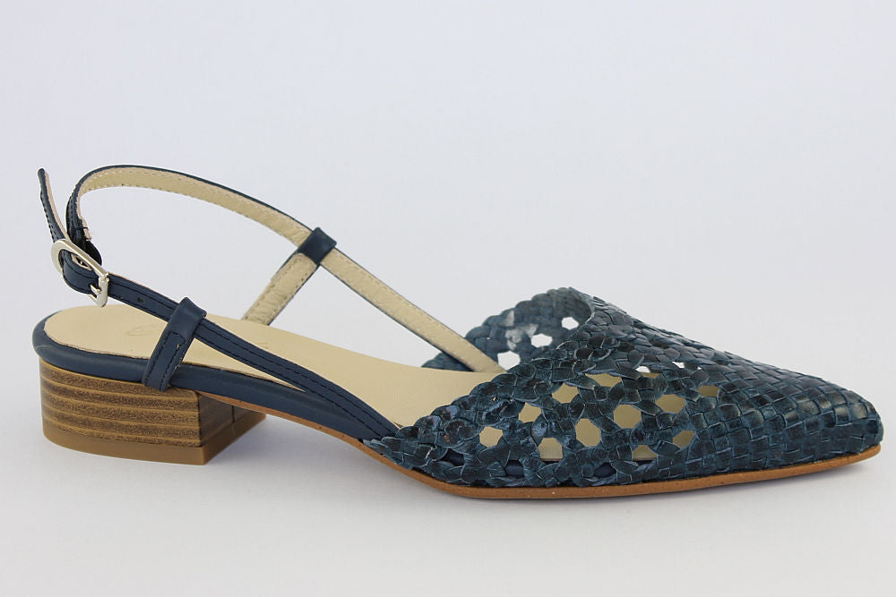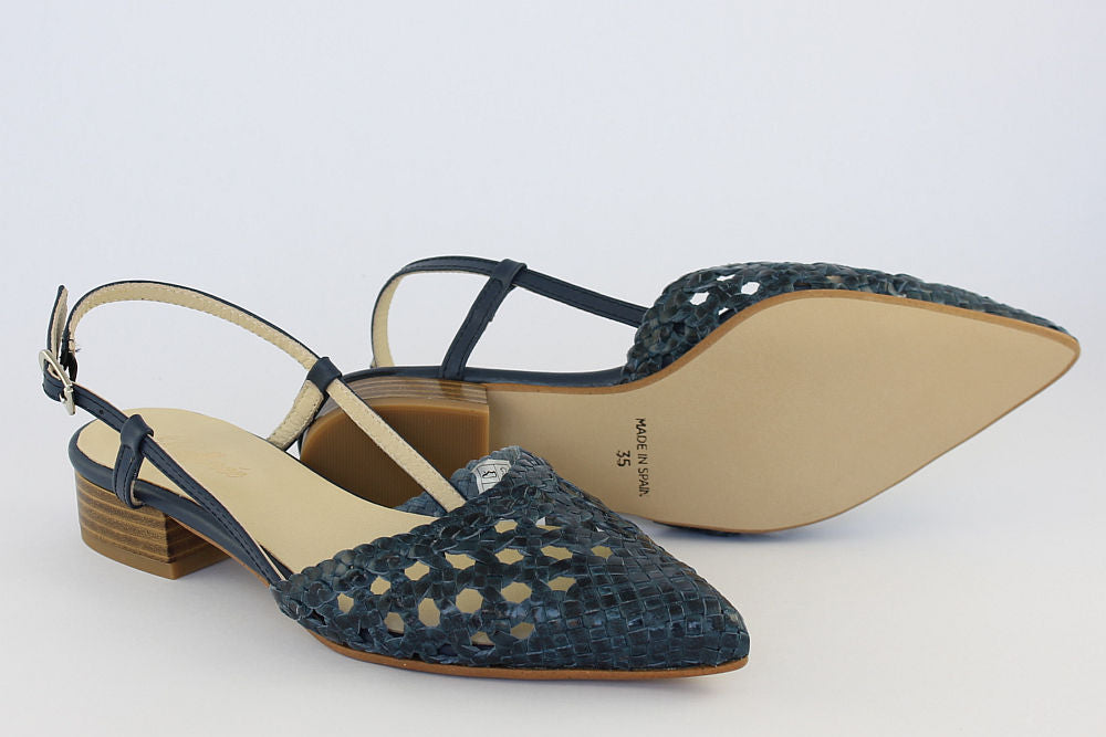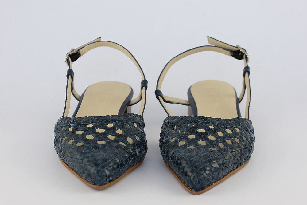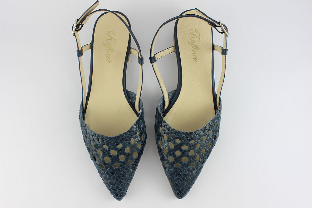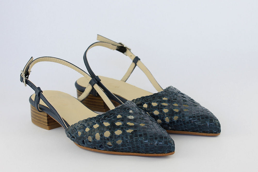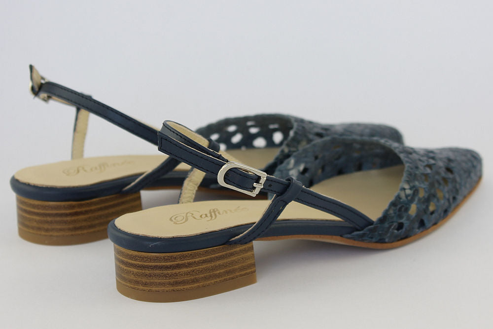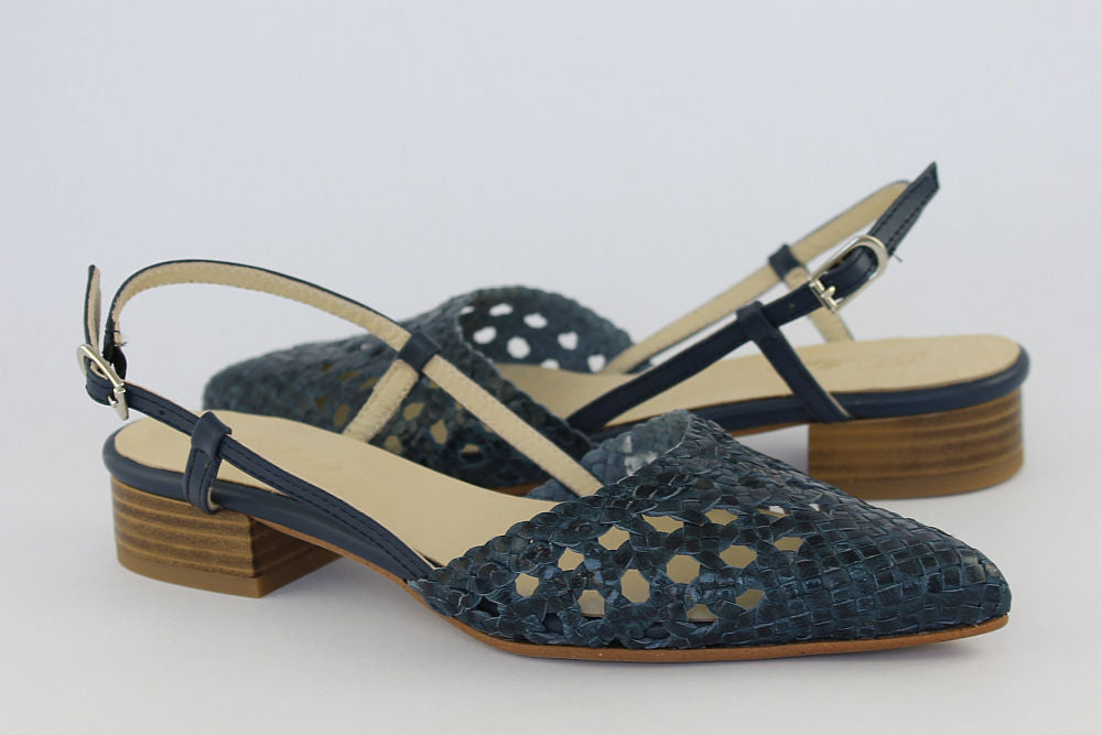 'Estela' is a flat, woven leather, pointed toe sandal in Denim Blue with an adjustable ankle strap. It is leather-lined and has a rubber bottom. Exquisite styling.