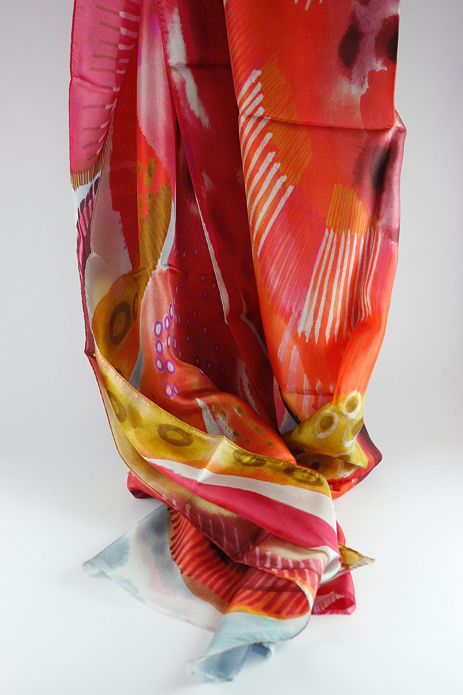 Barbieri's very painterly scarf appears as an other-worldly landscape where the light is dancing. Amazing shapes, colours and effects. Multi-coloured, mainly reds, pinks with highlights of saffron yellow and orange, and soft greys and blues.
