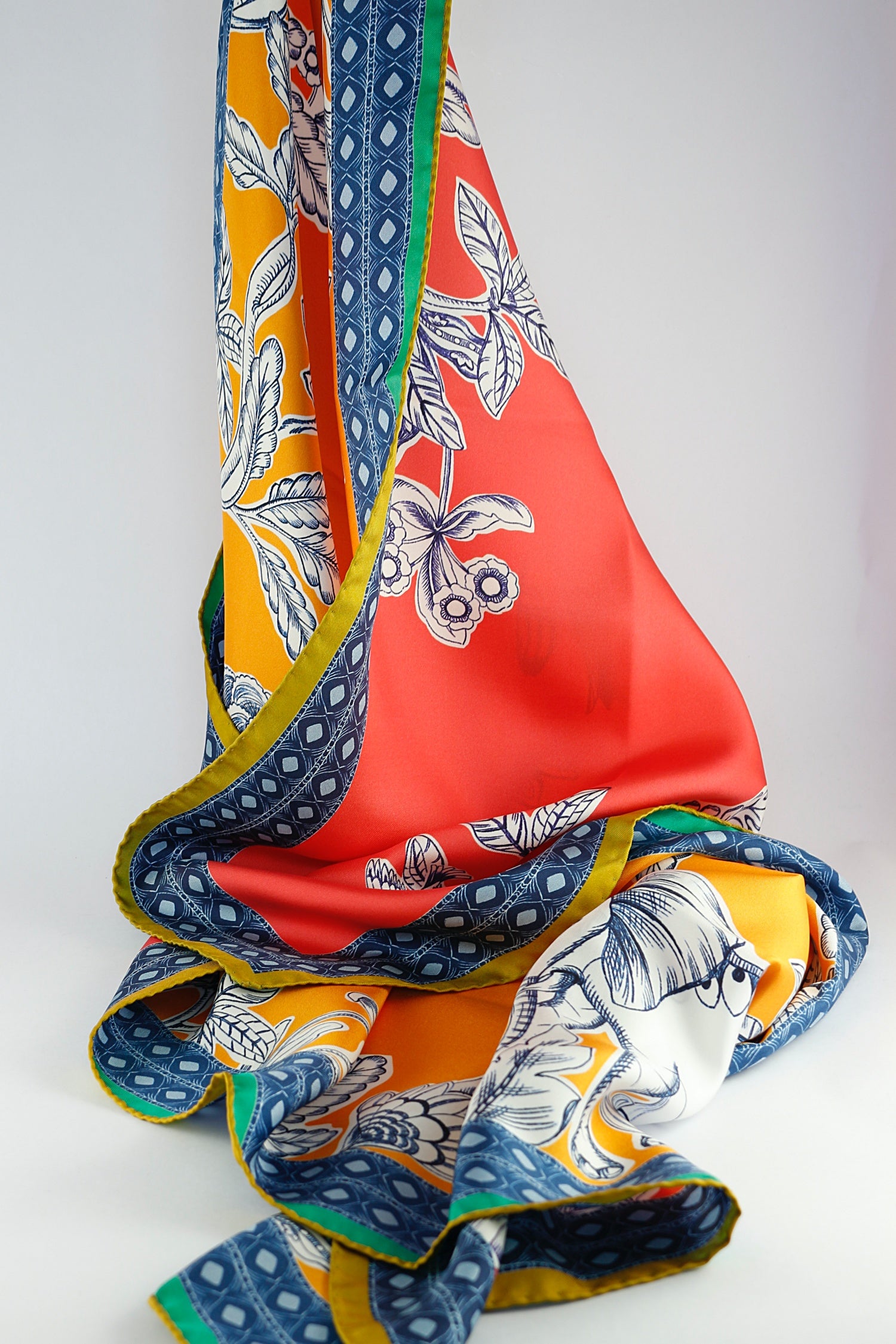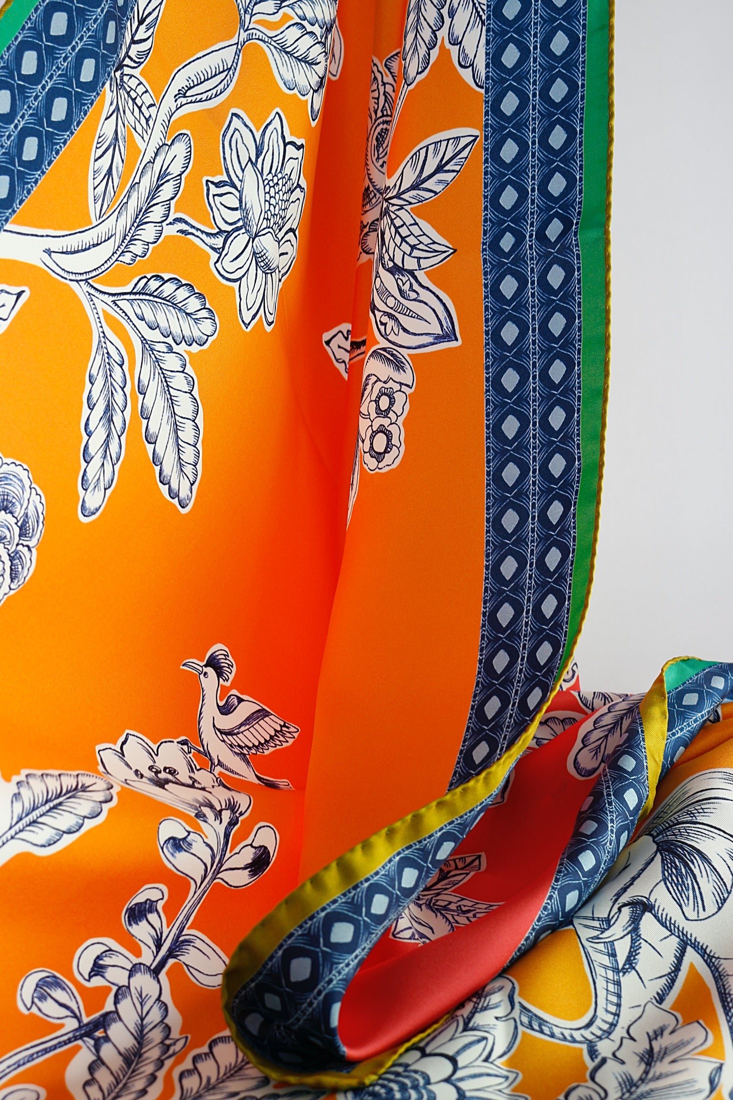 Barbieri's 'Venetian Garden' in Watermelon comprises a beautiful square of birds, flowers and leaves with a tiled border. The garden is drawn in white and navy, with a blue tiled border and an earthy green edging. The reverse combines orange, white, blue and jade, so when tied, these extra colours can be revealed.