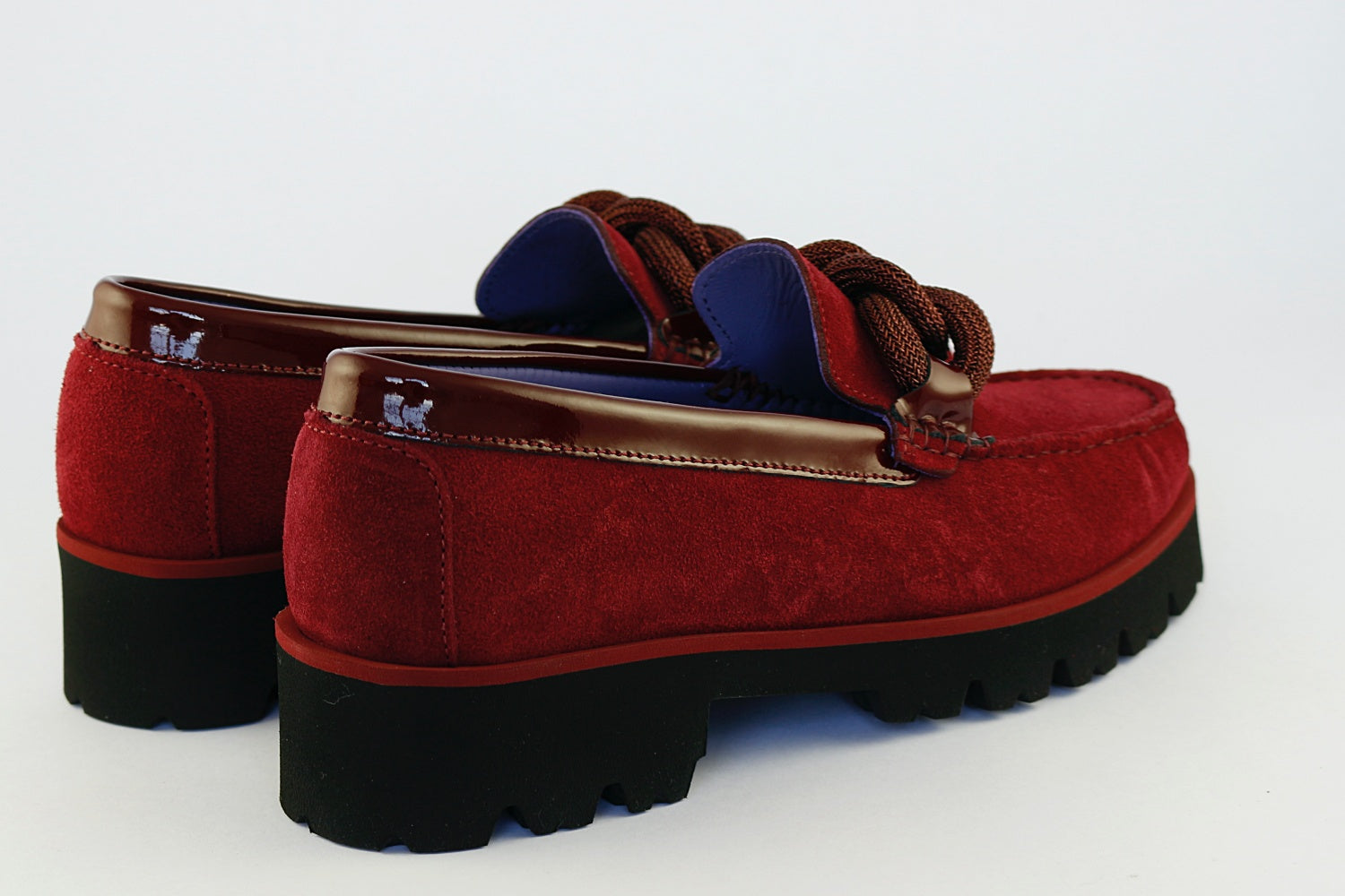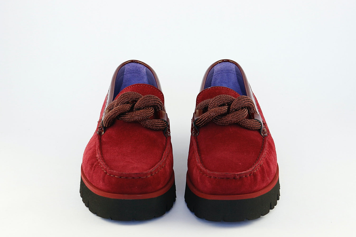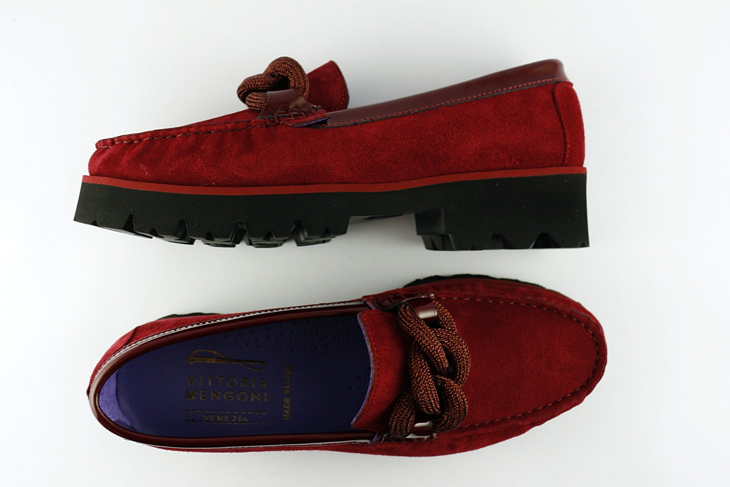 Vittoria Mengoni 'Frederica' is a Bordeaux suede loafer on a wedge with a sparkly twist detail. Leather-lined with rubber wedge sole.