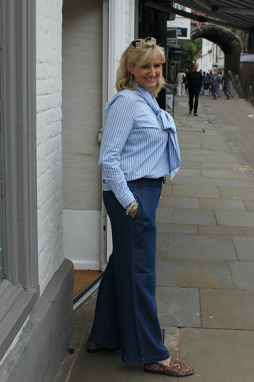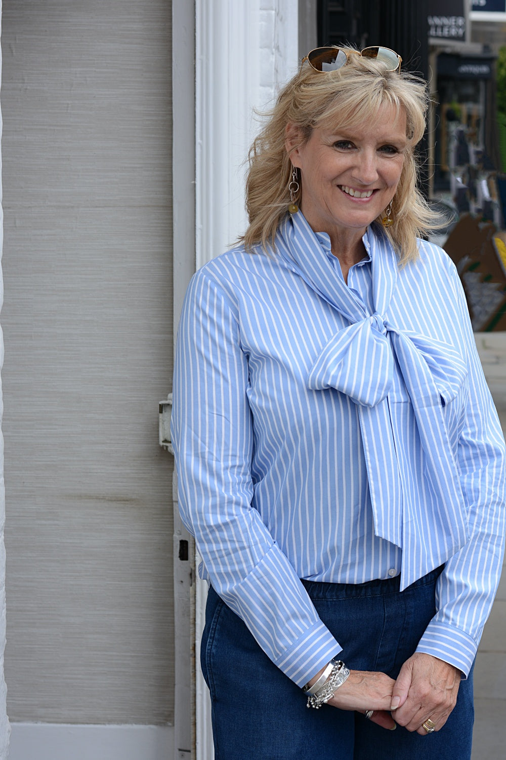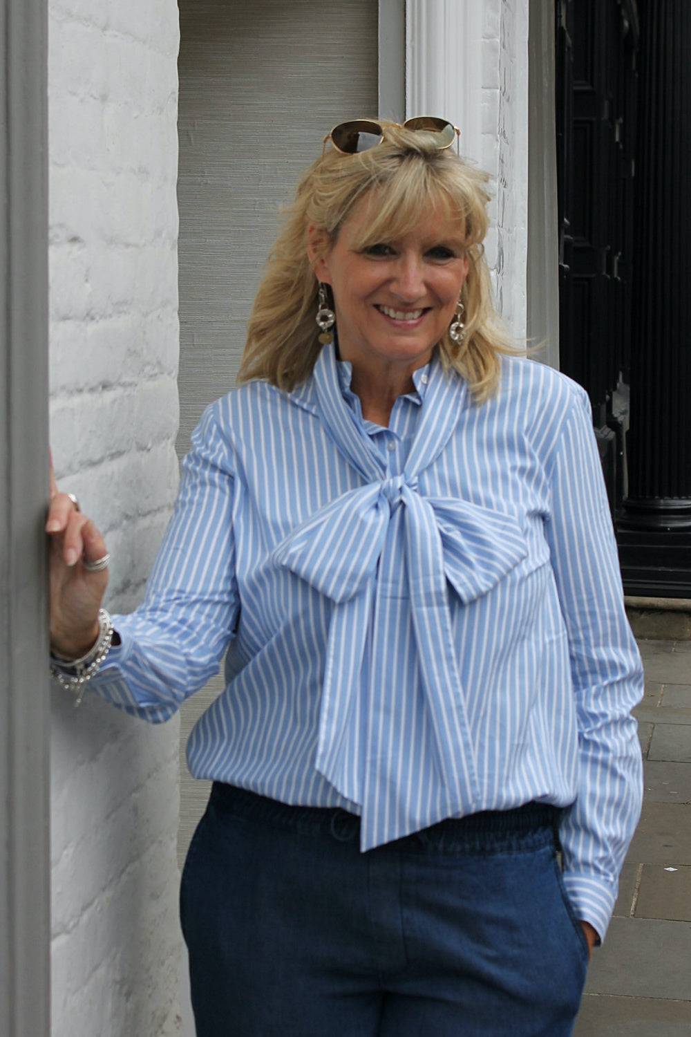 Designed with a mandarin (or Nehru) collar, pussy bow tie, buttoned front and long sleeves with cuff and button, this is the perfect fusion of shirt and blouse. Style it formally, or wear it long and loose, the 'Florence' is a versatile piece, striped in pale blue and white.