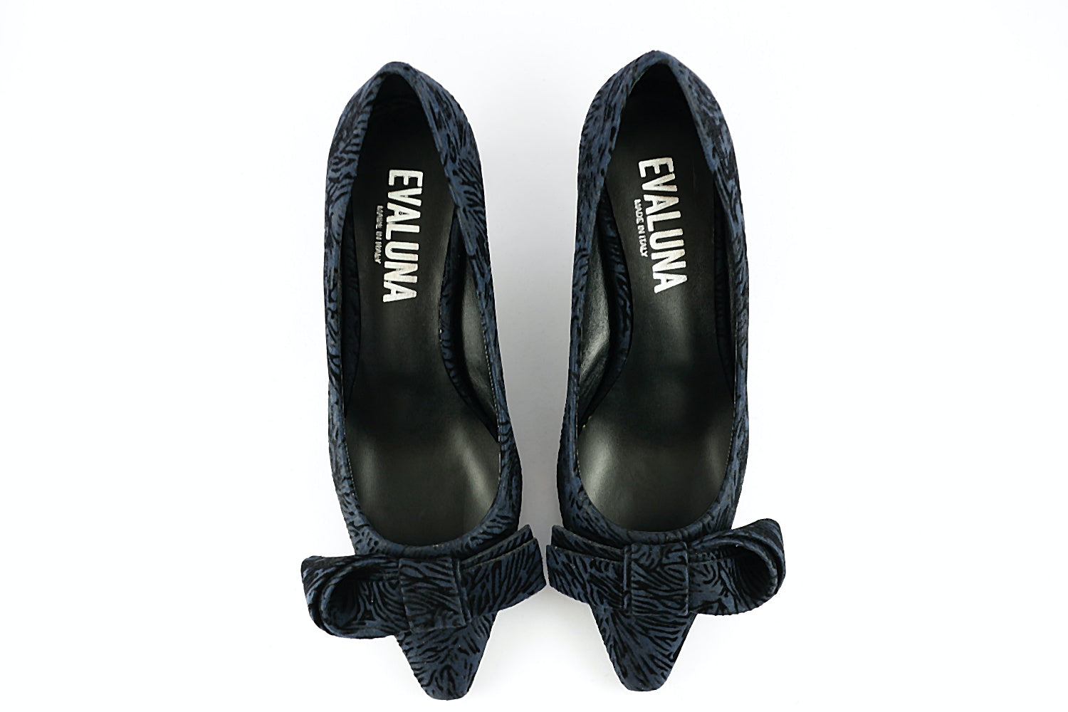 Evaluna 'Capri' is a beautiful Navy court shoe in a velvet textured print over suede, with bow detail and a pointed toe. With a 6.5 cm kitten heel, these will become a wardrobe staple for every time you need to look more chic.