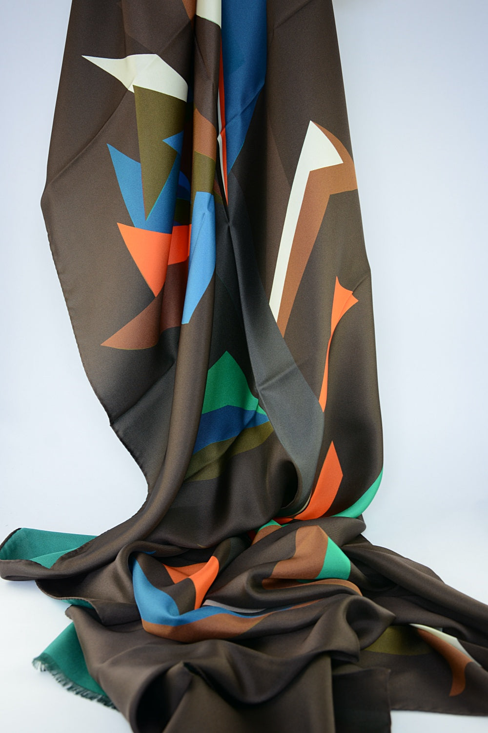 Barbieri's 'Collage' has the feel of a late Matisse artwork. It is printed on both sides. One side is chocolate brown with denim blues, jade, orange, bronze and ivory; the other is teal green with hot pink, lilac, purple, magenta, lime and ivory. Beautiful sharp shapes interlinked on an oblong silk scarf. A work of art to wear, the epitome of the brand.
