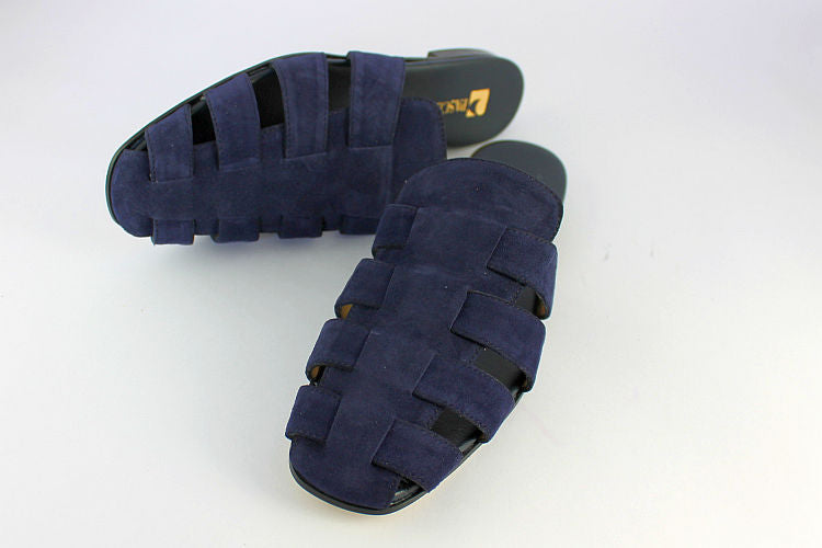 Pascucci navy suede strappy mule with a leather sole, a non-slip panel, and leather insole.