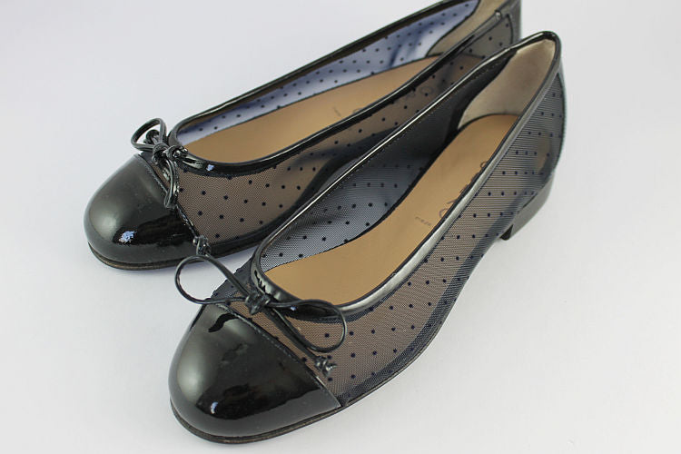 Lorbac dark navy patent leather and polka dot mesh ballet pump on a leather and rubber sole.