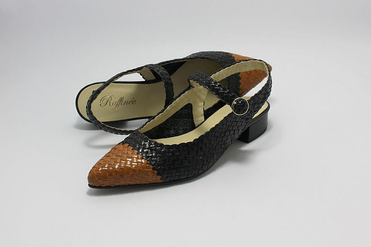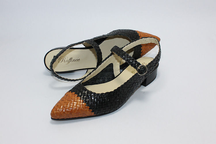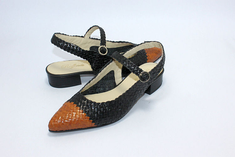 Raffinee 'Samara' black woven leather backless sandal with a tan leather toe. Adjustable ankle strap in black, leather-lined, leather soles and a 1 inch heel.