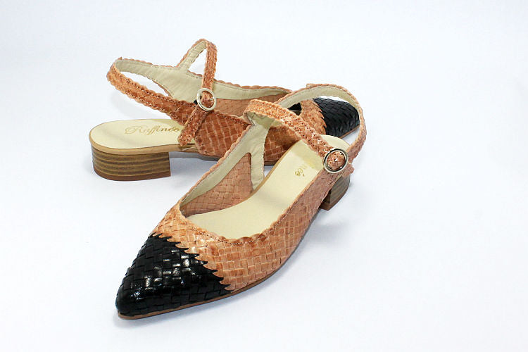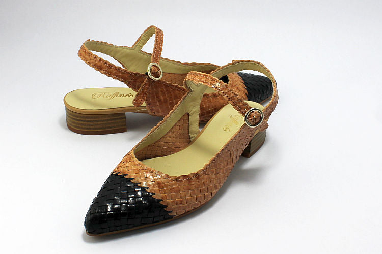 Raffinee 'Samara' camel woven leather backless sandal with a black toe. Adjustable ankle strap in camel, leather-lined, leather soles and a 1 inch heel.