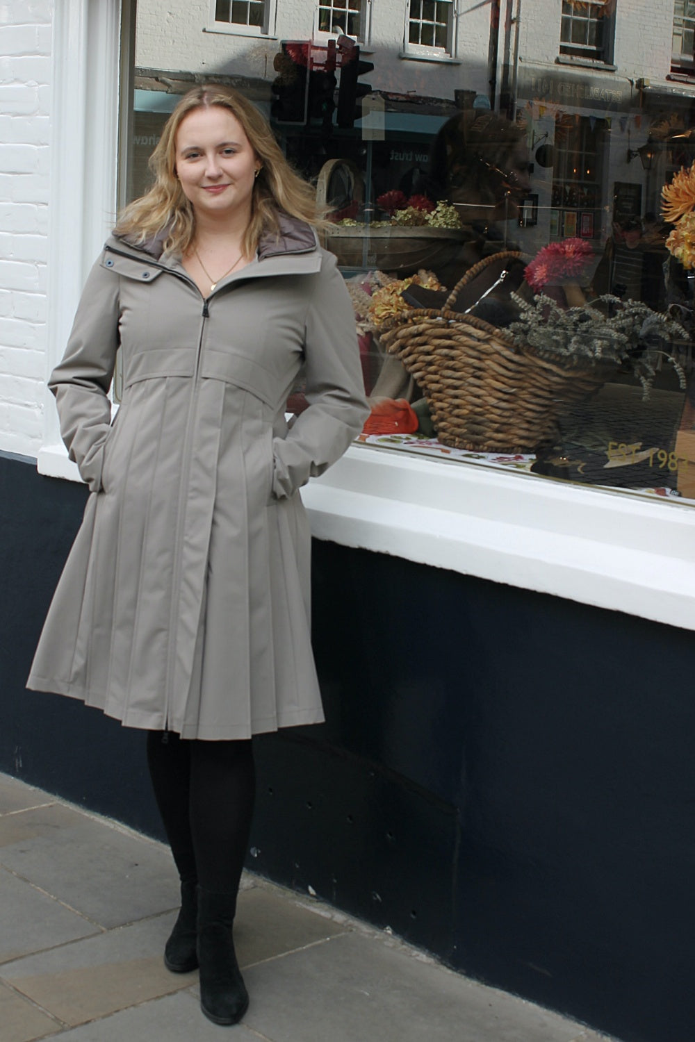 The 'May' raincoat in Smokey Taupe is becoming an iconic piece, combining what Creenstone do best: functionality and style. This coat has elegant pleats for a beautiful silhouette, and it's highly water-repellent. The detachable inside collar and soft knitted cuffs offer warmth and versatility. The hood folds neatly into the collar for a streamlined look. Also has two side pockets that close with a popper and an inside zipped pocket.