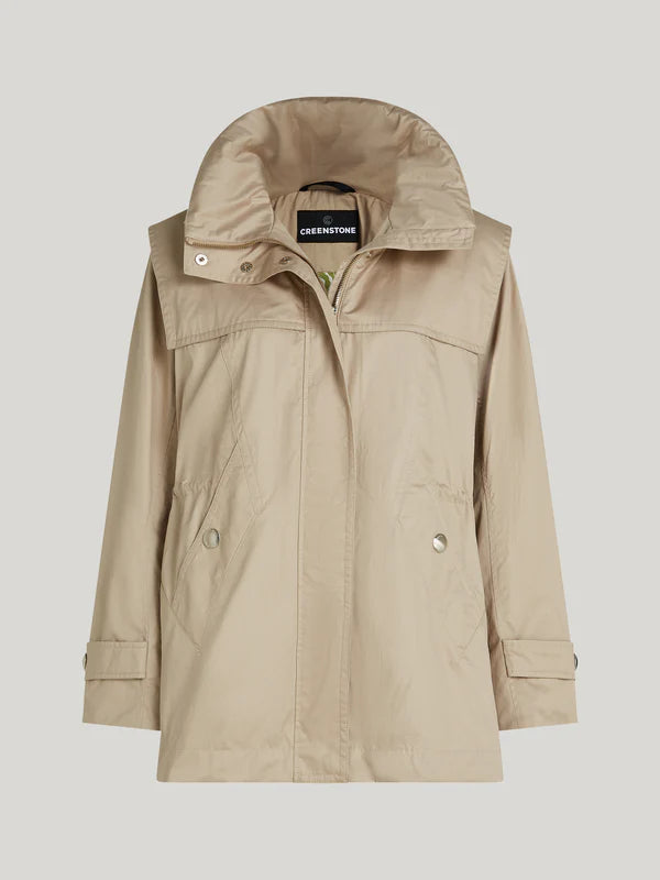 Its unique, functional details include barn jacket shoulder flaps with press buttons, a hood that folds into the collar, plus two front pockets, and one inside zipped pocket. A drawstring waist with cord allows for a custom fit, while the front placket with hidden press buttons keeps the look sleek. With its distinctive design, it’s a versatile piece that elevates any outfit.