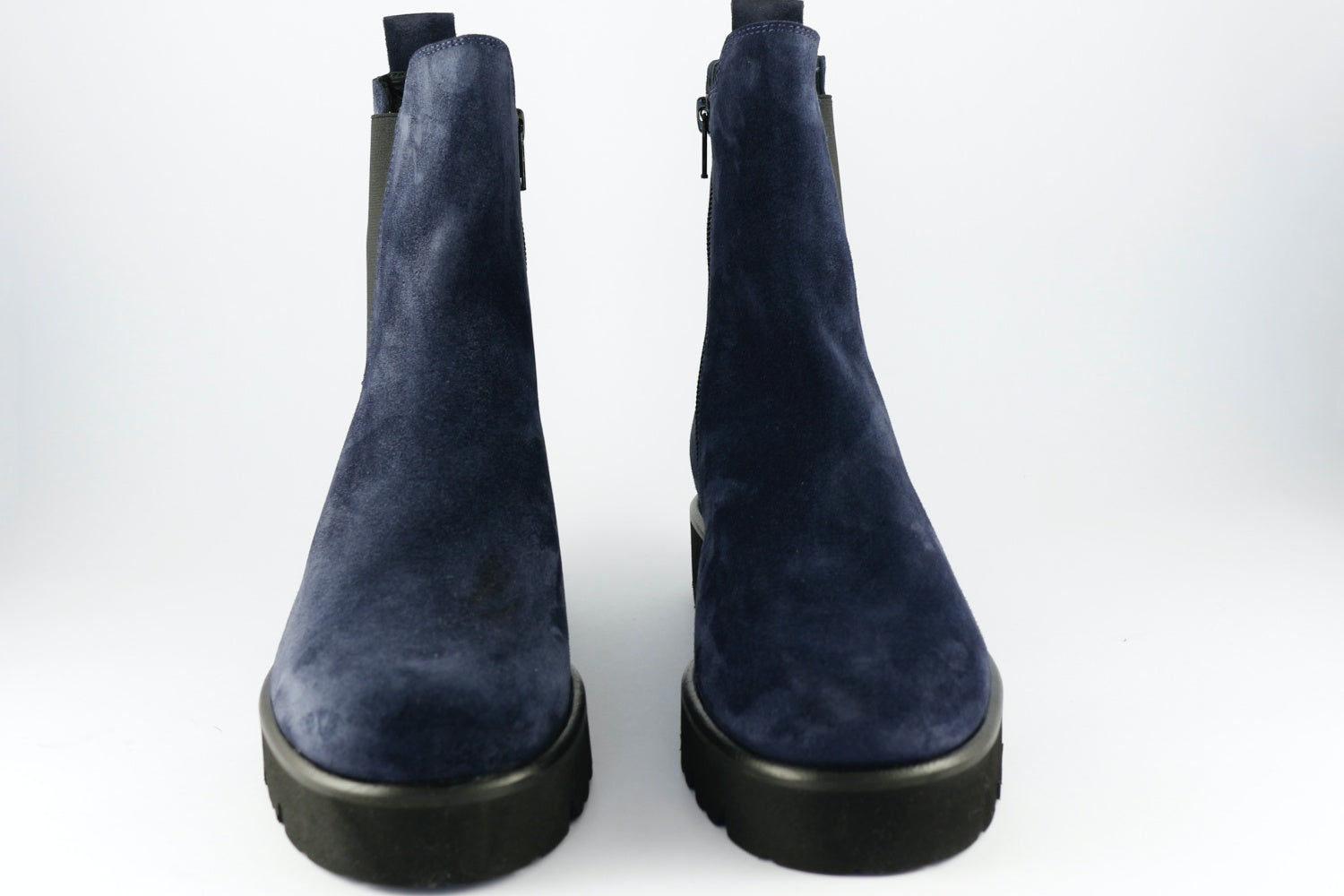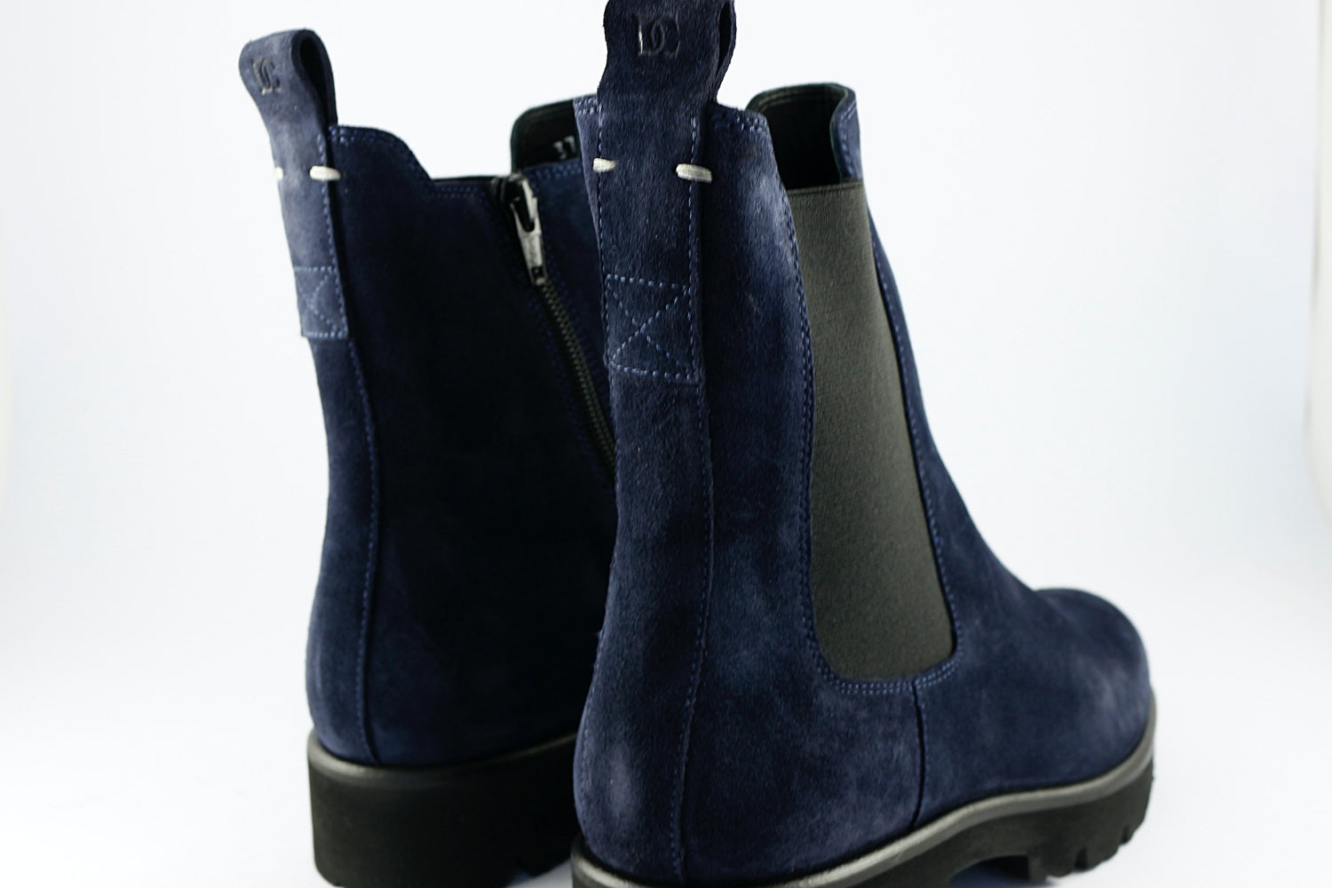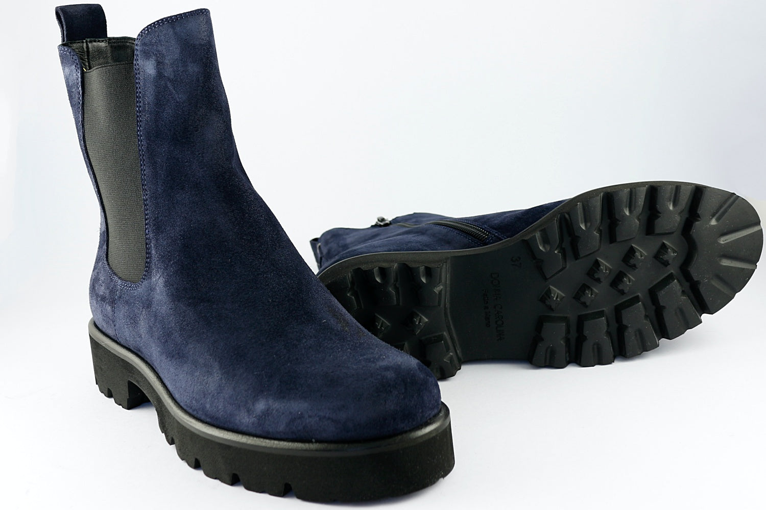 Donna Carolina's 'Ella' in navy suede is a classic winter ankle boot: black stretch fabric panel on the outer side and a side zip on the inner. Leather-lined with a small wedge heel.