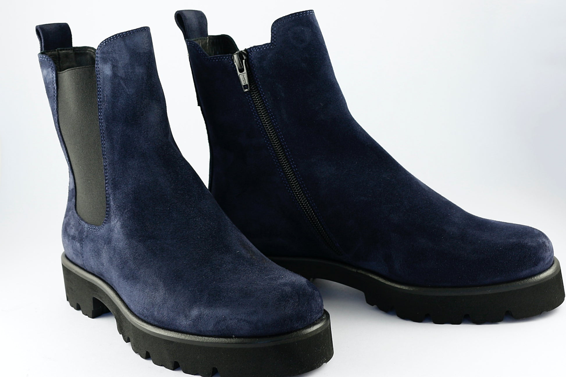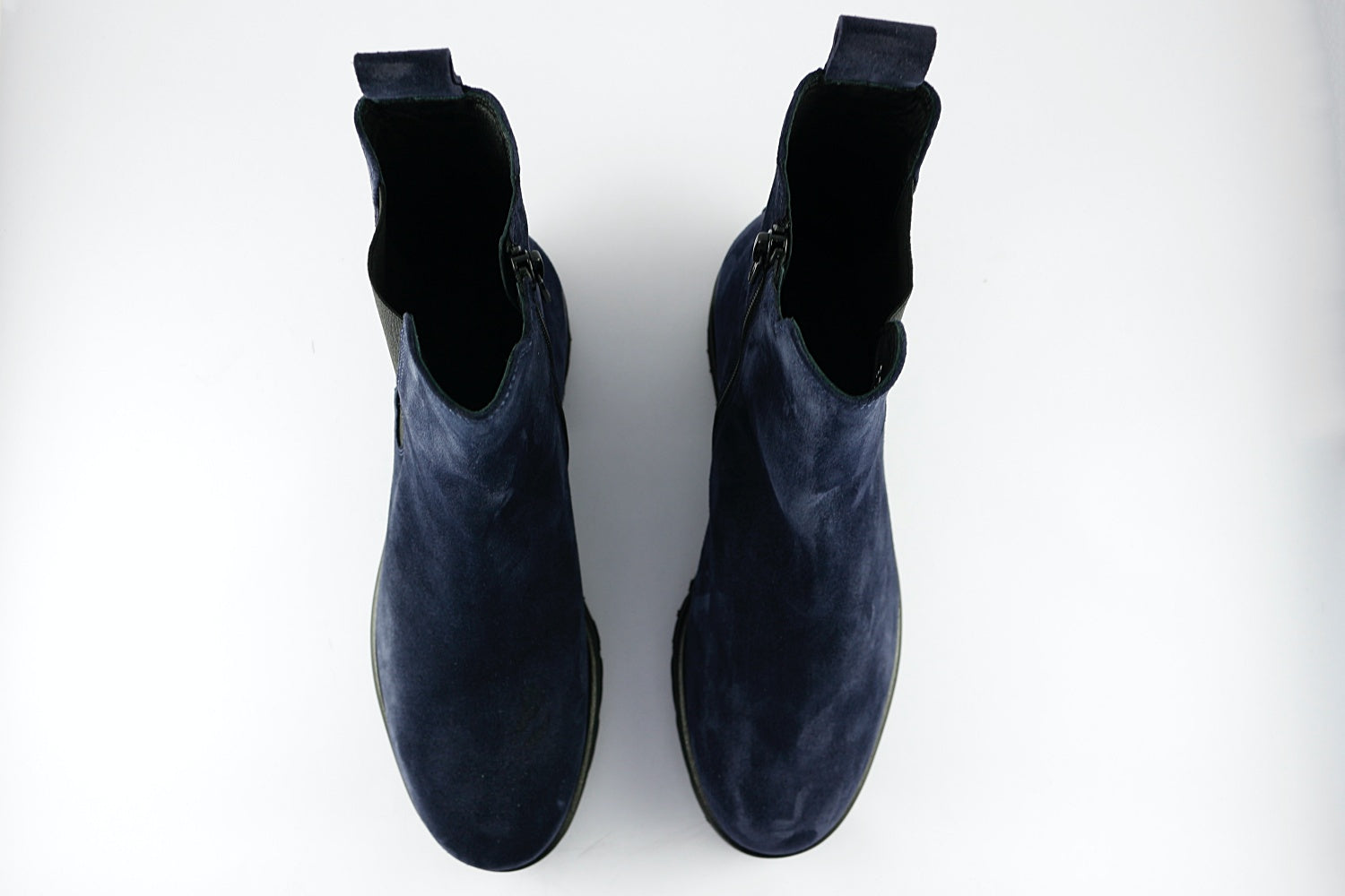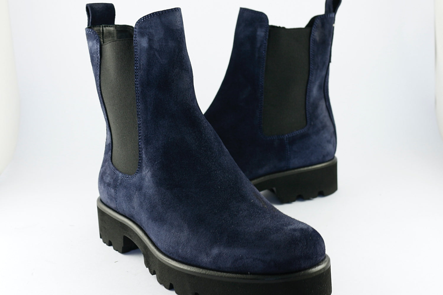 Donna Carolina's 'Ella' in navy suede is a classic winter ankle boot: black stretch fabric panel on the outer side and a side zip on the inner. Leather-lined with a small wedge heel.