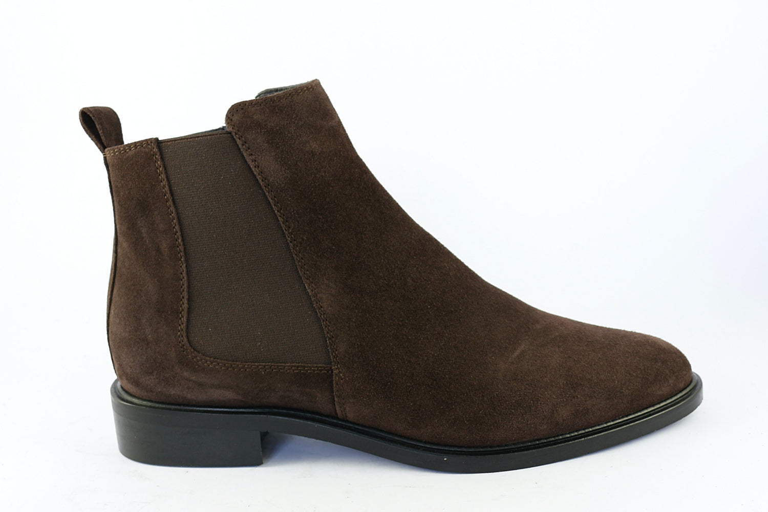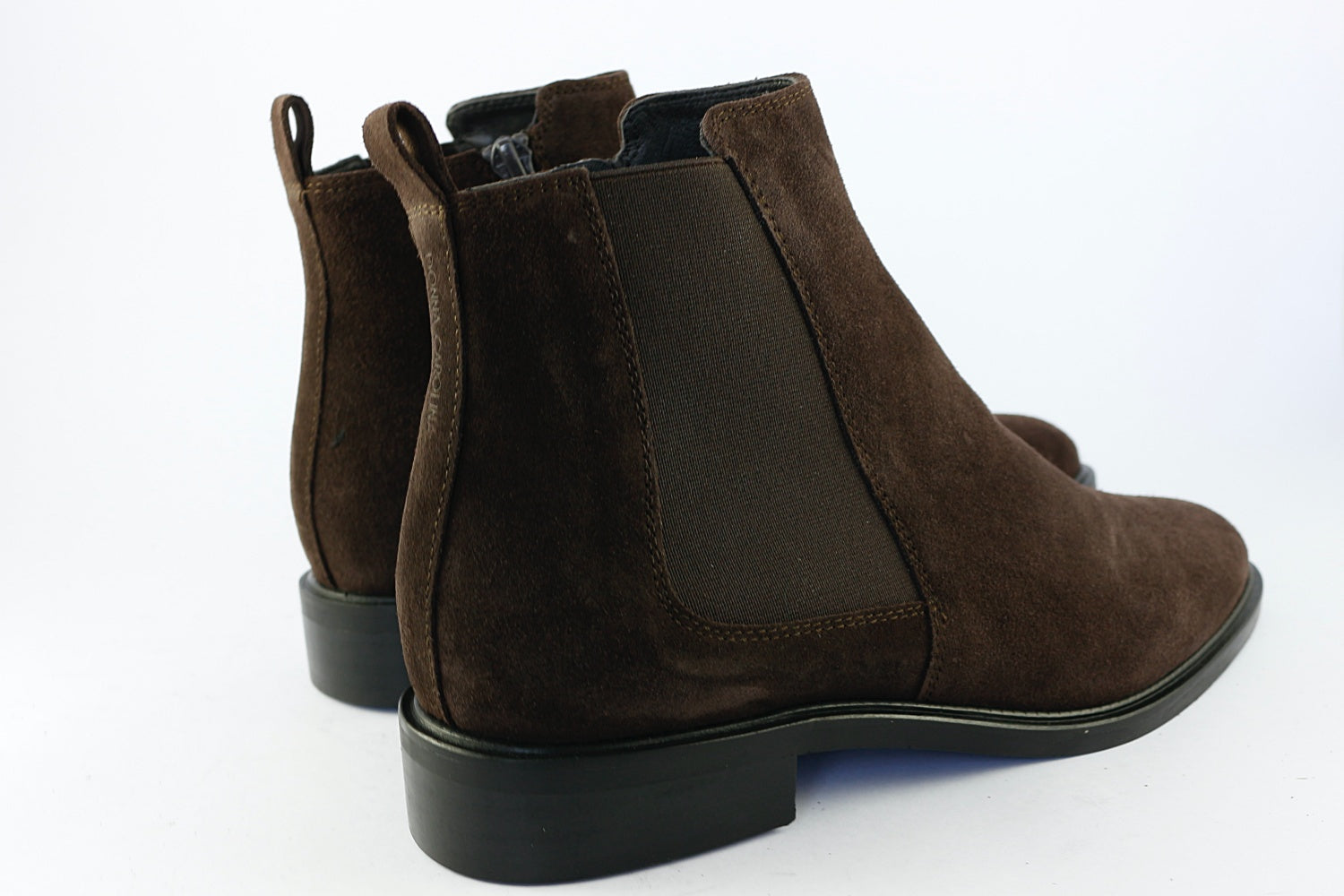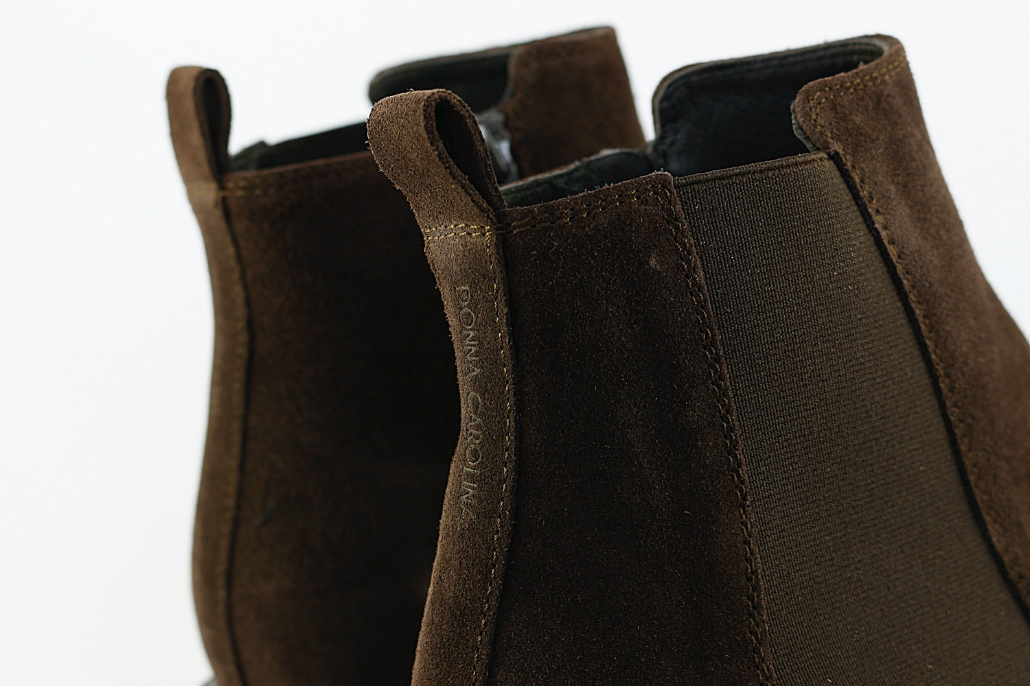 An elegant flat ankle boot from Donna Carolina. 'Estella' comes in Chocolate brown suede with a zip on the inside seam and fabric panel on the outer. It has an almond toe and a 3 cm heel. Leather-lined with a rubber sole.