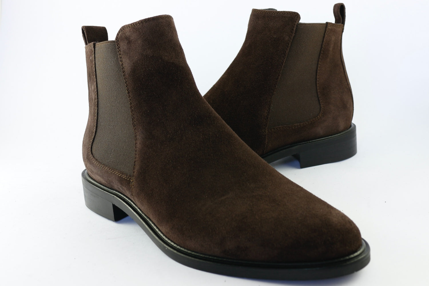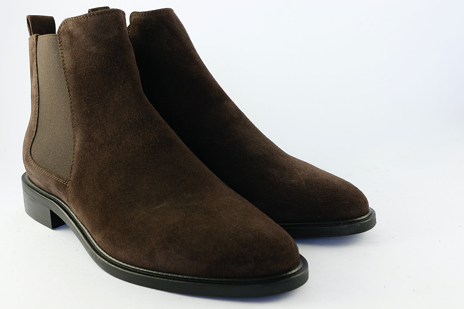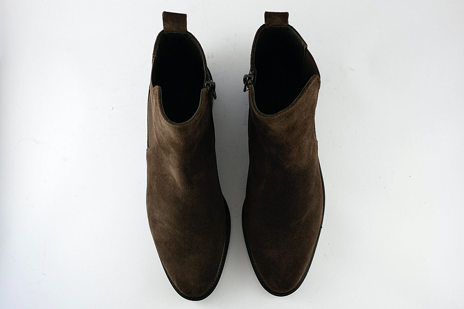An elegant flat ankle boot from Donna Carolina. 'Estella' comes in Chocolate brown suede with a zip on the inside seam and fabric panel on the outer. It has an almond toe and a 3 cm heel. Leather-lined with a rubber sole.
