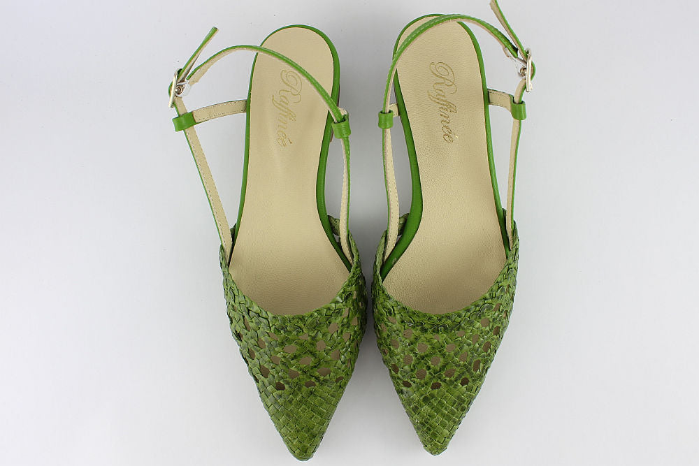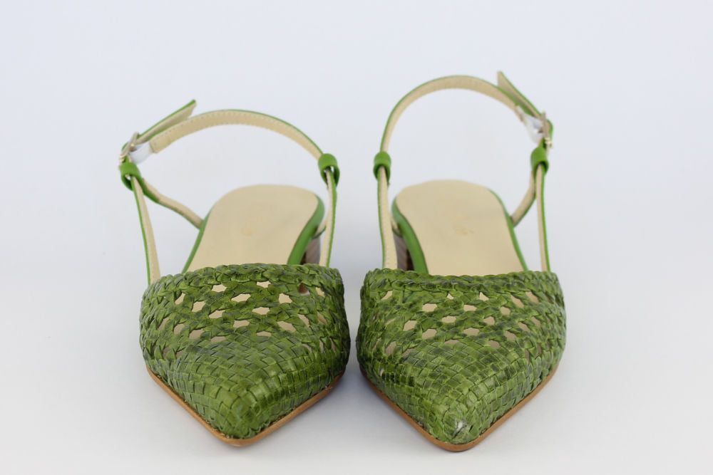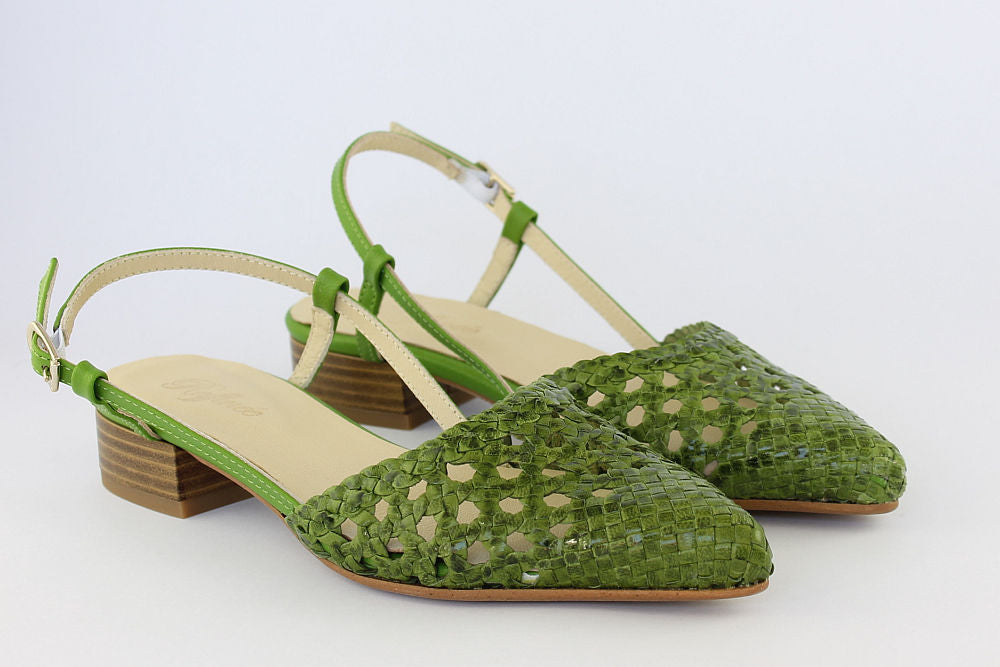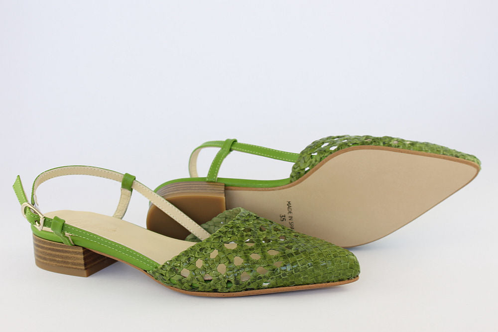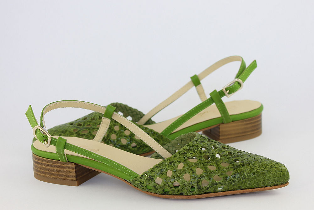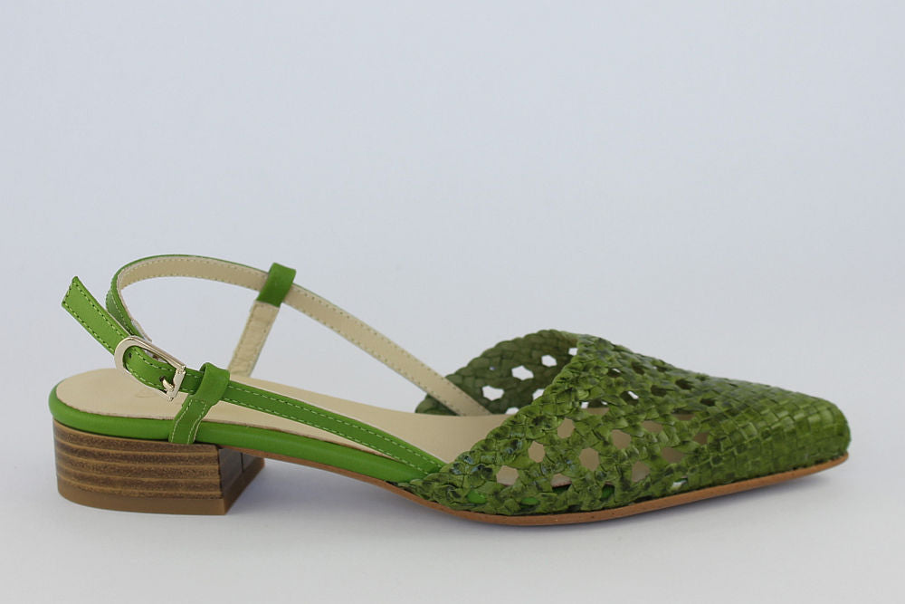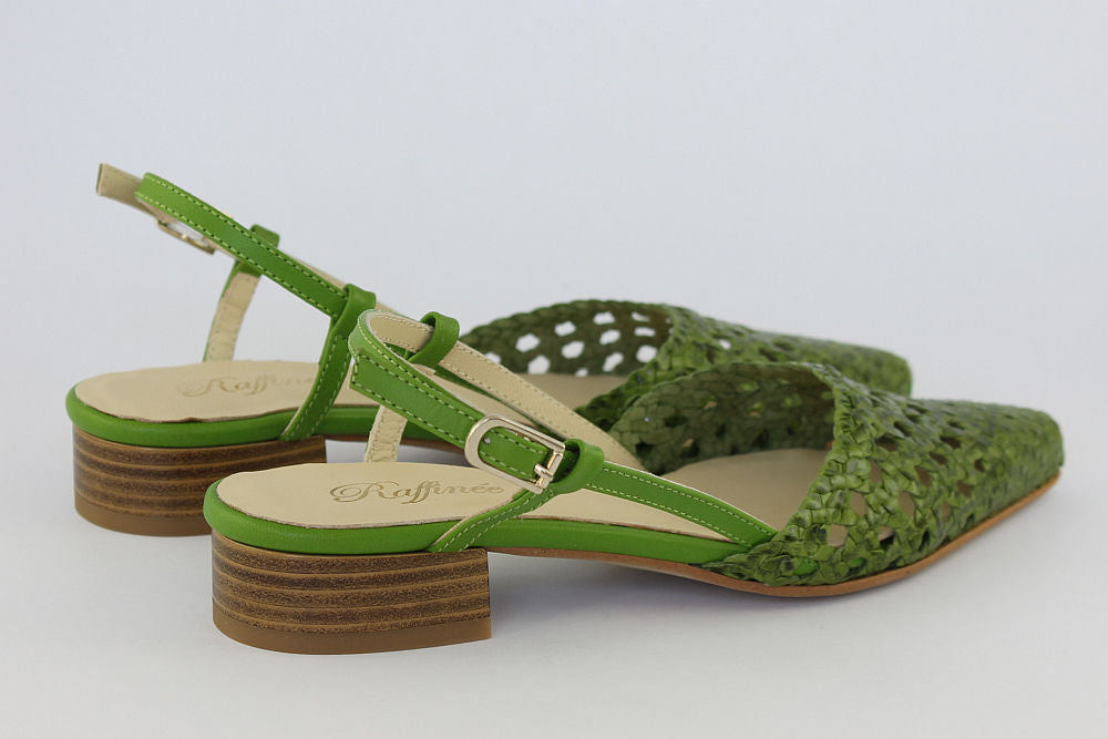 'Estela' is a flat, woven leather, pointed toe sandal in Apple Green with an adjustable ankle strap. It is leather-lined and has a rubber bottom covering the heel. Exquisite styling.