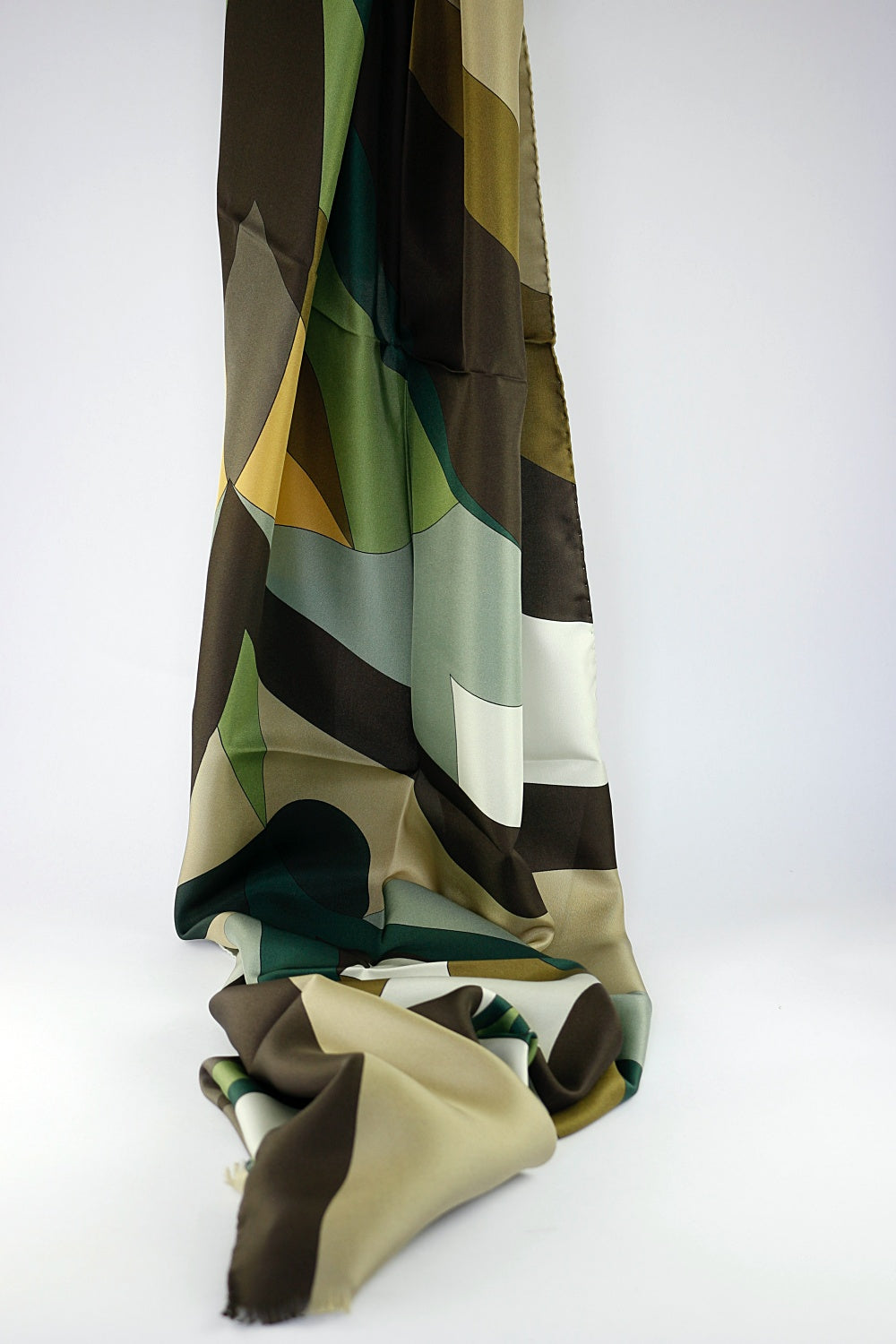 The Barbieri 'Archaelogy' silk scarf is reminiscent of ancient mounds and forests, all in abstract shapes. Beautiful dusky colours in greens, browns, taupe, a greyish duck egg blue and highlighted by a touch of ivory for brightness.
