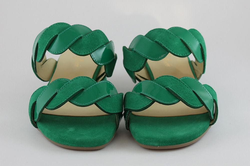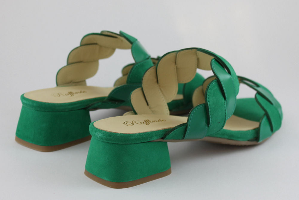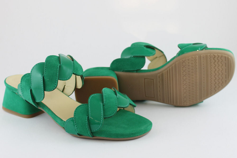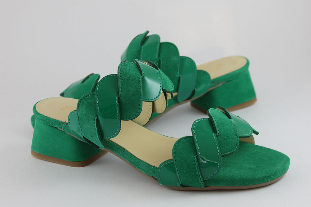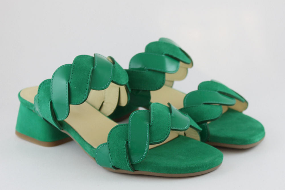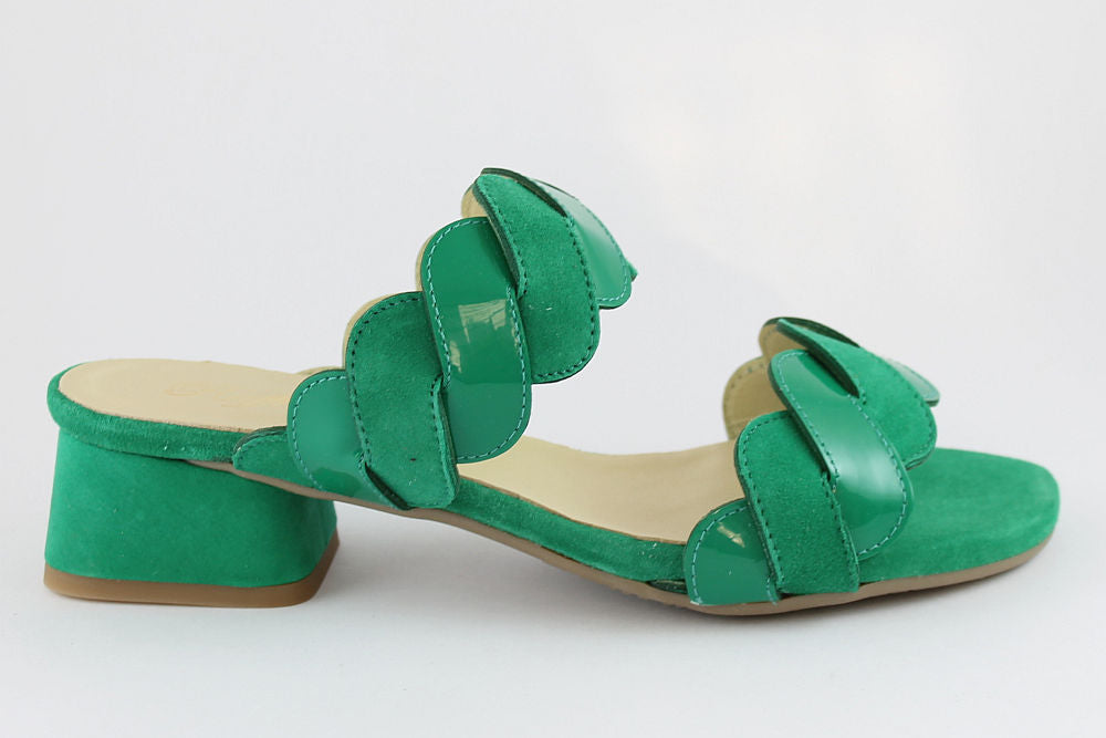 'Lola' is a slide-on sandal with just a bit more character: the twisted straps are a combination of suede and patent leather. This one is in Jade Green patent and suede and has a small covered block heel of 4.5 cm. It is leather-lined with a slip-resistant rubber bottom.
