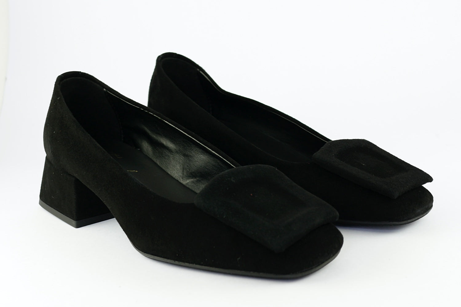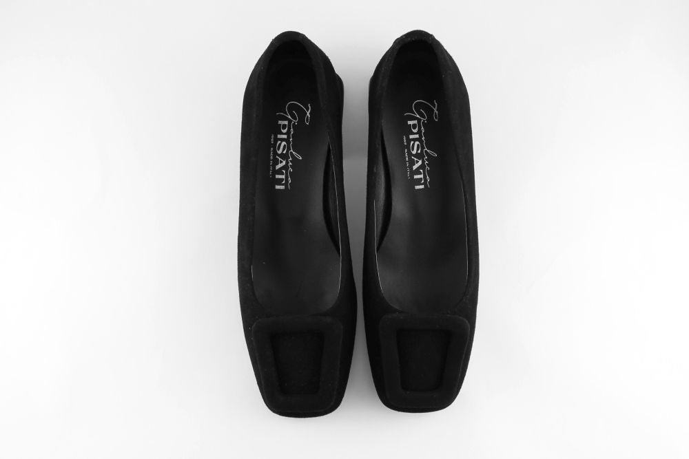 Gianluca Pisati's 'Hollie' court shoe in Black suede with a suede buckle is elegant and chic. This shoe will lift any outfit. Leather lined with a rubber sole and 4 cm block heel.