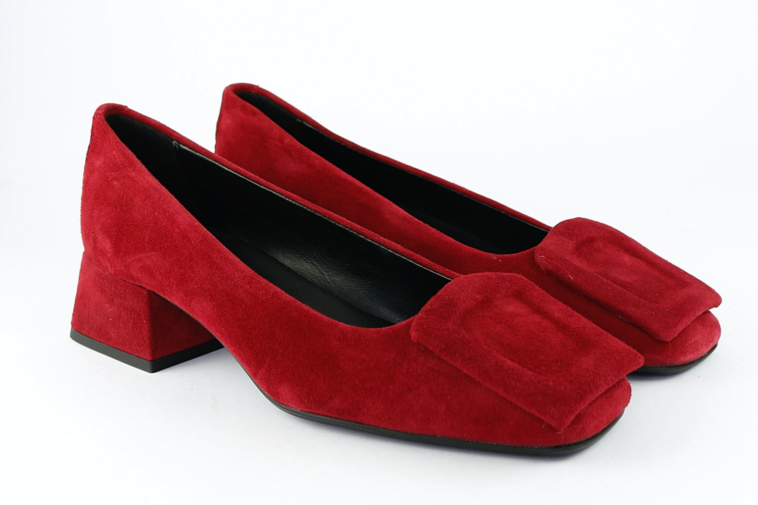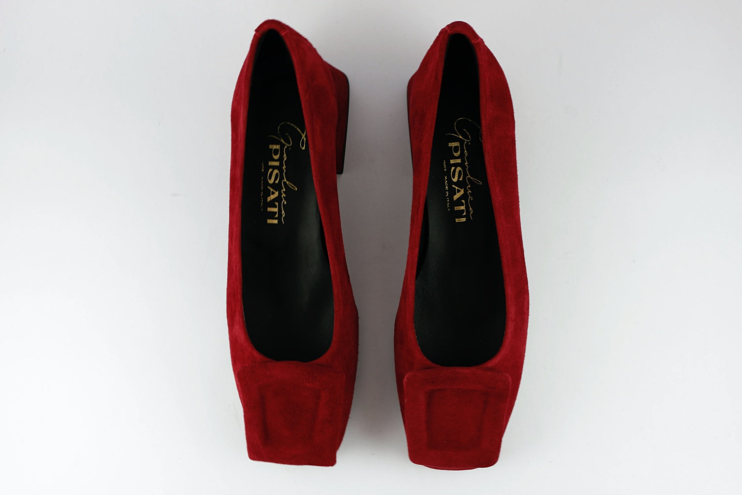Gianluca Pisati's 'Hollie' court shoe in Ruby red suede with a suede buckle is elegant and chic. This shoe will lift any outfit. Leather lined with a rubber sole and 4 cm block heel.