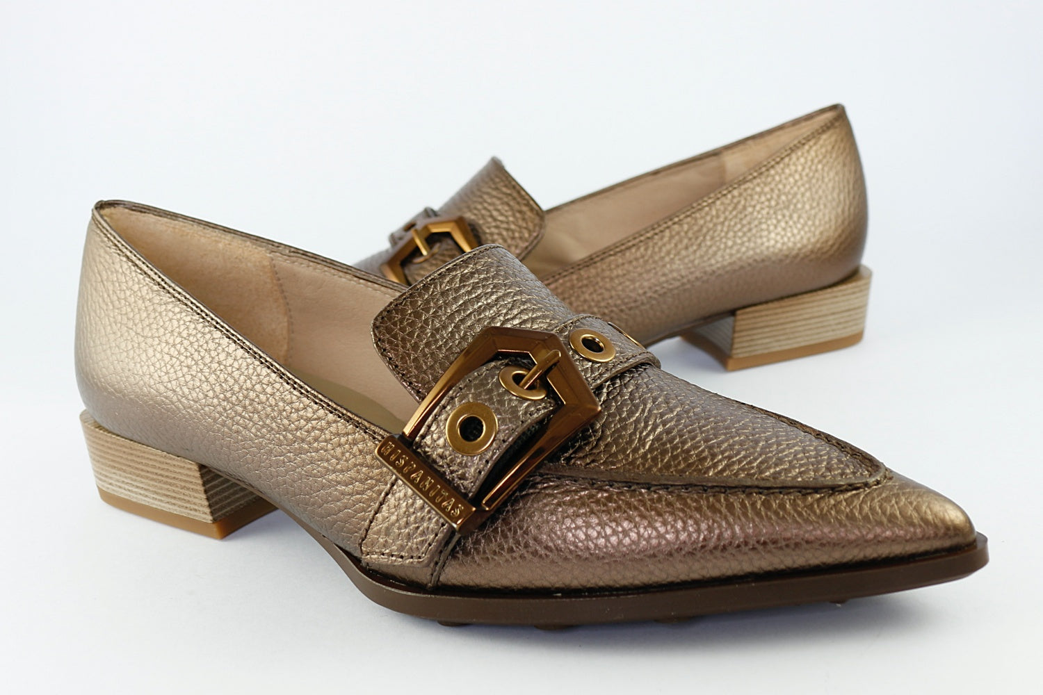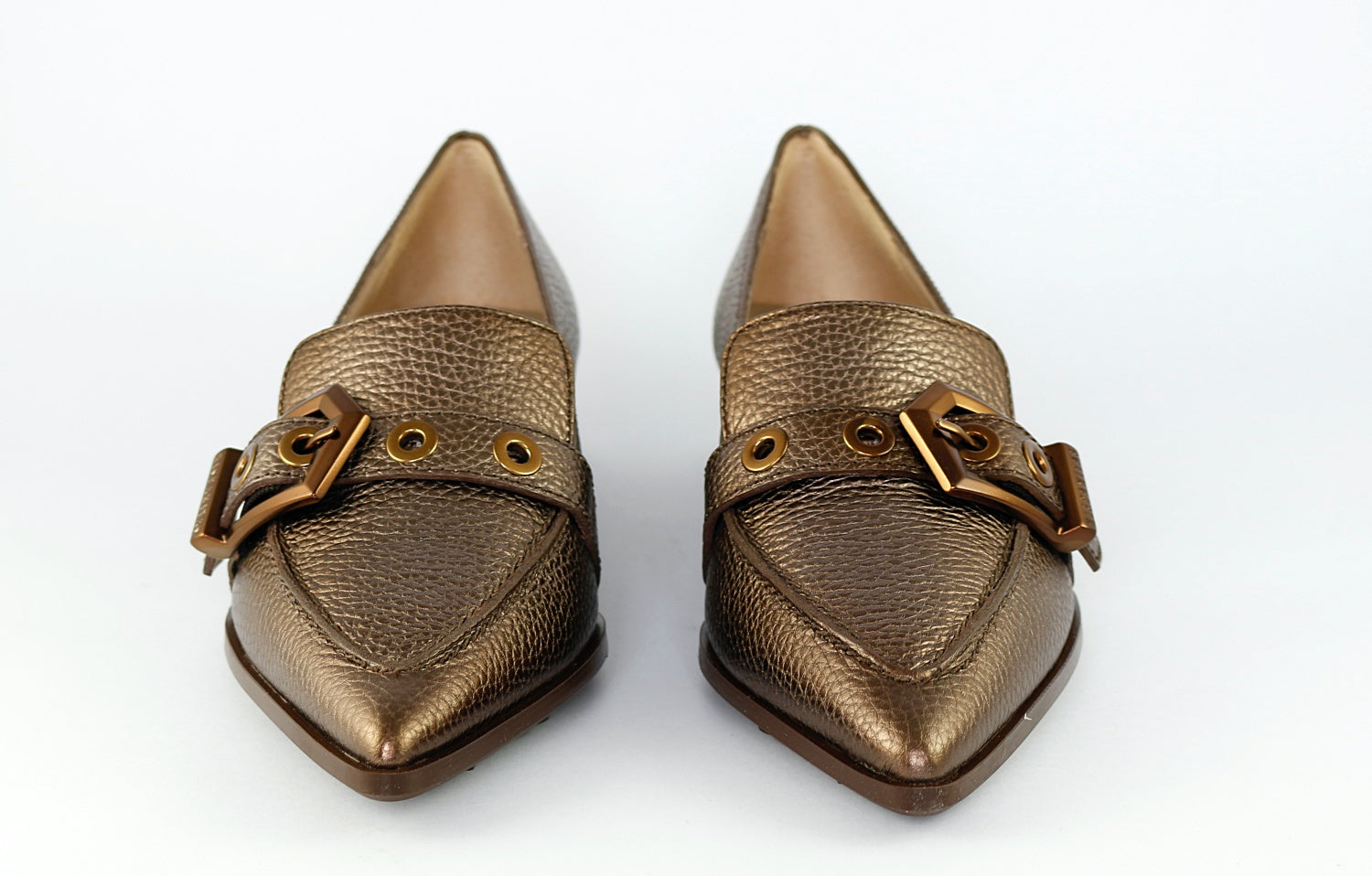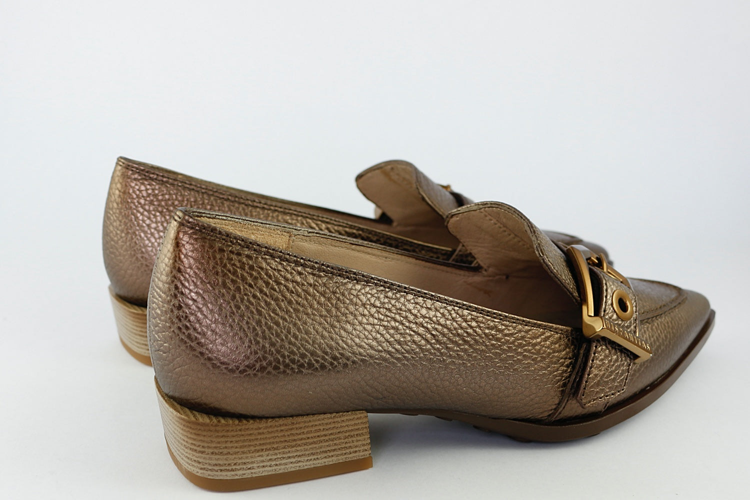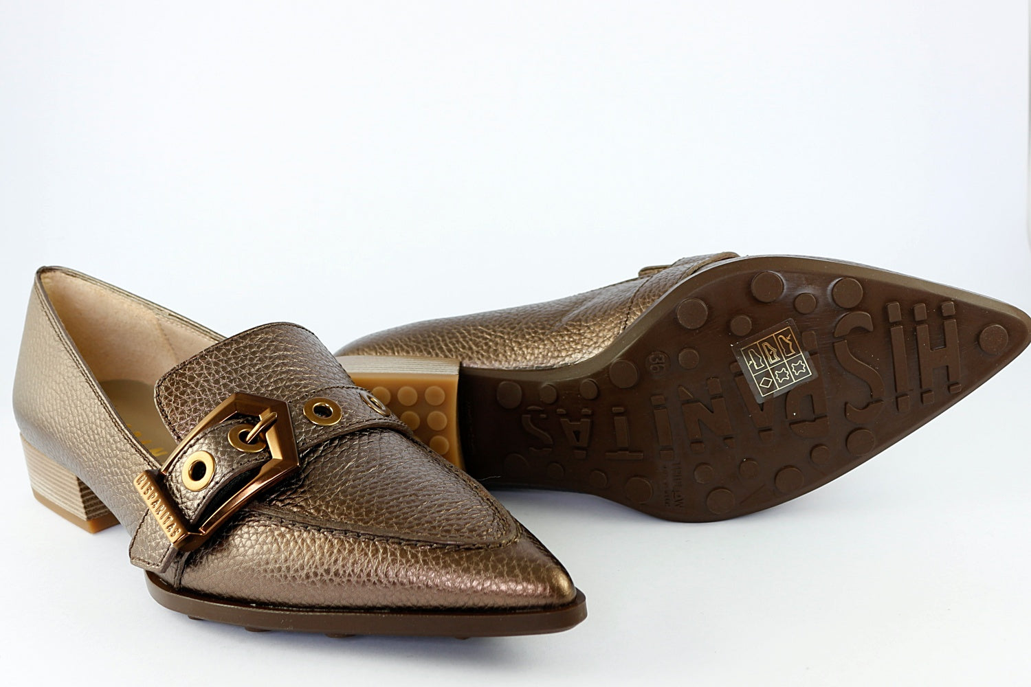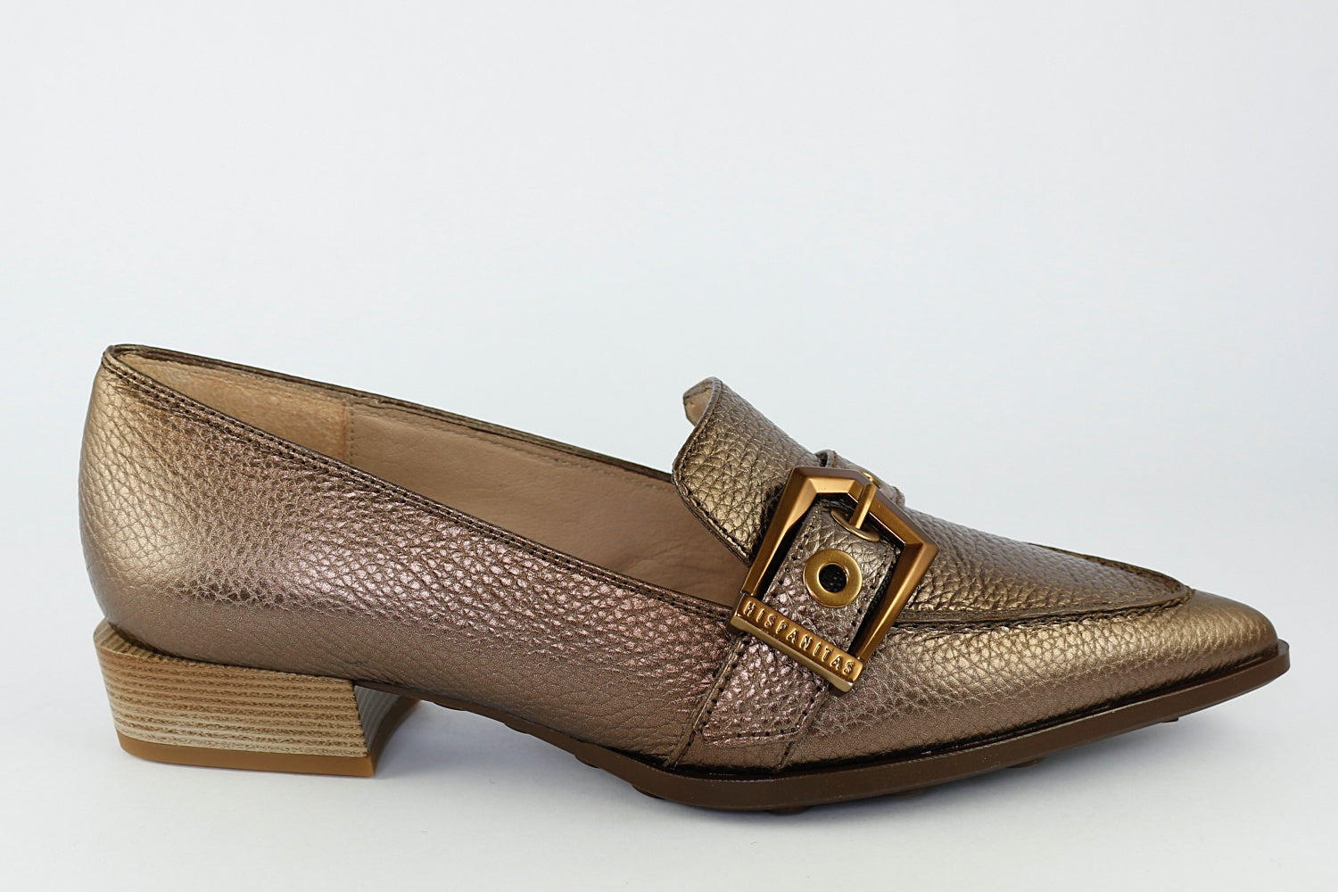 Hispanitas' 'Barcelona' in Bronze is a stunning pointed loafer in a textured leather, perfect for dressing up a classic outfit. It has a decorative buckle and a very small heel.