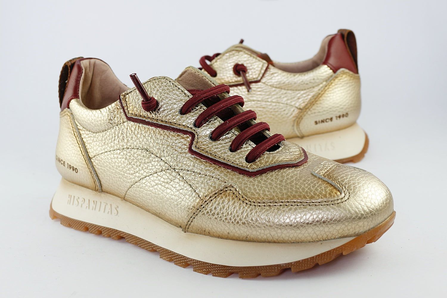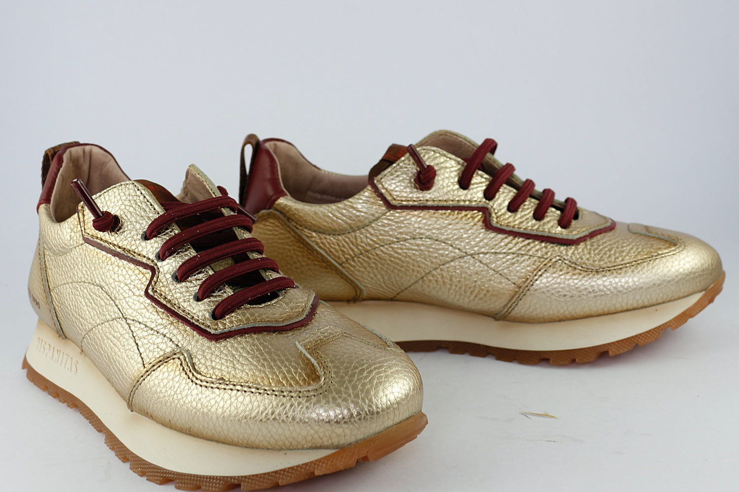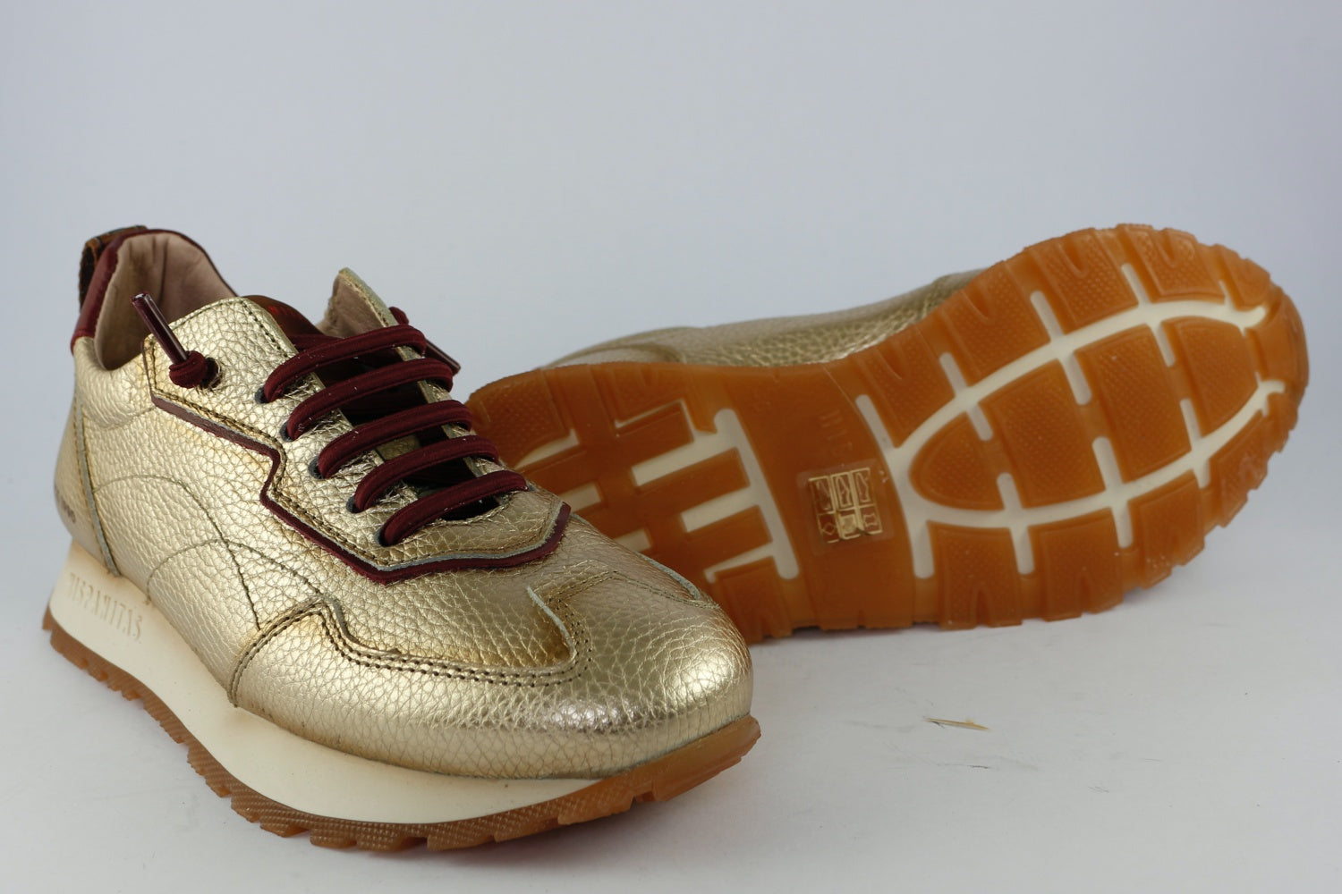 The Hispanitas 'San Sebastian' trainer is a fantastic combination of gold leather with a bordeaux wine ankle, bordeaux detailing and non-tie laces. Another pair of longer laces in taupe are also supplied for those times you wish to tie up. The slip-on trainer has a slight wedge to provide height, cushioning and non-slip grip. Ideal for daily use in the city, but beautiful enough to wear out at night.