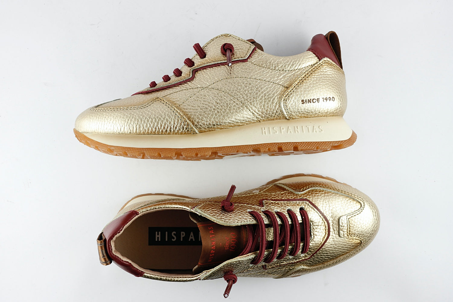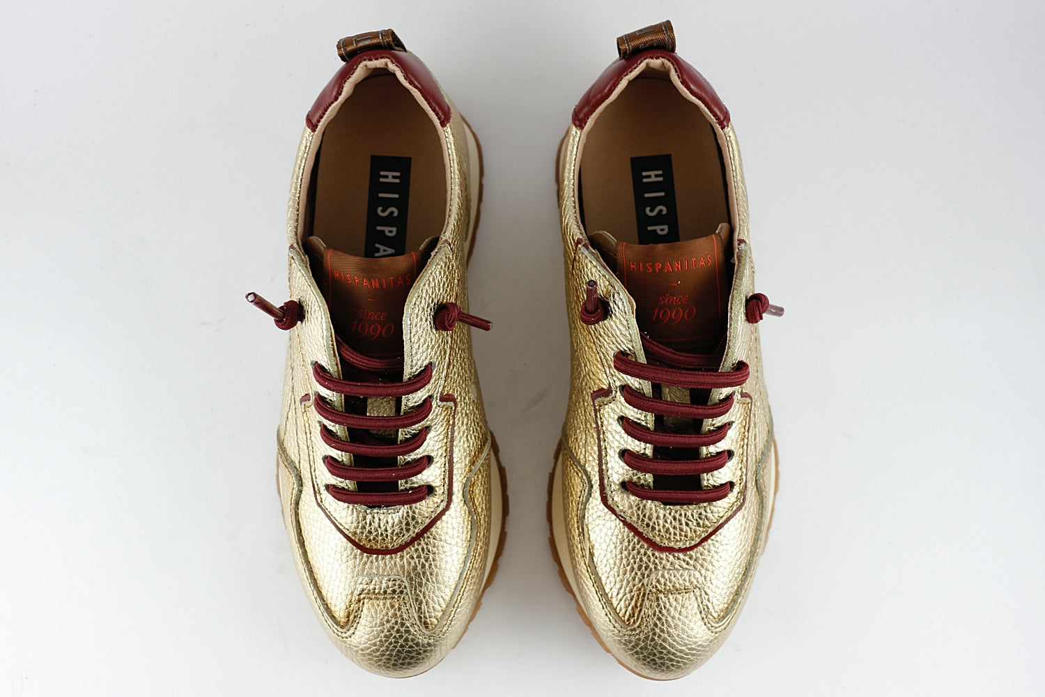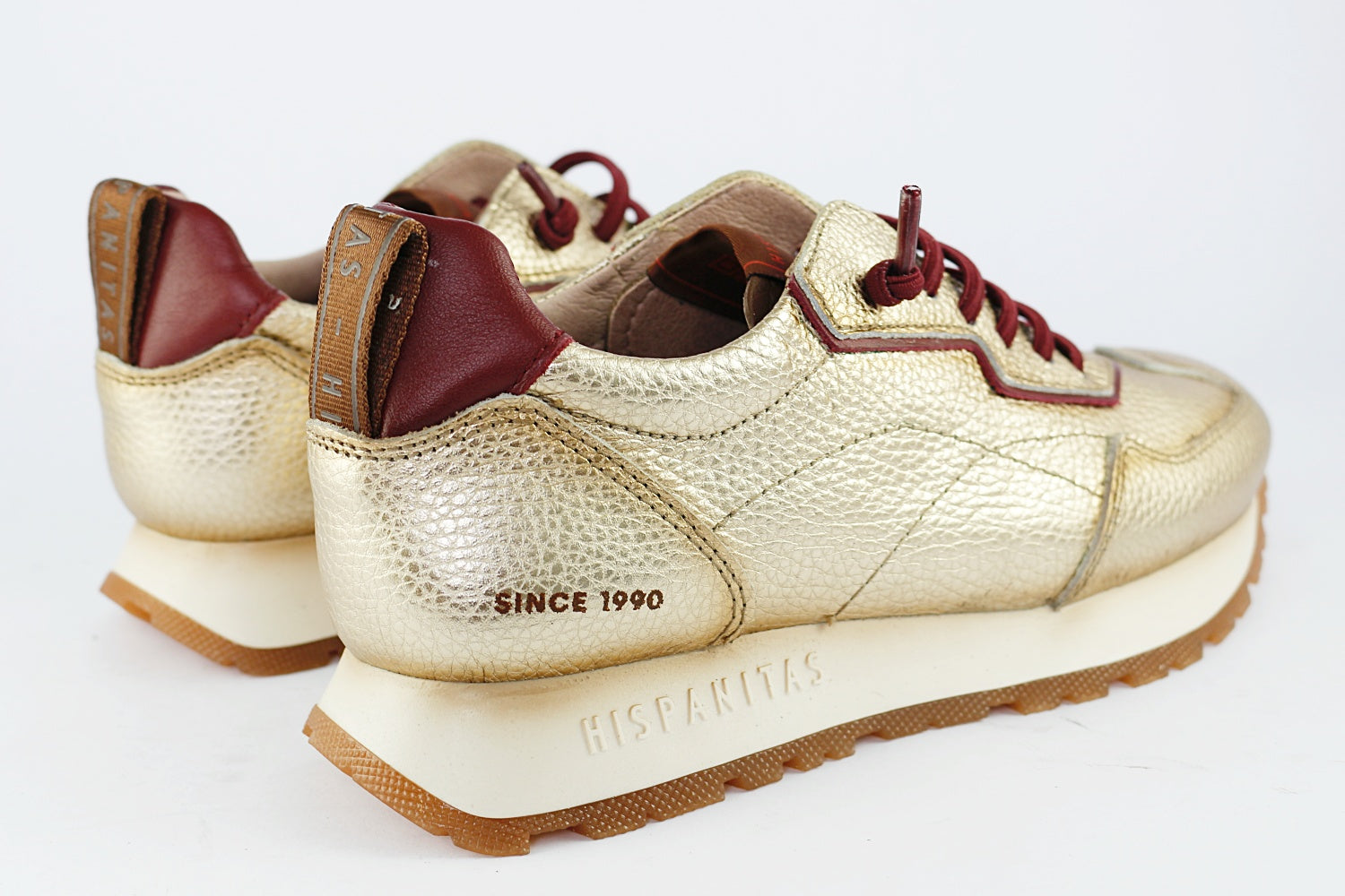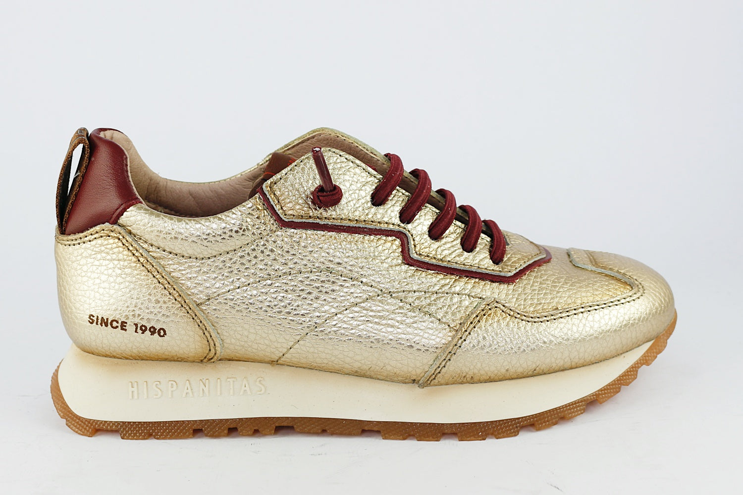 The Hispanitas 'San Sebastian' trainer is a fantastic combination of gold leather with a bordeaux wine ankle, bordeaux detailing and non-tie laces. Another pair of longer laces in taupe are also supplied for those times you wish to tie up. The slip-on trainer has a slight wedge to provide height, cushioning and non-slip grip. Ideal for daily use in the city, but beautiful enough to wear out at night.