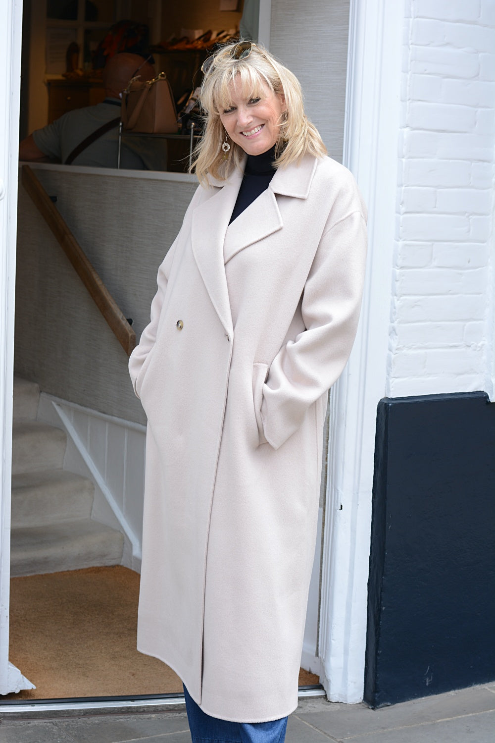 Lu Li Lina 'Georgia' is a super-soft, standout coat in Ecru (somewhere between ivory and taupe). It is double-breasted with two deep side pockets.