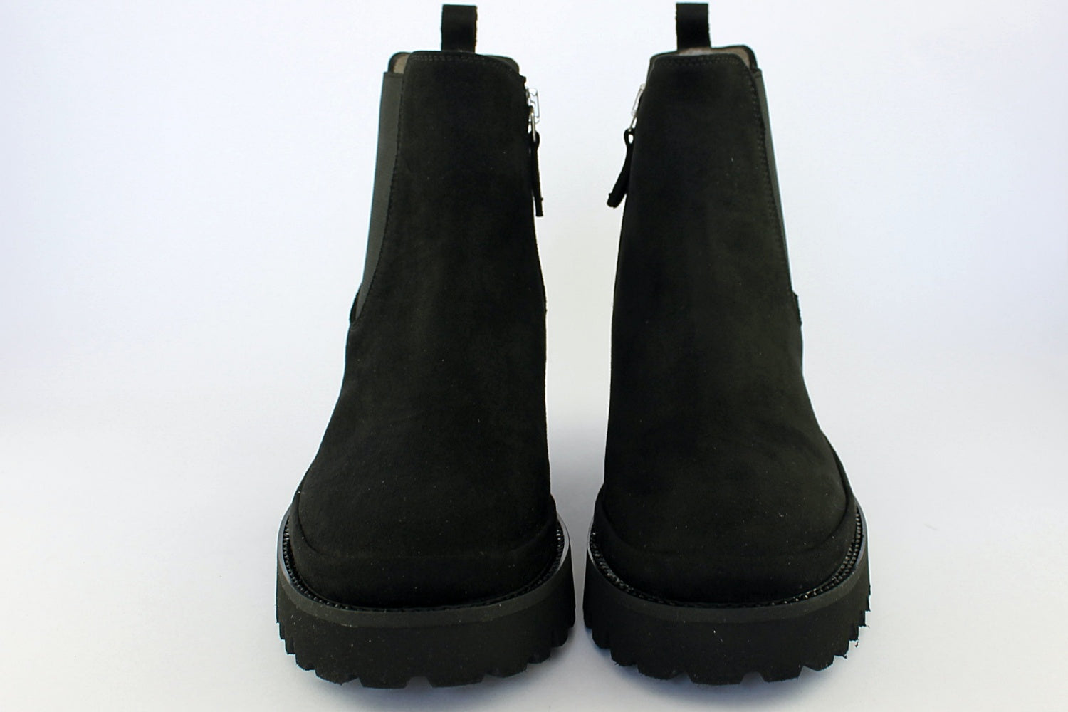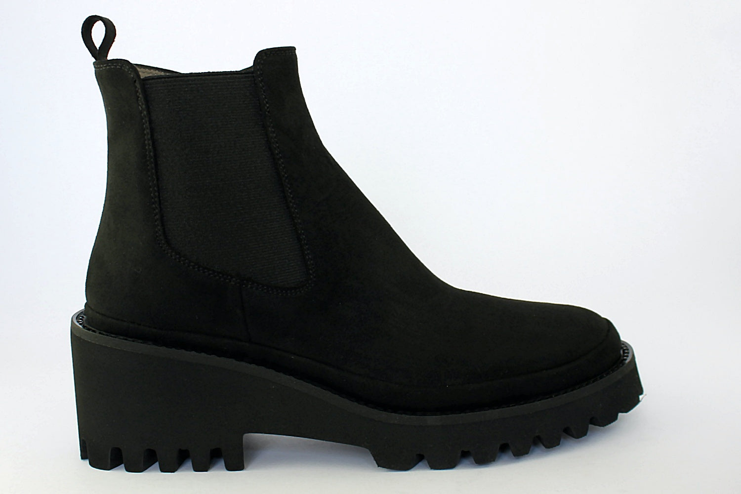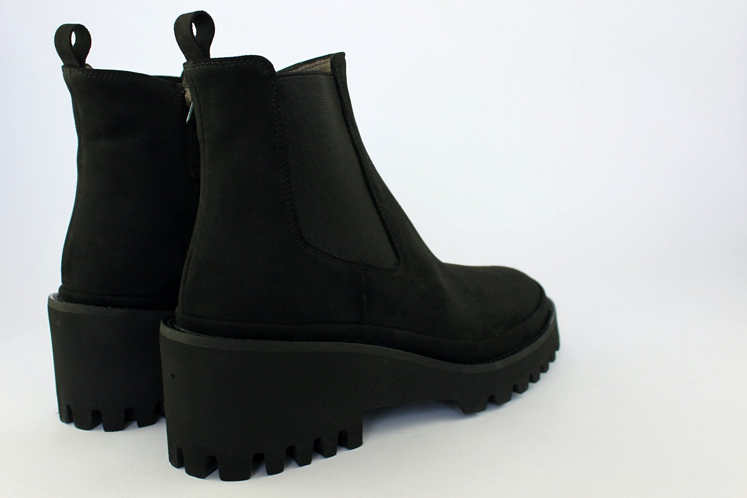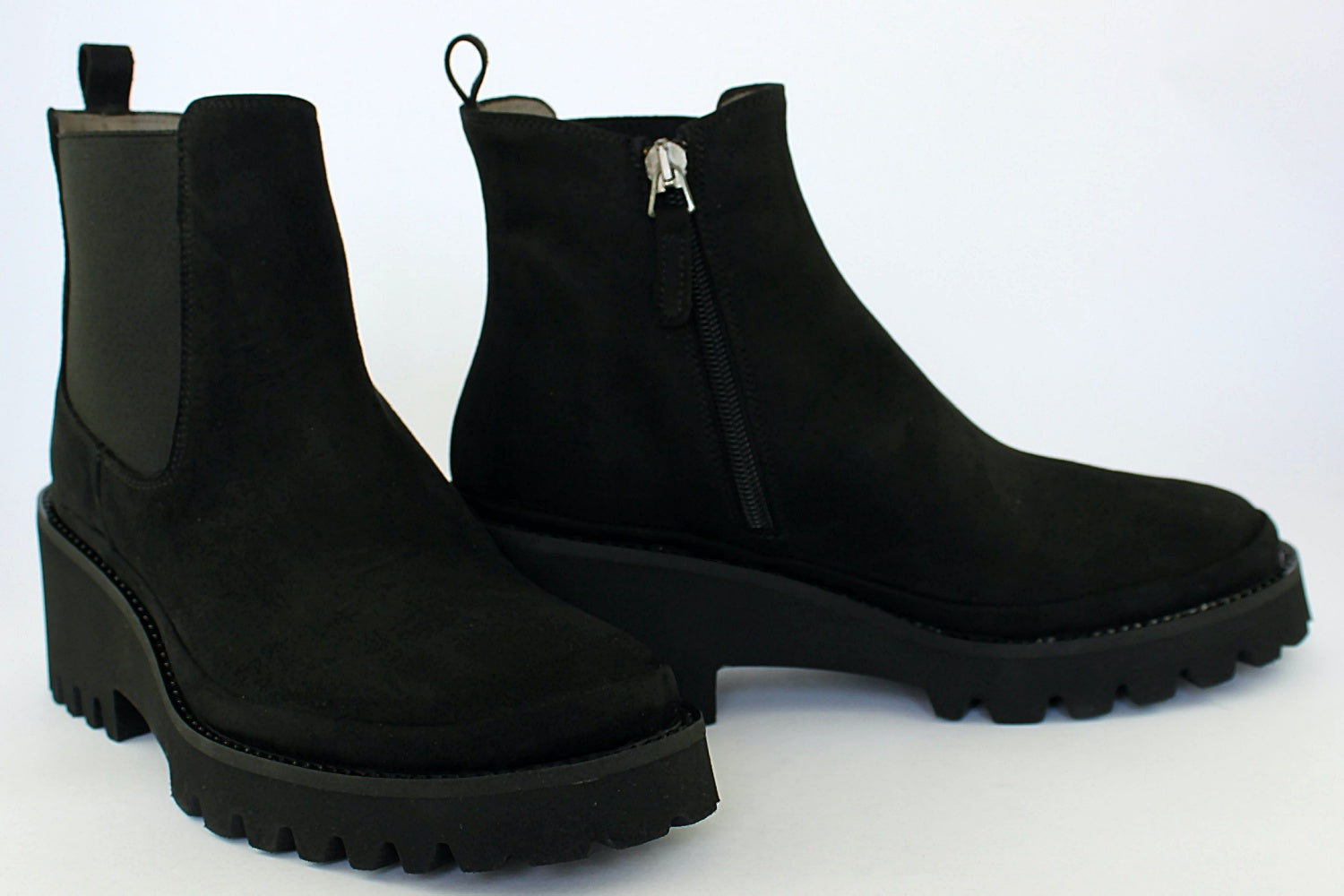 The 'London' is Alexandra's iconic ankle boot on a black wedge. This version comes in Black suede with a complementary coloured fabric stretch side panel, side zip and black diamante studs. Leather-lined. Super light.