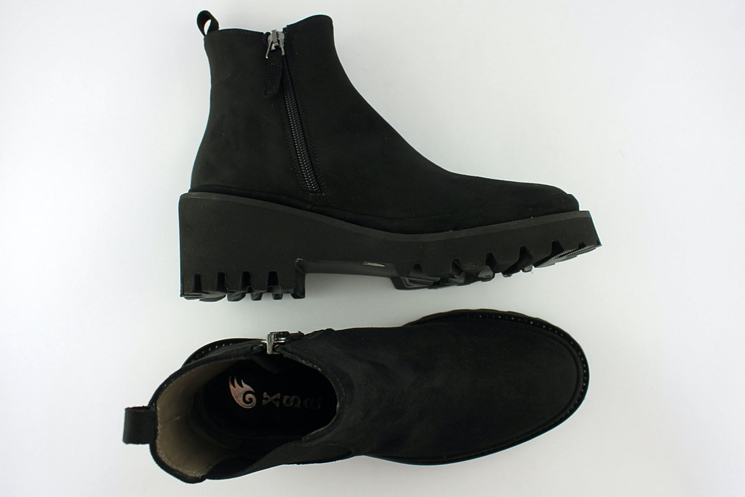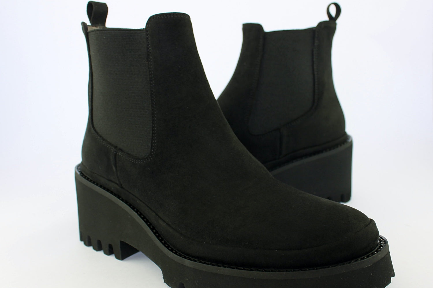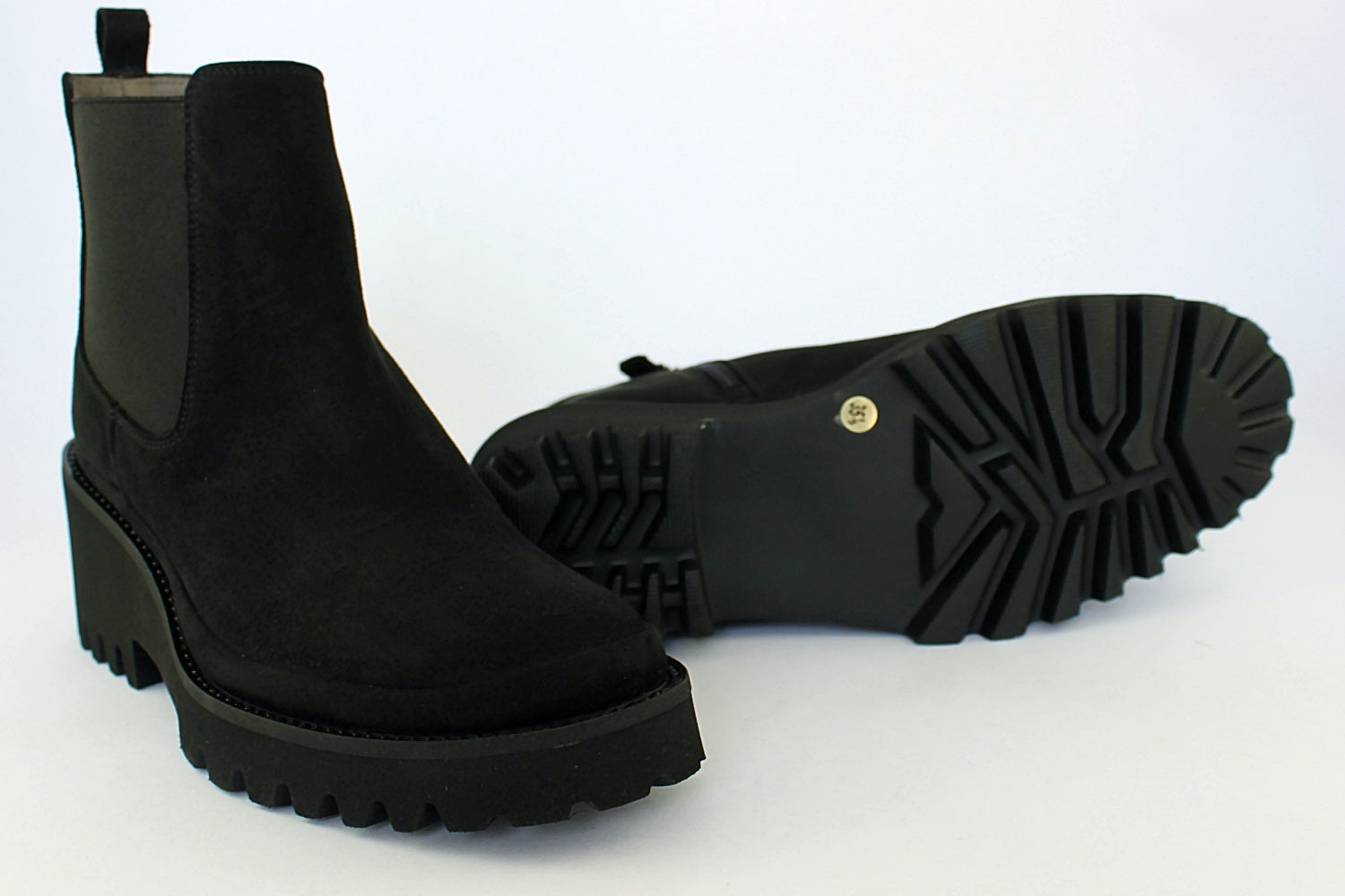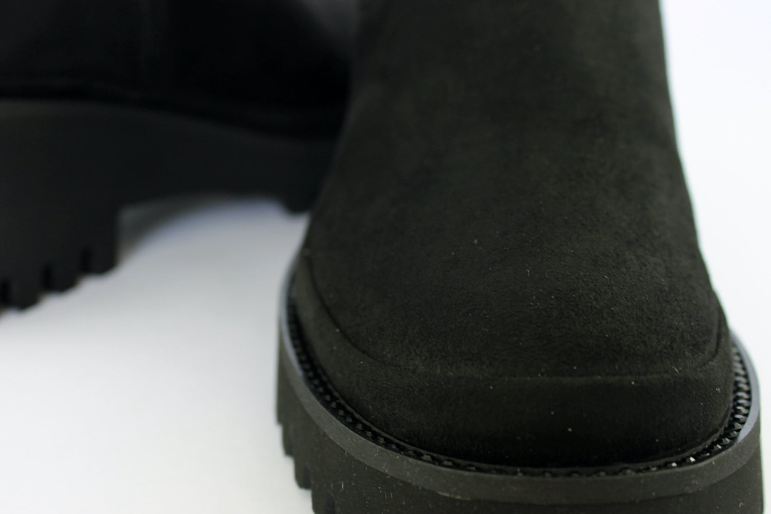 The 'London' is Alexandra's iconic ankle boot on a black wedge. This version comes in Black suede with a complementary coloured fabric stretch side panel, side zip and black diamante studs. Leather-lined. Super light.