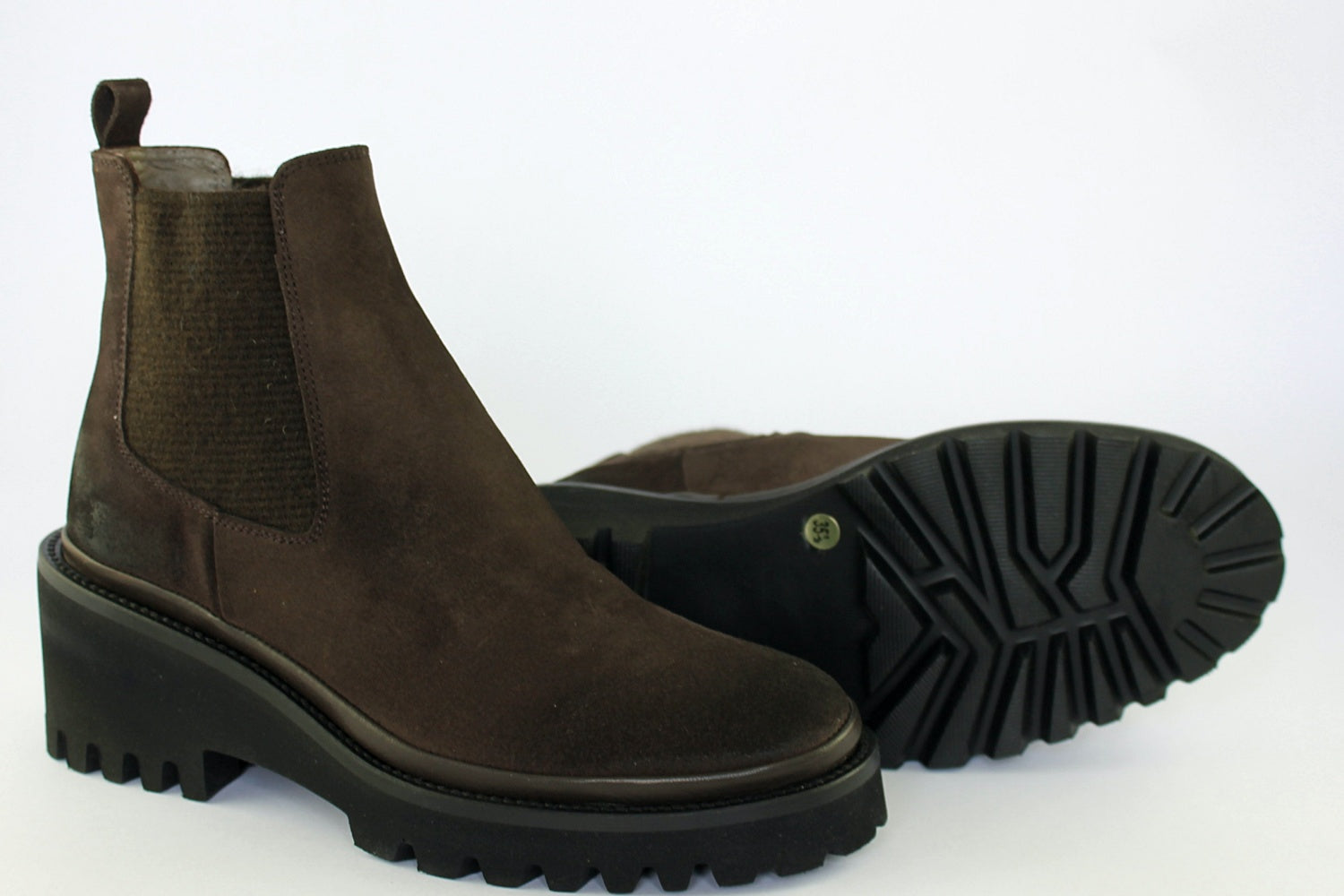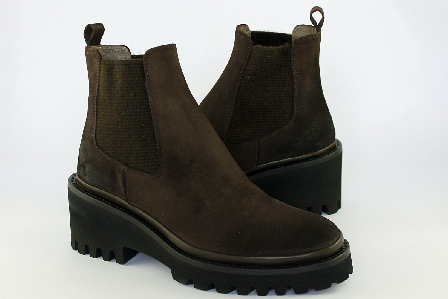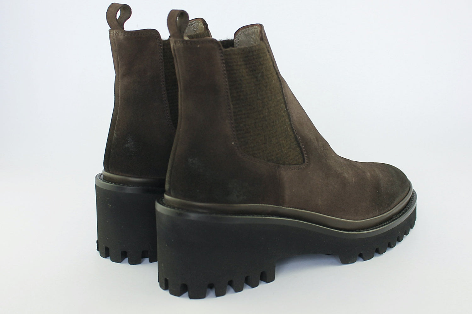 The 'London' is Alexandra's iconic ankle boot on a black wedge. This version comes in Brown suede with a complementary coloured woollen stretch side panel. It is a pull-on boot and is leather-lined. Super light.