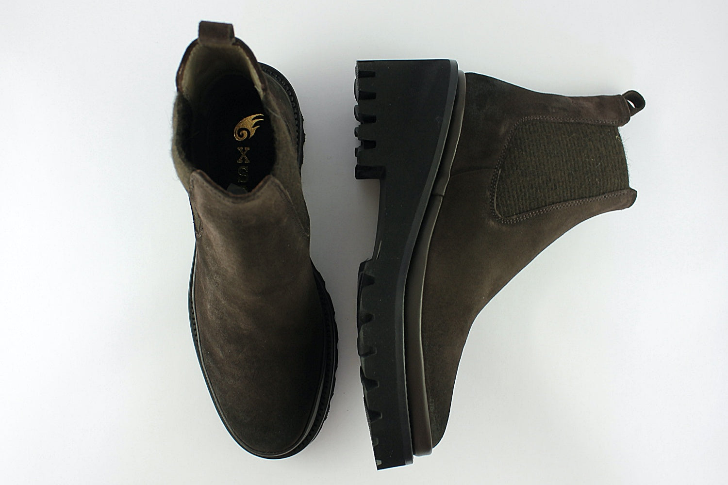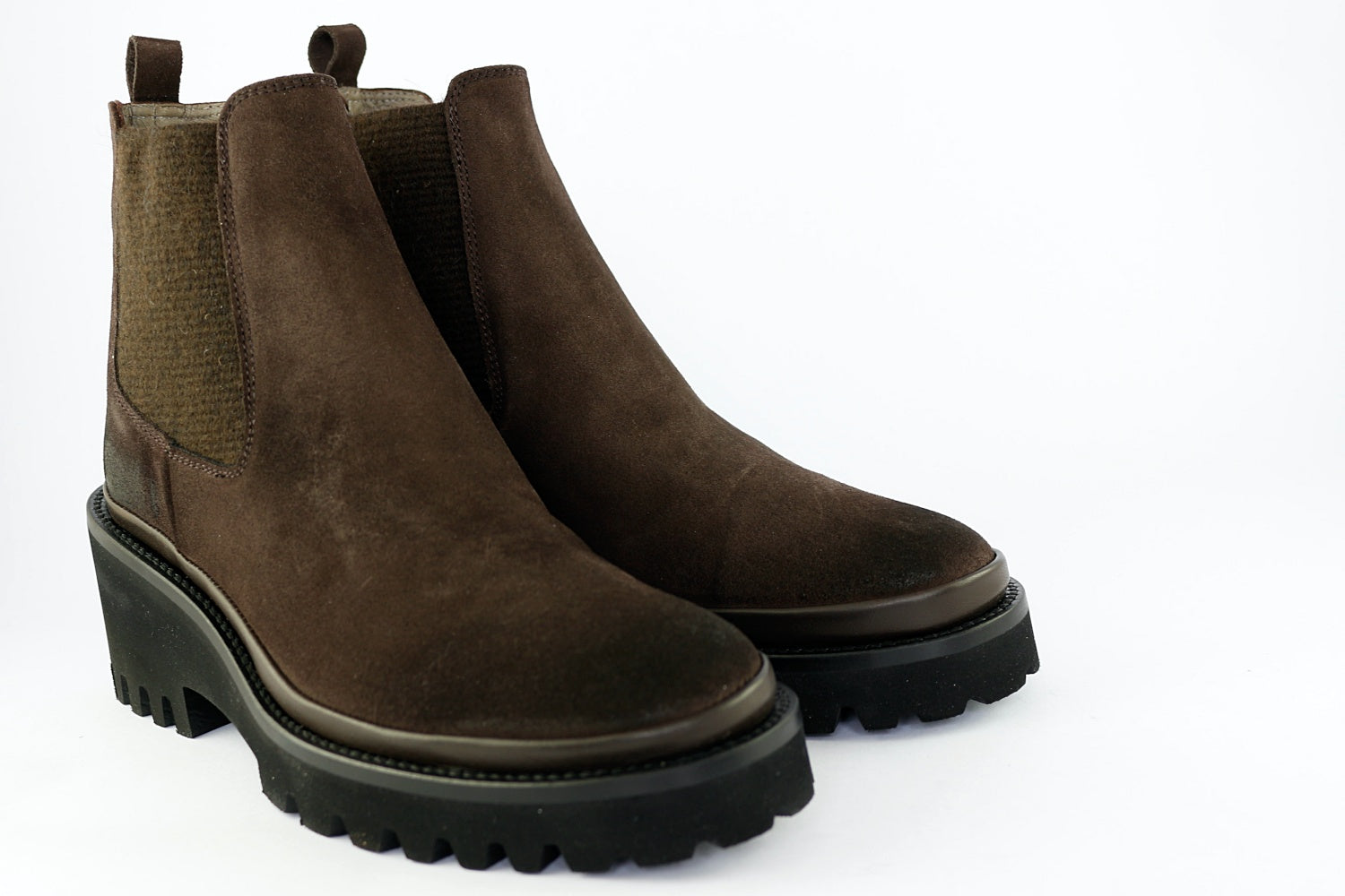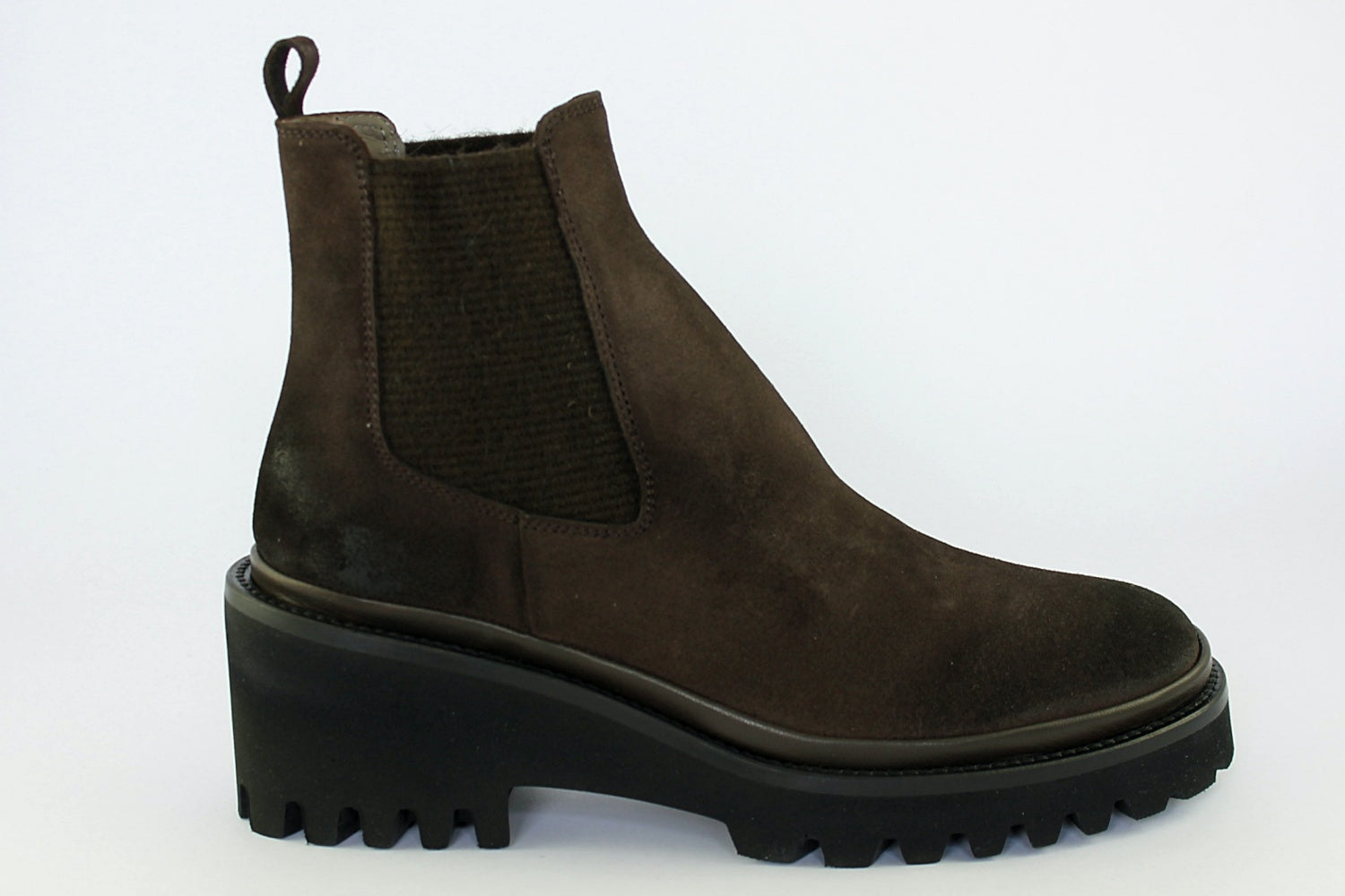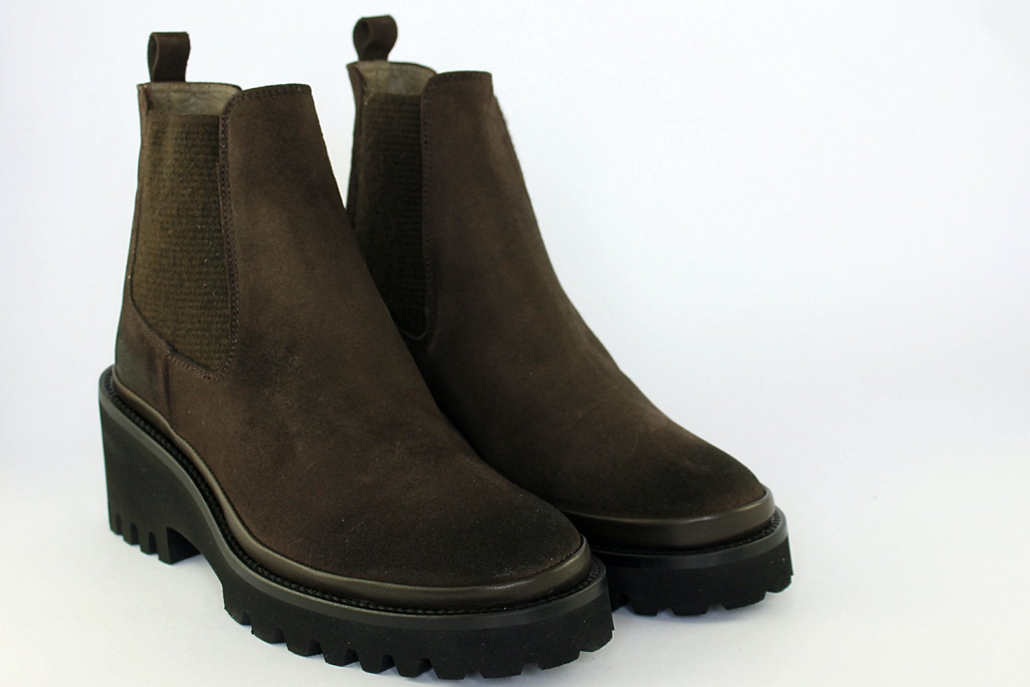 The 'London' is Alexandra's iconic ankle boot on a black wedge. This version comes in Brown suede with a complementary coloured woollen stretch side panel. It is a pull-on boot and is leather-lined. Super light.