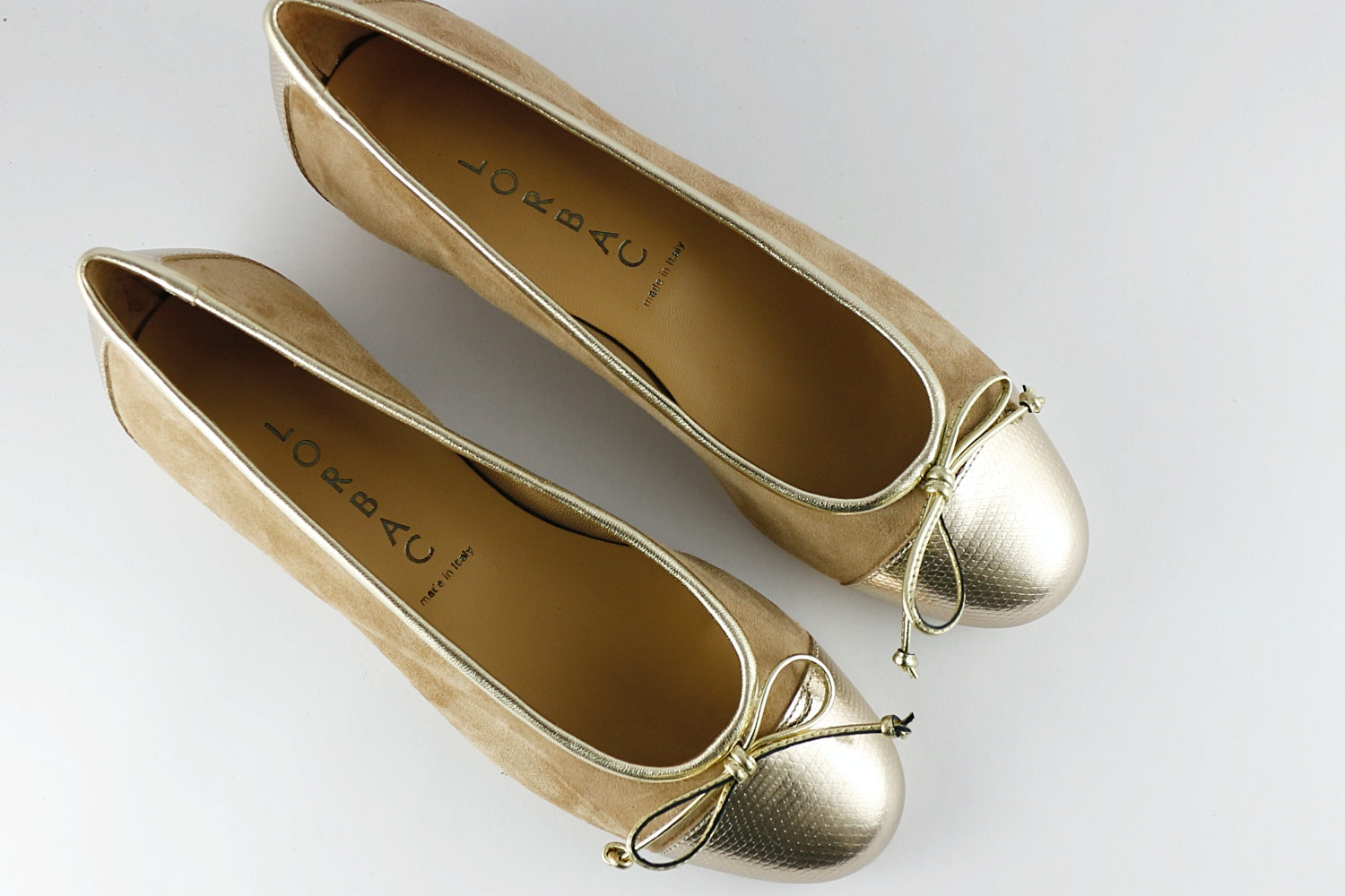 Lorbac 'Urbino' ballet flat in biscuit-coloured suede has a gold textured leather toe, trim, heel and small bow. Timeless elegance.