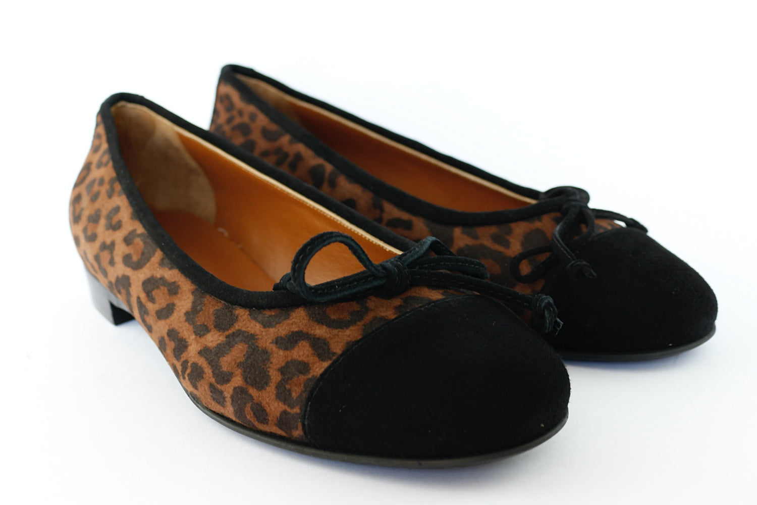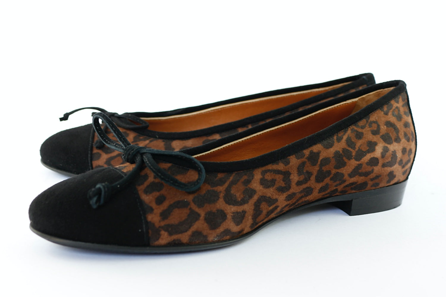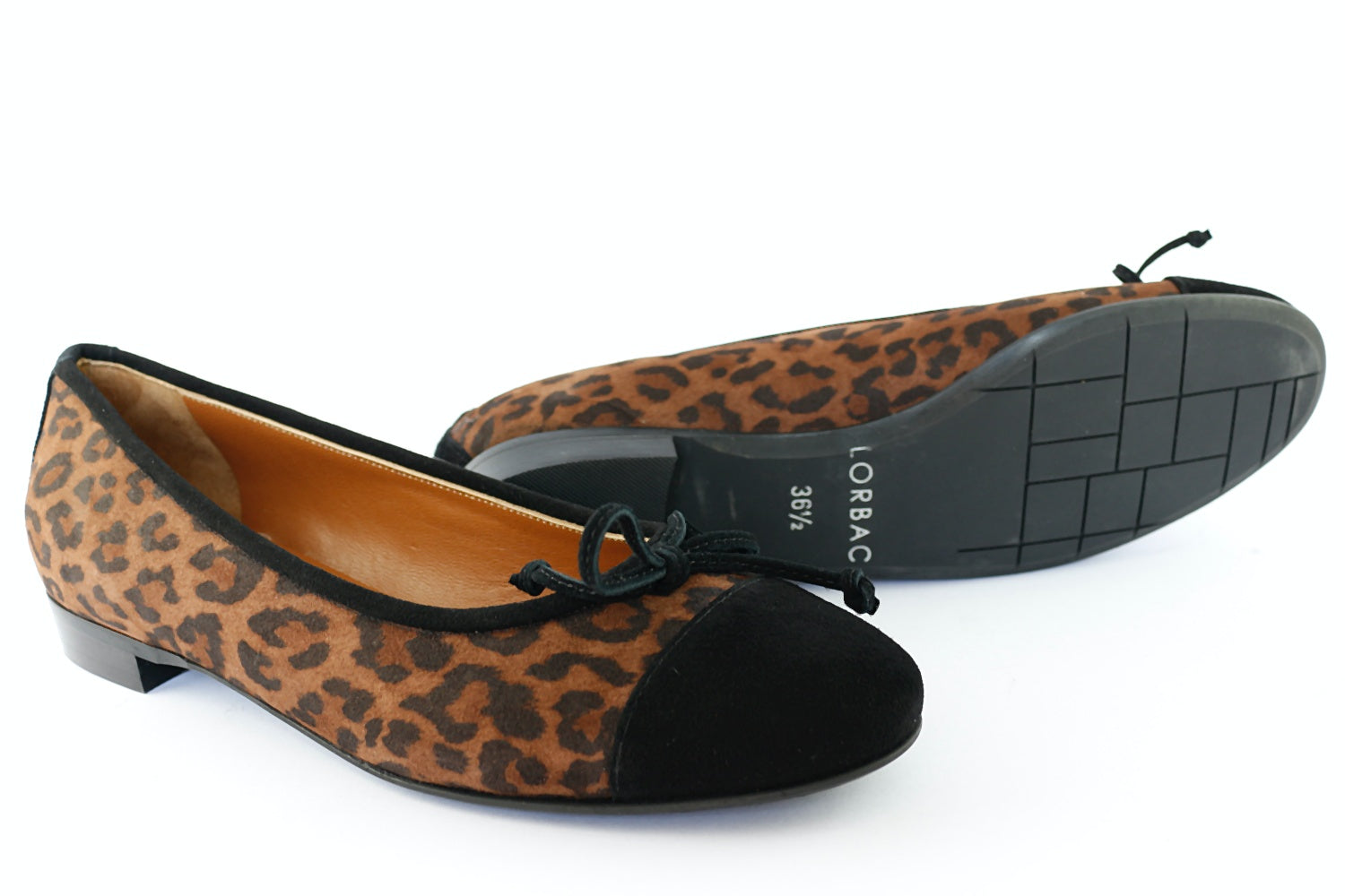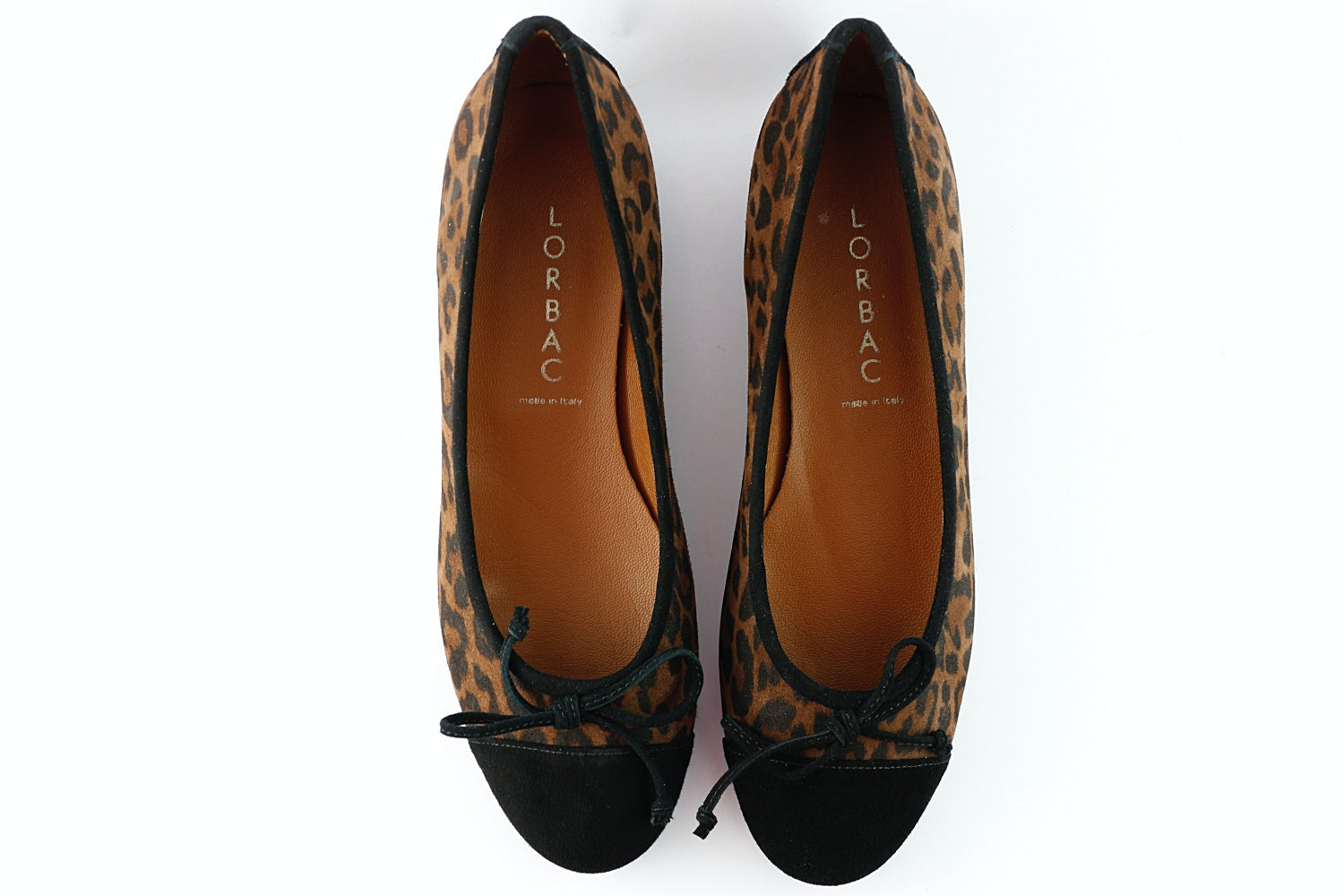 The Lorbac 'Messina' ballet pump has a brown and black suede leopard print body with a black suede trim, heel, toe and bow. Gorgeous.