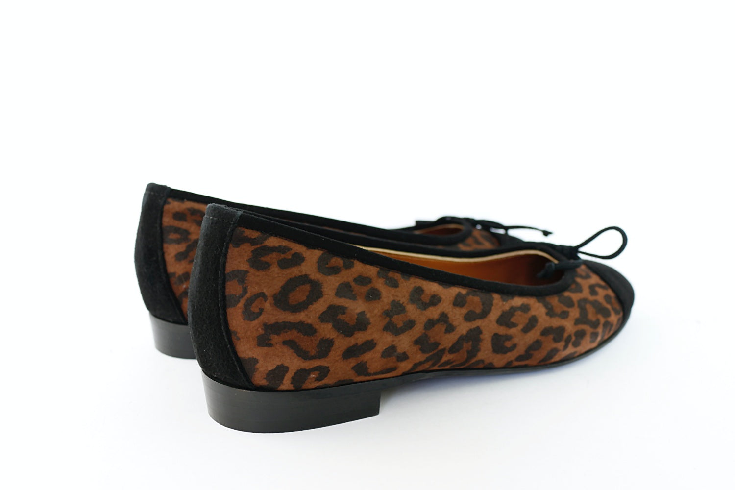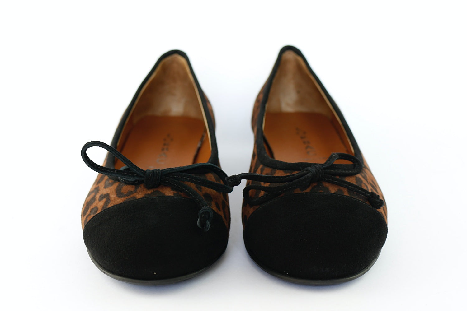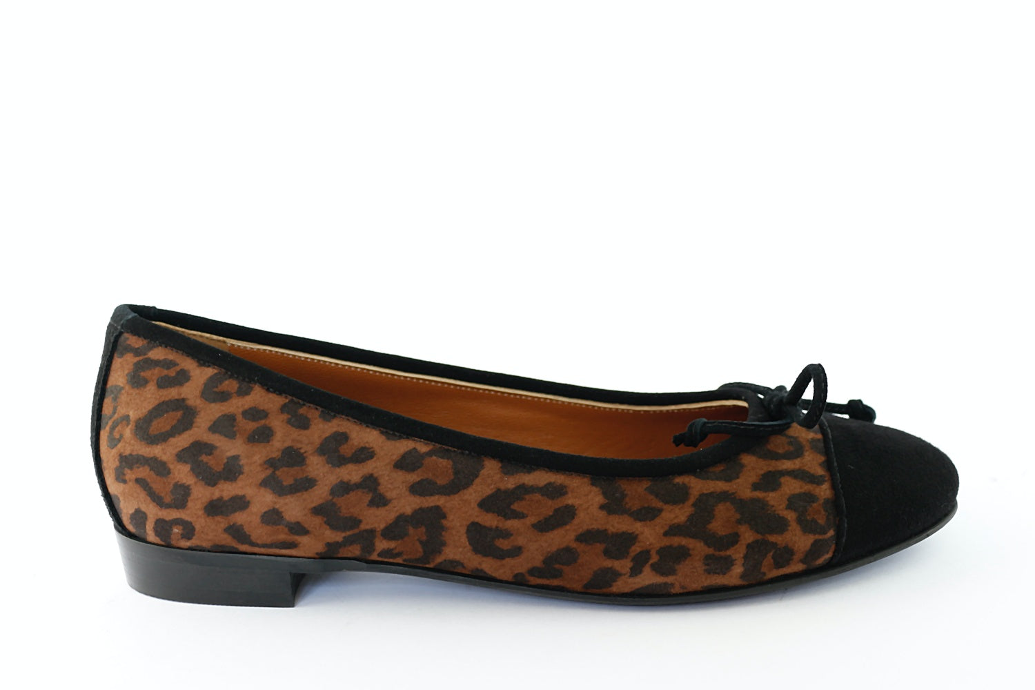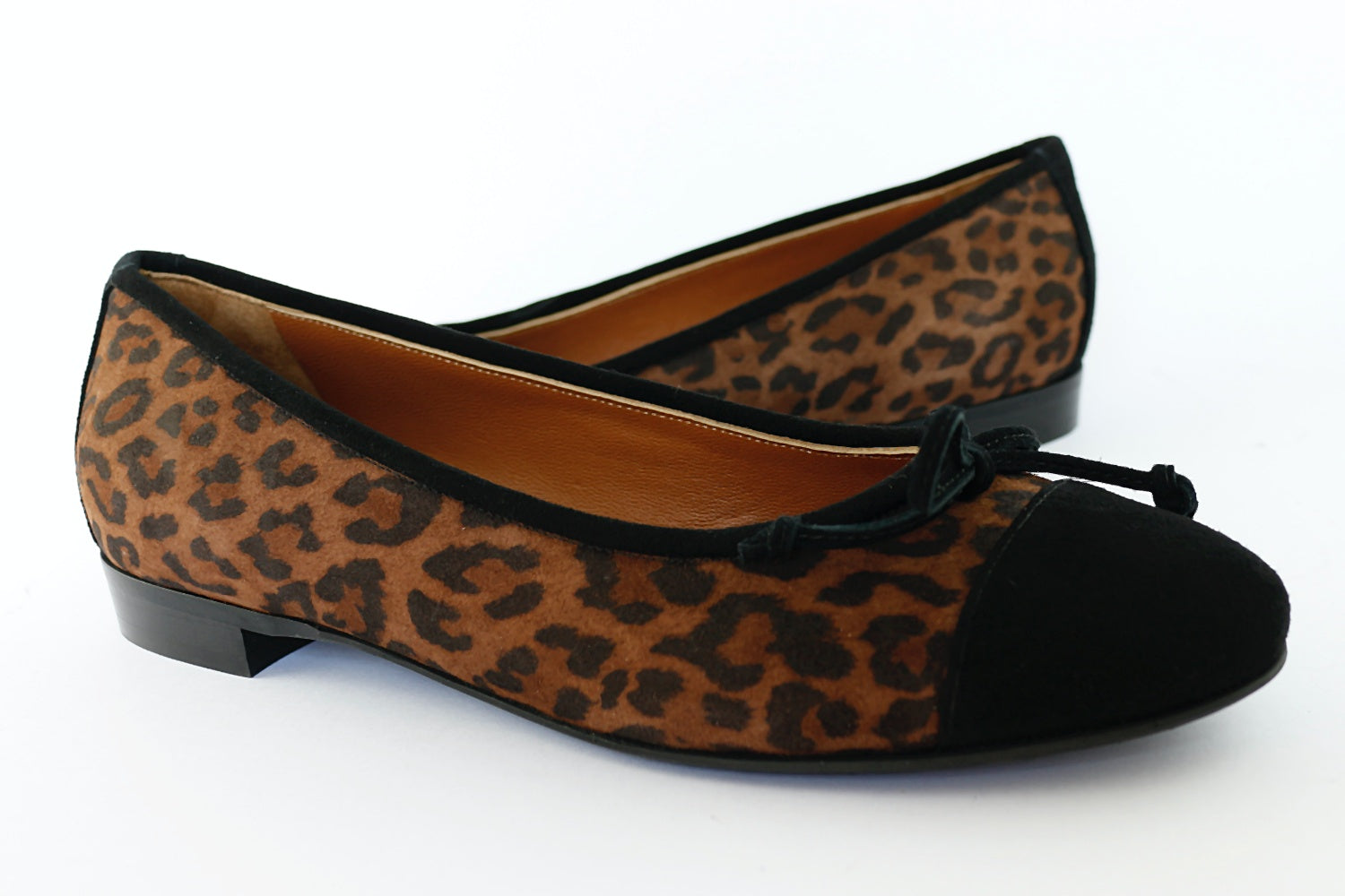 The Lorbac 'Messina' ballet pump has a brown and black suede leopard print body with a black suede trim, heel, toe and bow. Gorgeous.