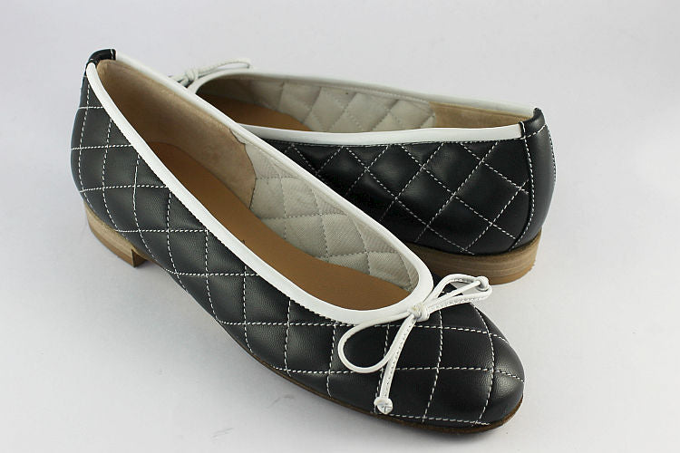 Lorbac quilted navy leather ballet pump, with a white trim, on a leather and rubber sole.