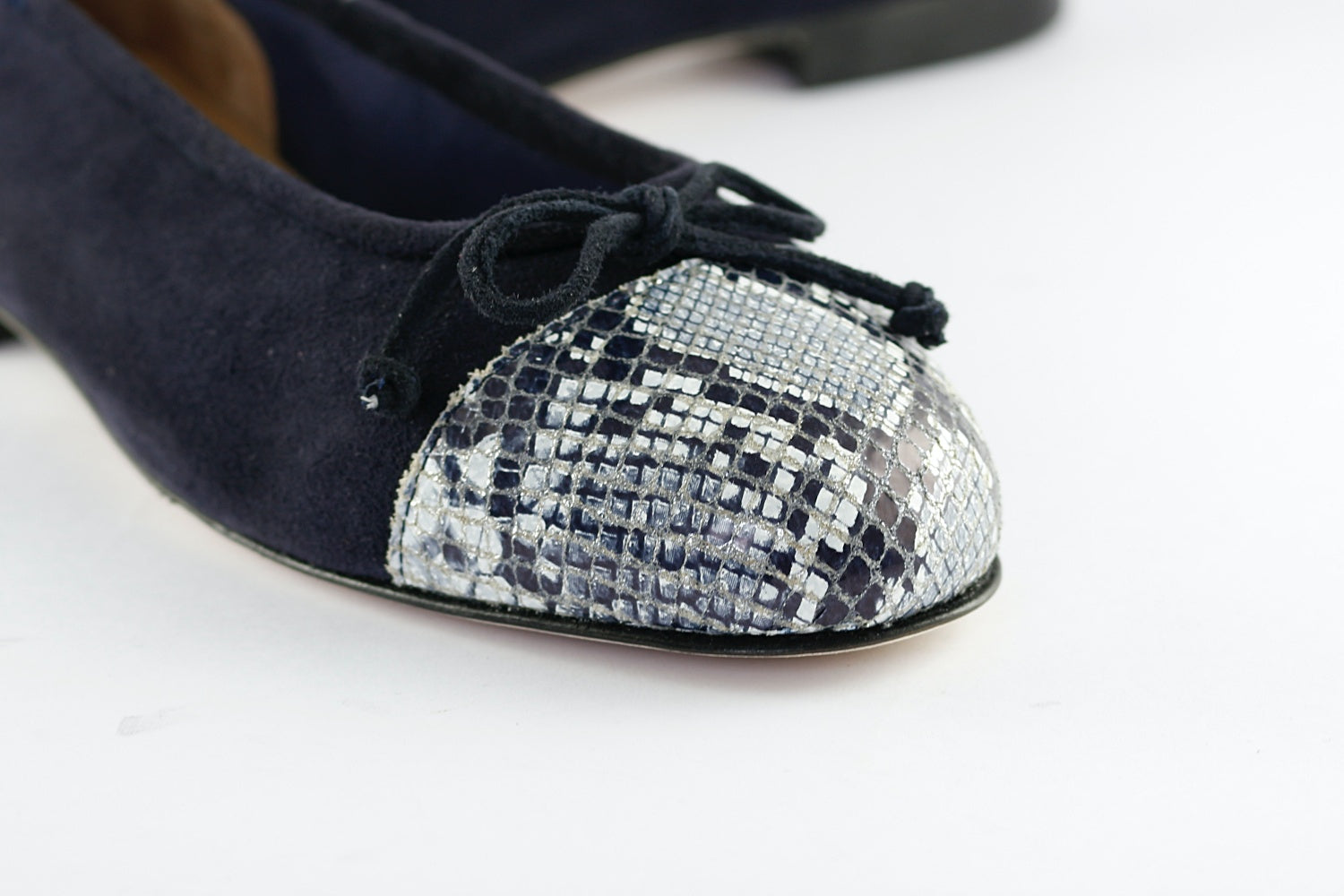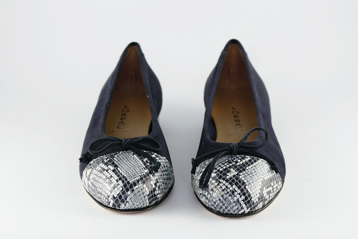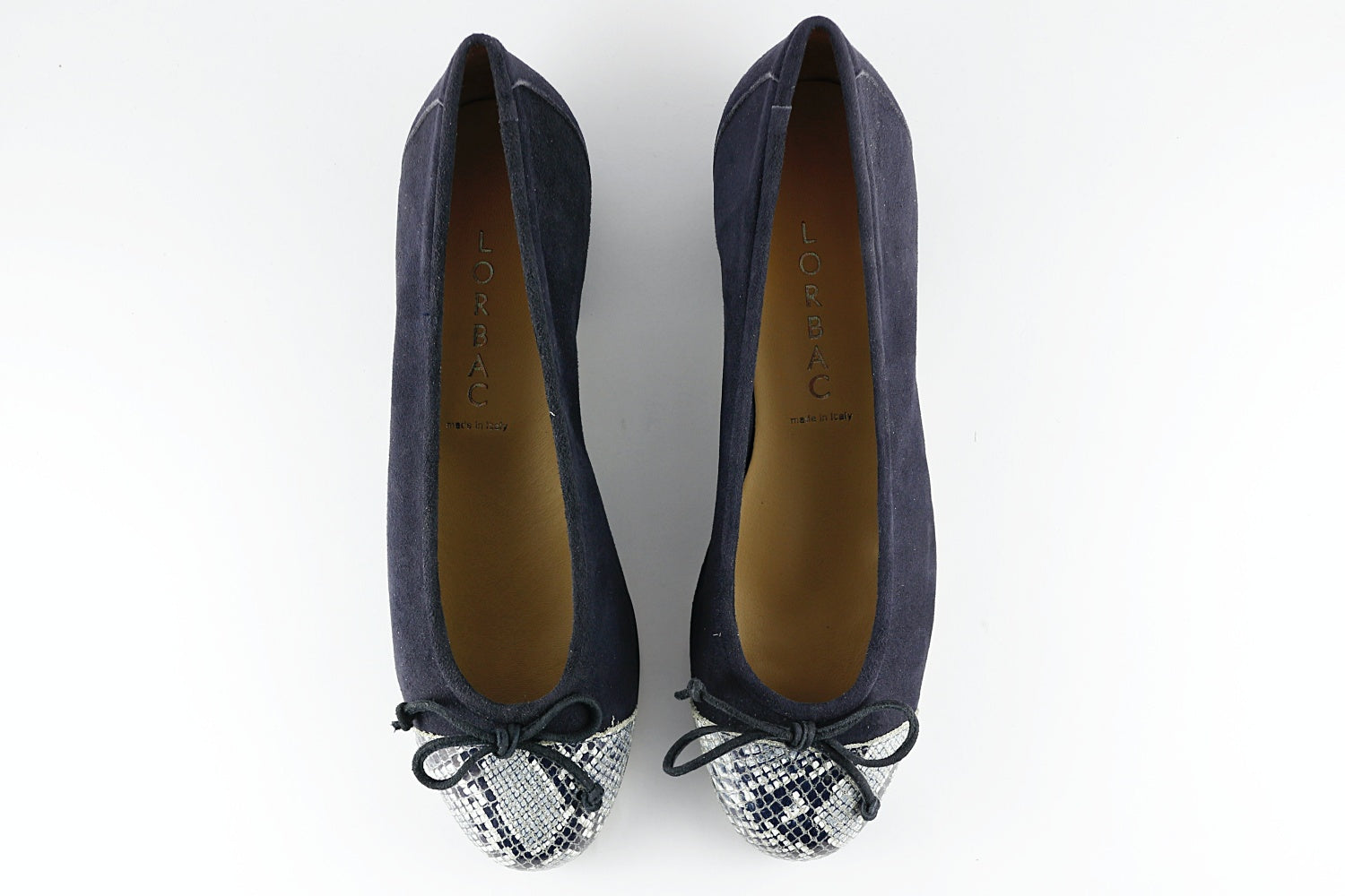 Lorbac 'Oristano' navy suede ballet flat with a snakeskin print leather toe and navy suede bow. Timeless.