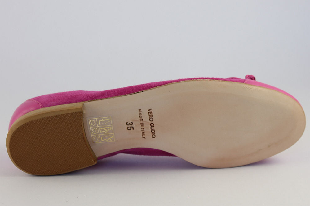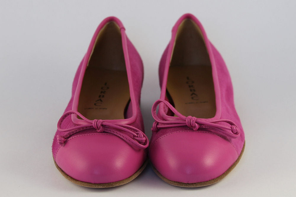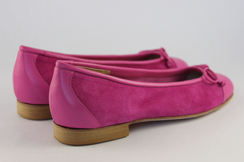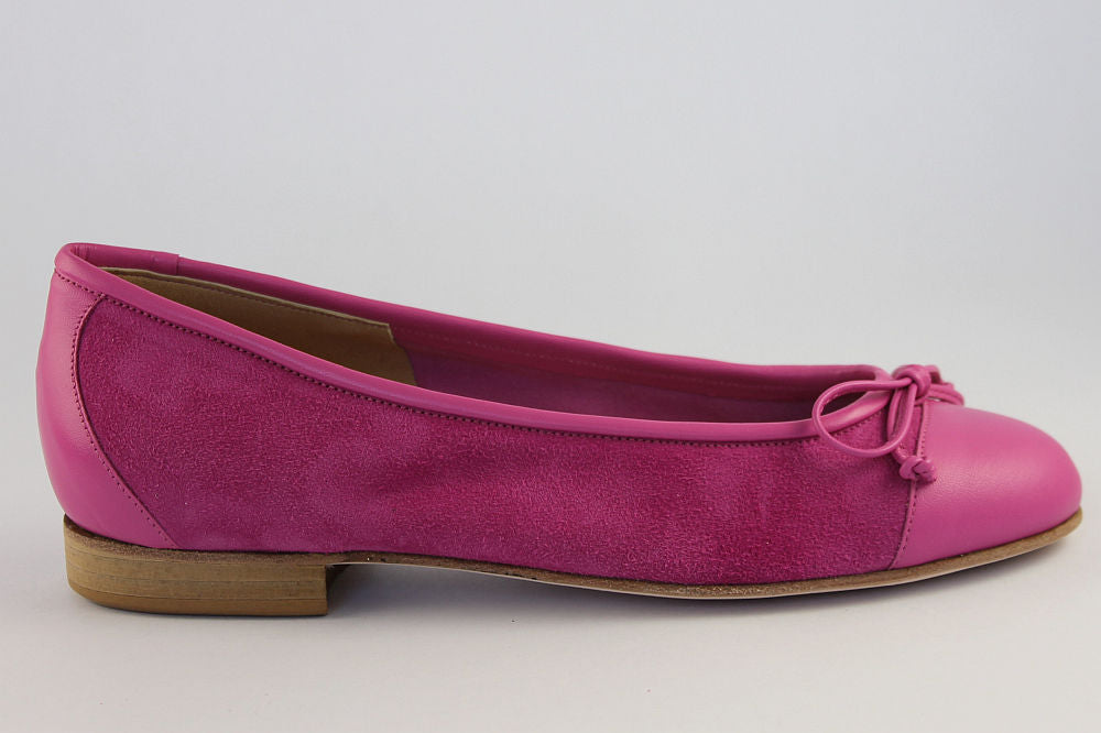 Lorbac 'Padua' hot pink suede ballet flat with a hot pink leather toe and heel and bow.