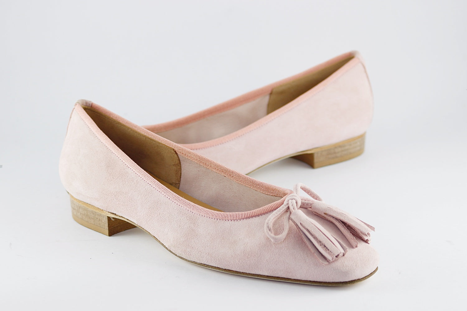 Lorbac 'Valdarno' soft dusky pink suede ballet flat with a suede tassel bow, a brighter pink fabric trim and a squared-off toe. Exquisite.
