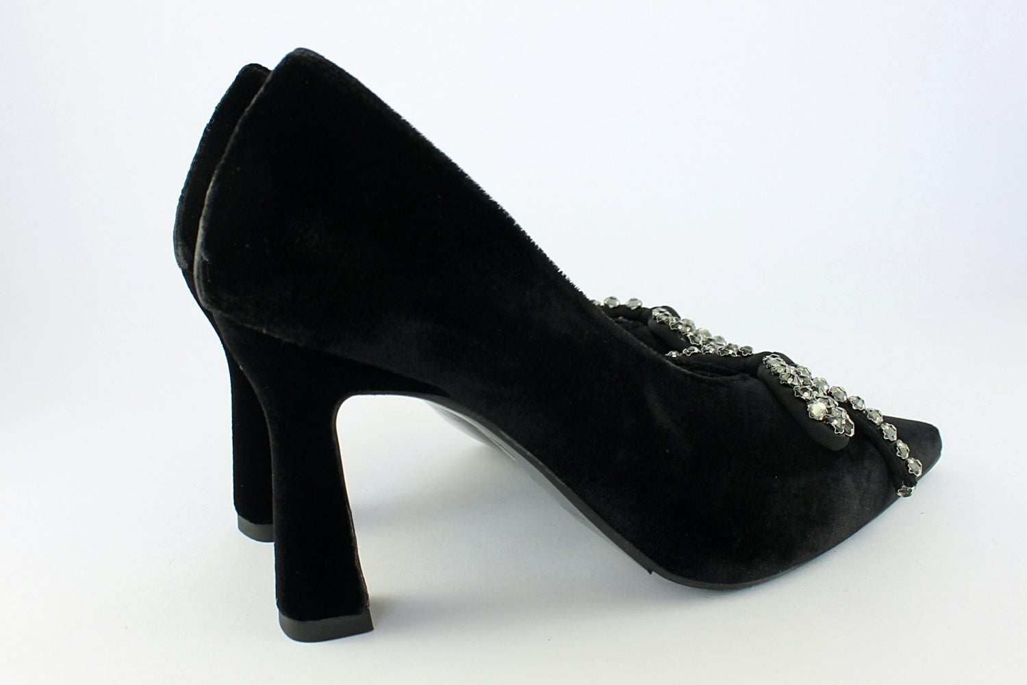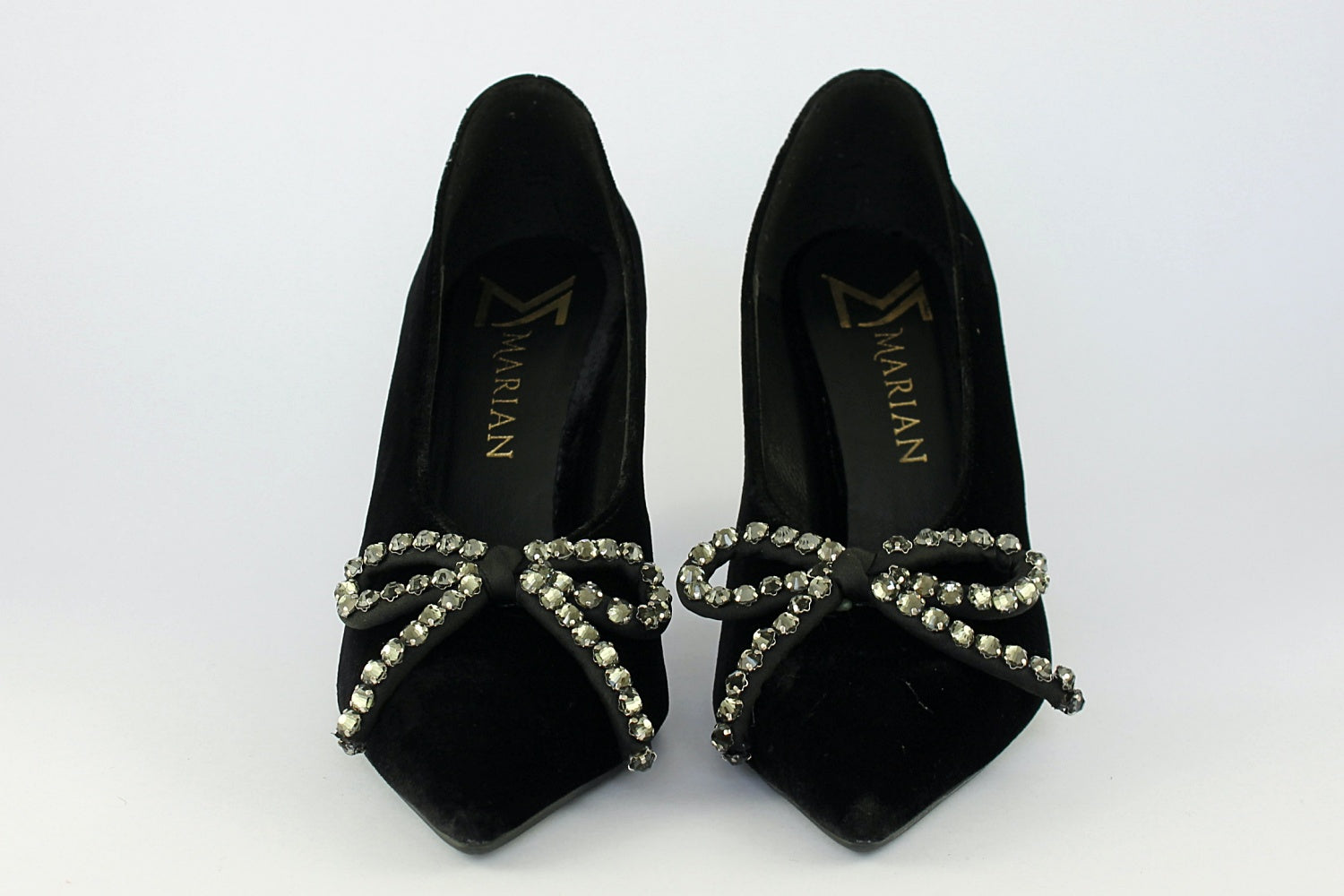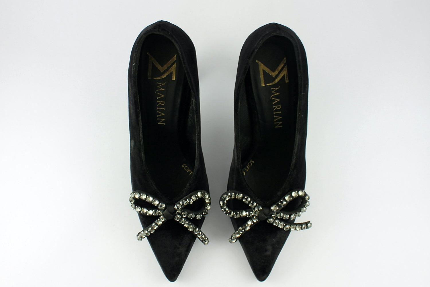 Marian's 'Lucinda' is the ultimate evening shoe - black velvet with a diamond bow, pointed toe and a 9 cm covered heel. This creates a beautiful shape on the foot and will be your go-to for every party or event.