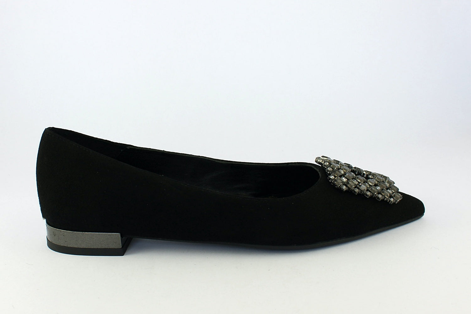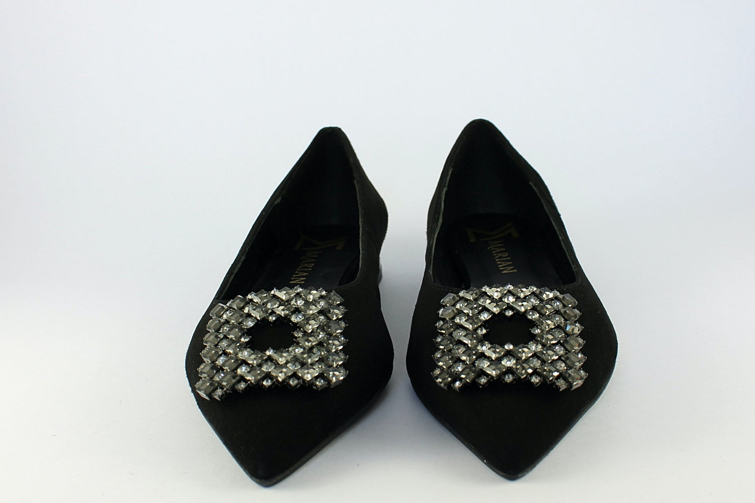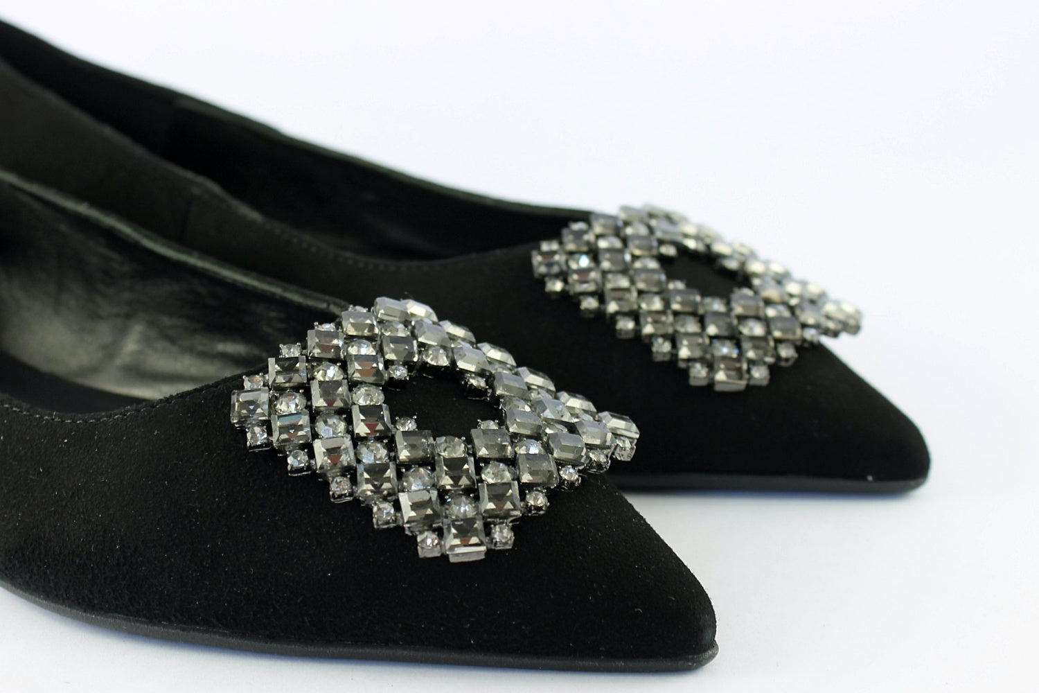 Marian's 'Cicely' flat court shoe in Black suede has a beautiful square 'diamond' buckle with a diamond-shaped open middle to reveal the fabric of the shoe. These are evening shoes for those who like flats. Leather-lined with a rubber sole.