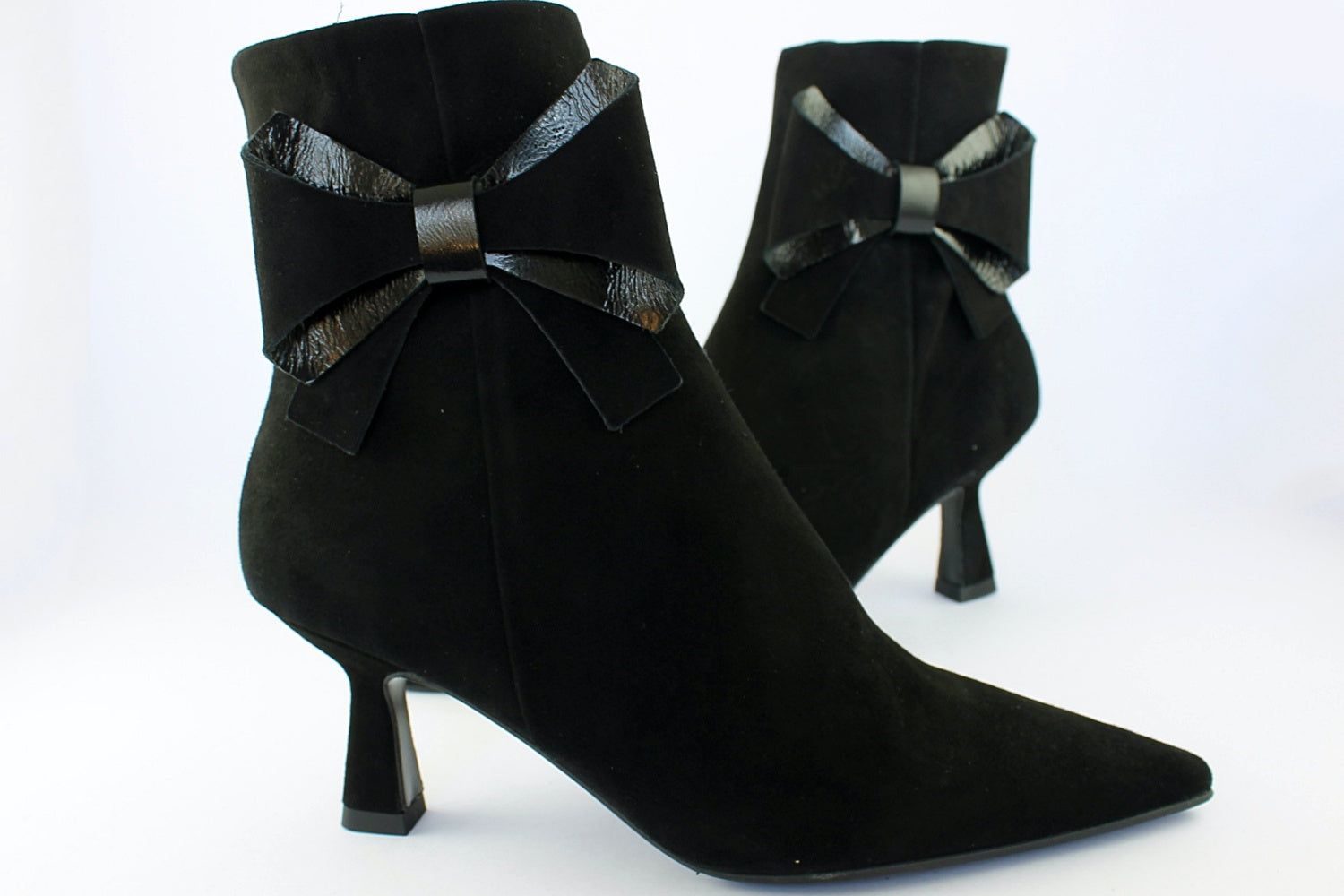 Marian's 'Cassie' is a mid-high heeled ankle boot in Black suede, with a suede and leather bow detail to the side. It has a pointed toe for added elegance and a zip for ease. No running, for graceful gliding only.