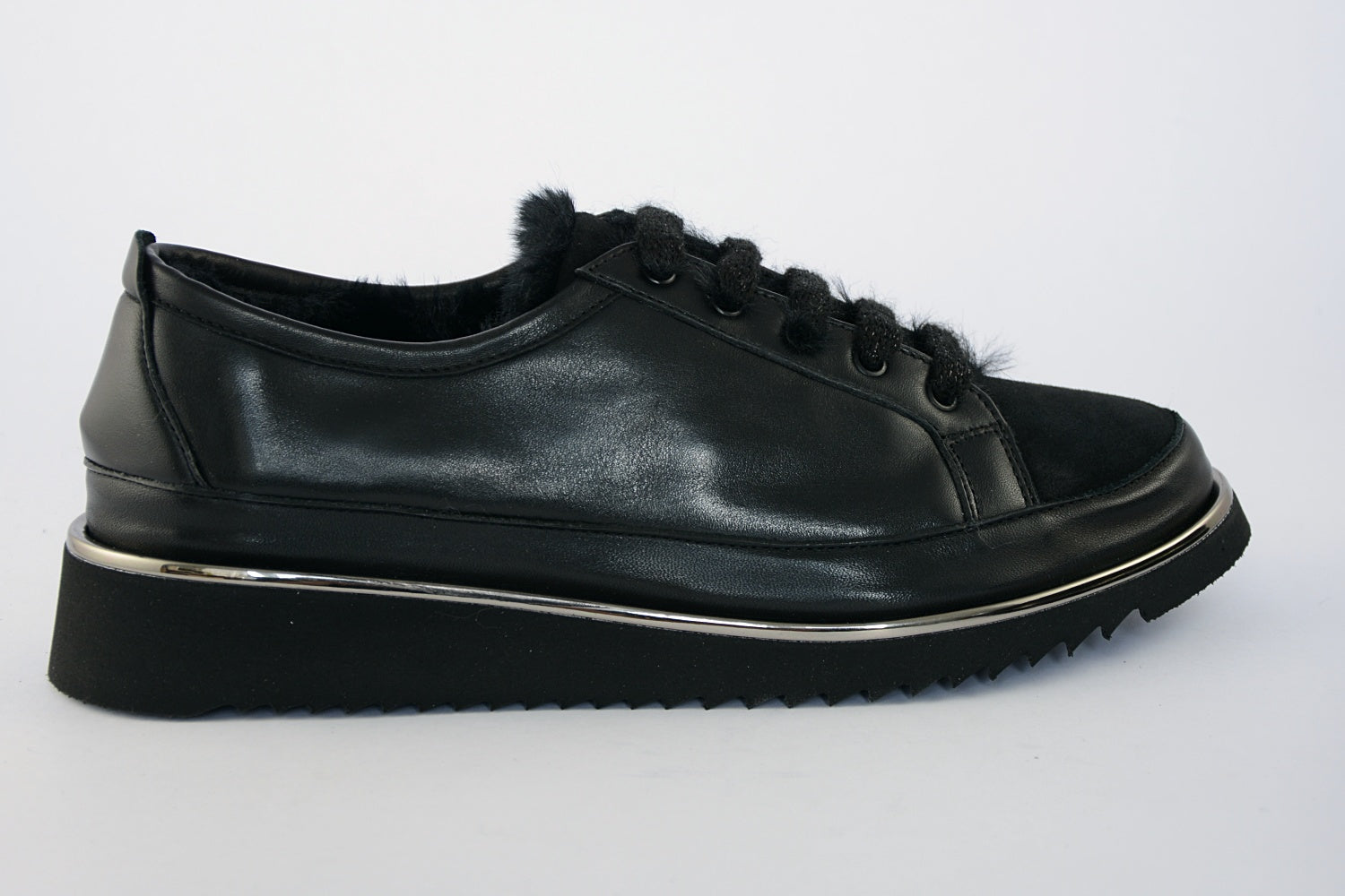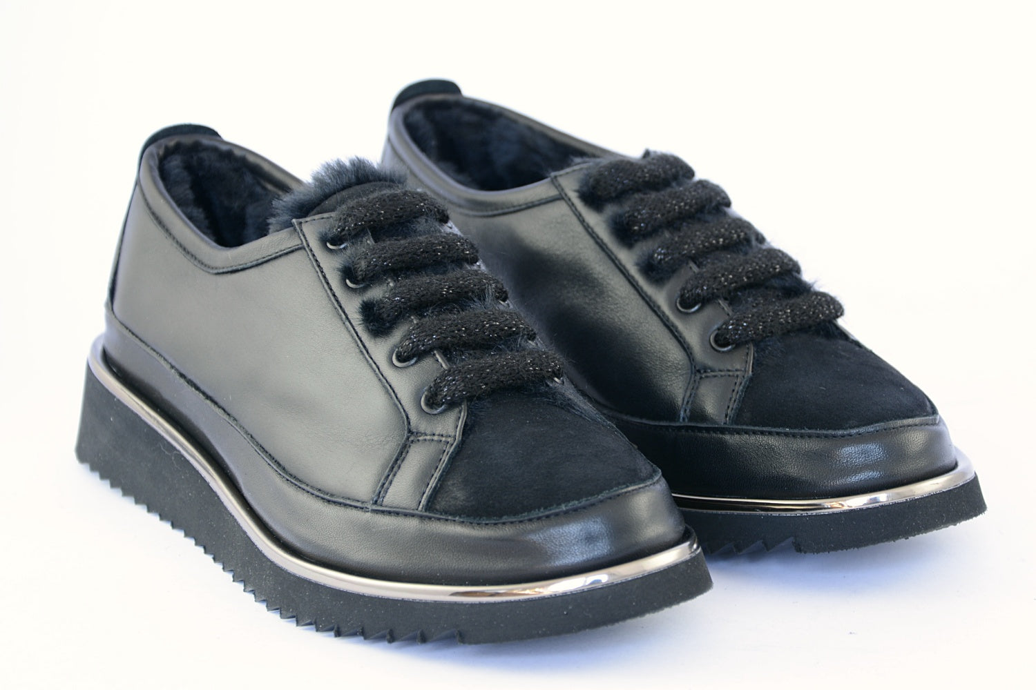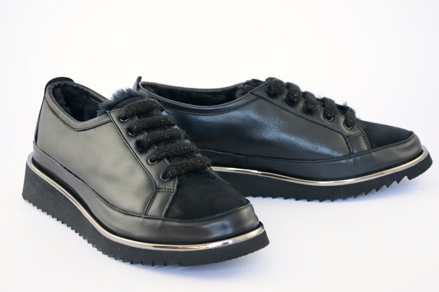 Alexandra 'Sofia' black leather trainers have a black suede toe and a fabulous sheepskin lining. They have black sparkly laces and a silver trim. Low silhouette on a low wedge and leather-lined.